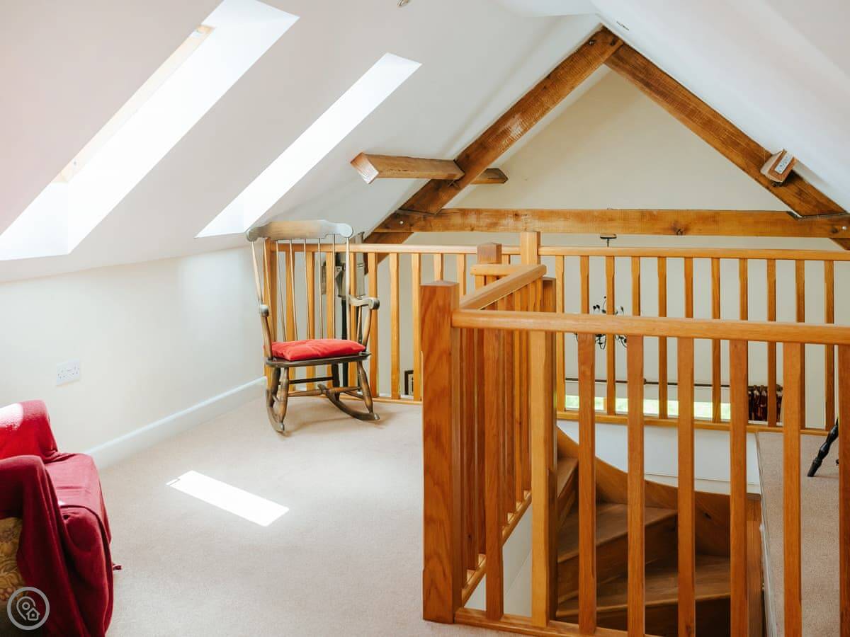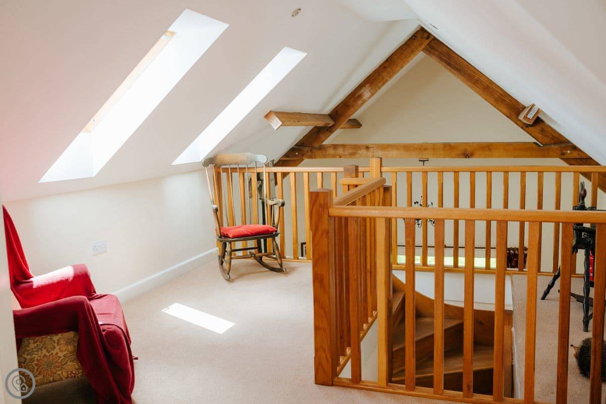 The main living space is open plan, with a high ceiling and a mezzanine lounge area upstairs. There's a log burner for colder nights. The patio doors open straight from the lounge onto the terrace.