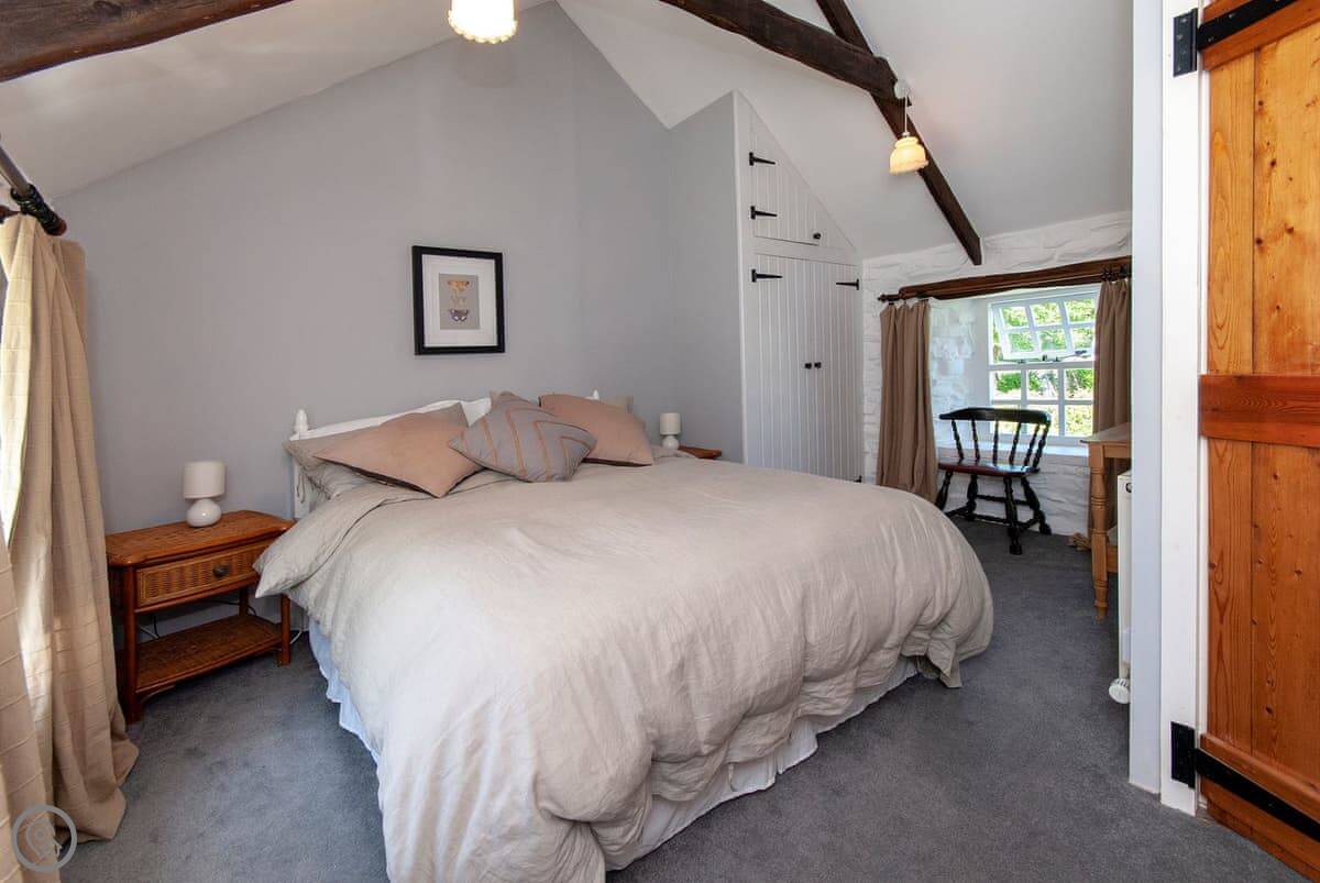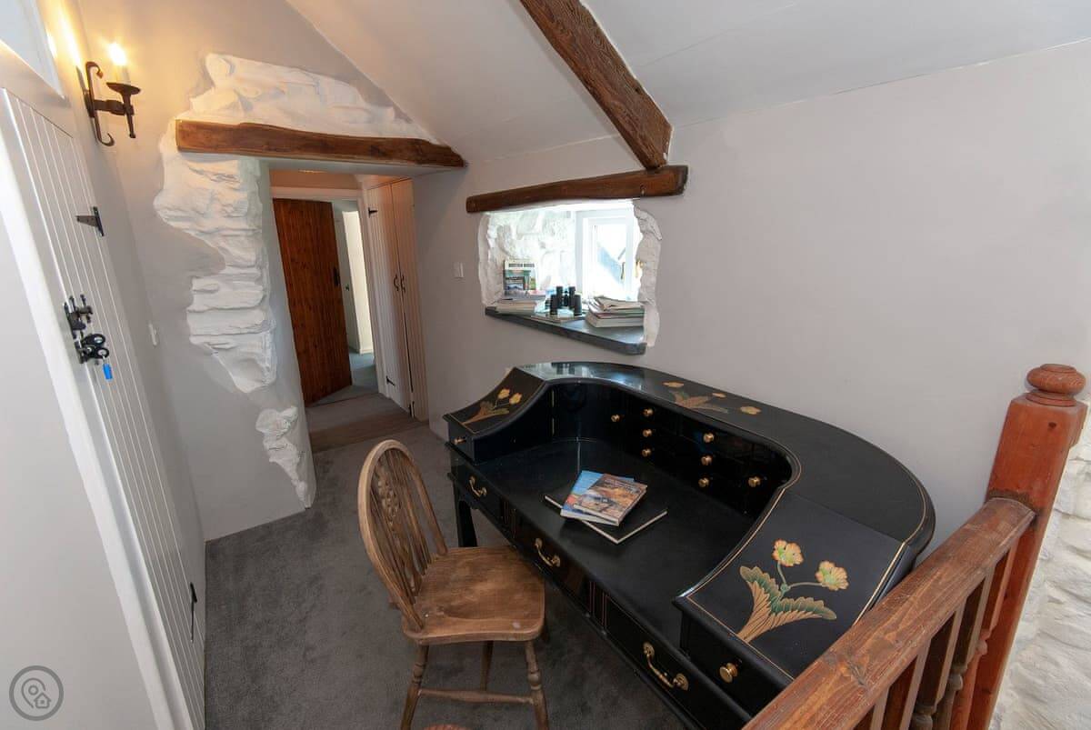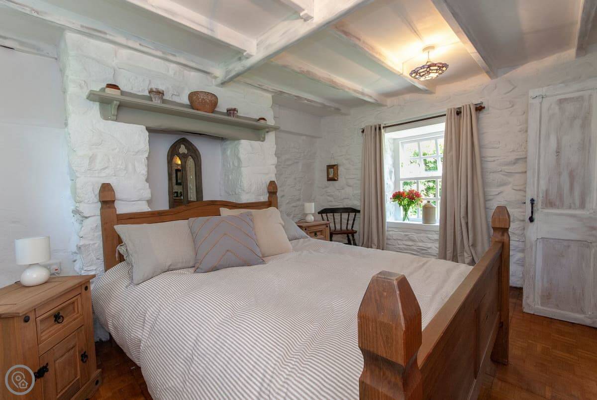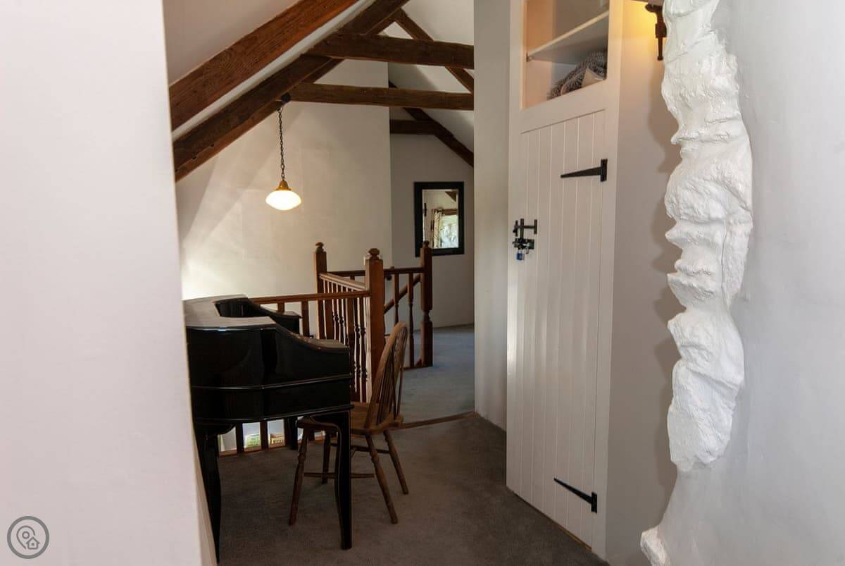 The three well-appointed comfortable bedrooms, with vaulted ceilings and wonderful A-frame beams, promise a good night’s sleep, in simple hushed rooms with quality linen, listen to the gentle sound of birdsong resonating in the still air. Spacious beamed landing with exposed whitewashed stone walls, evoke the history of the cottage, a comfortable chair overlooks the pretty front garden, ideal for escaping to for some quiet time with a good book. Write some postcards or peruse the selection of books available at the writing desk.
