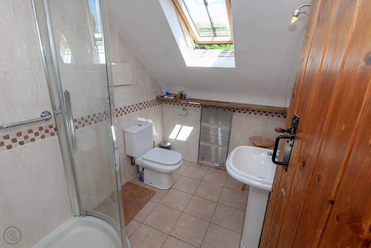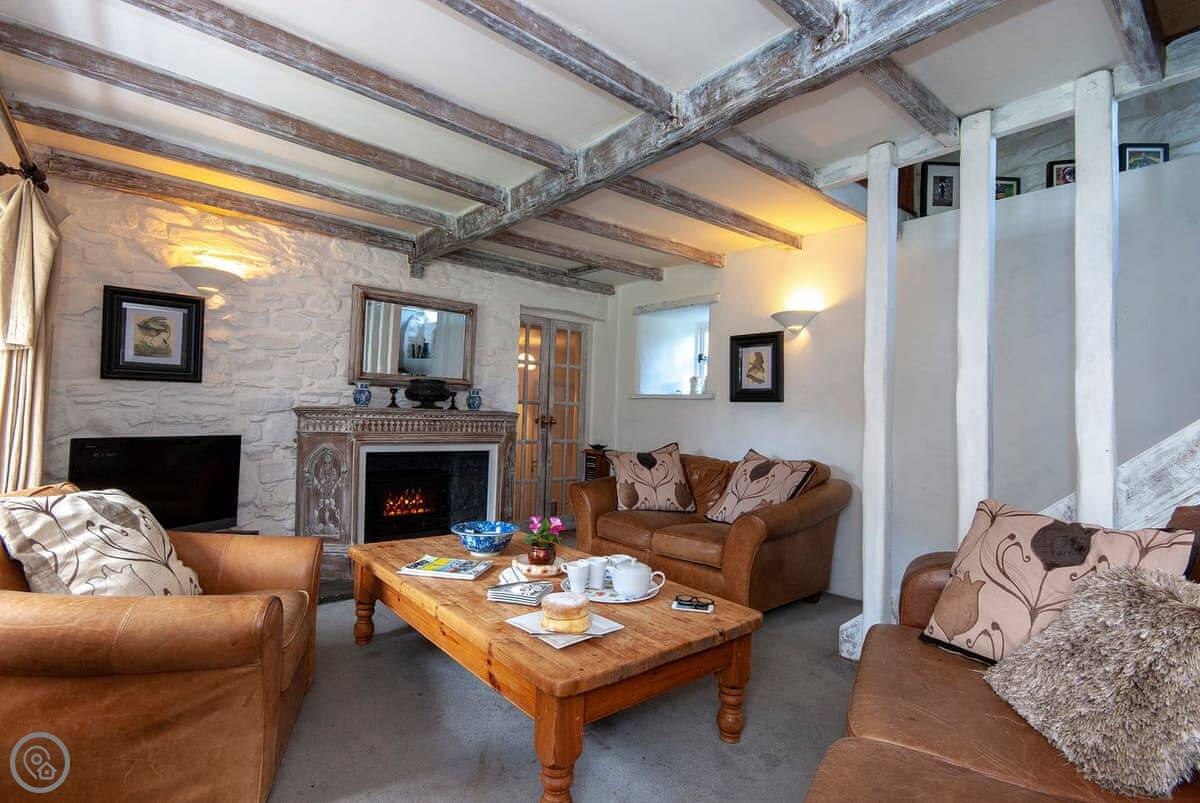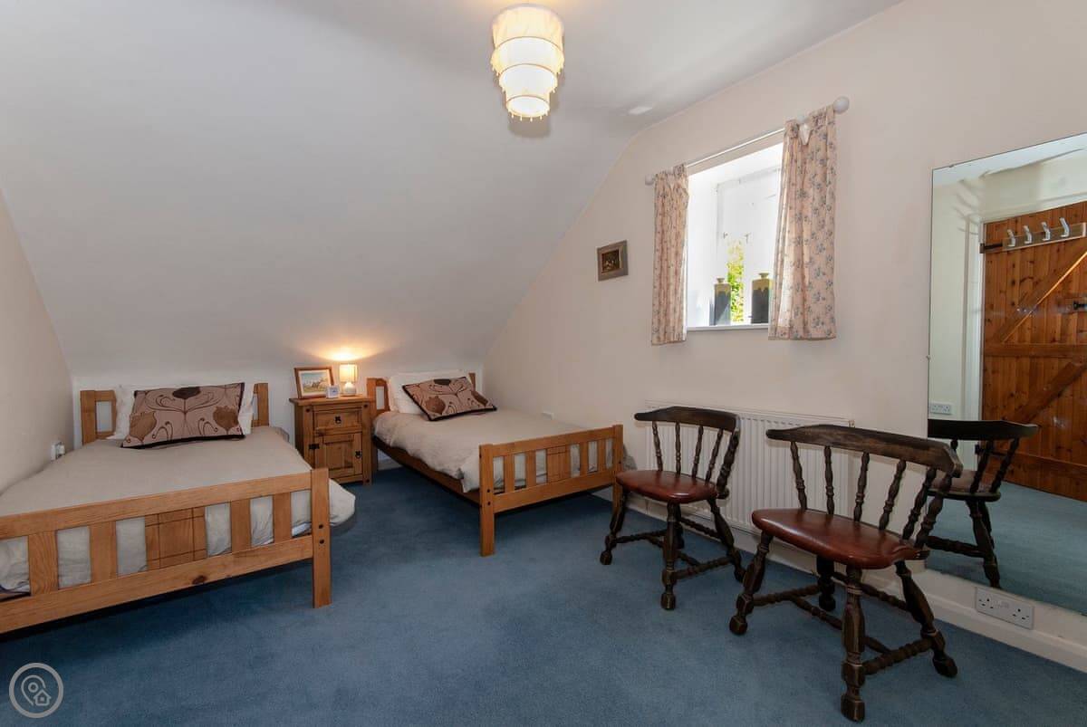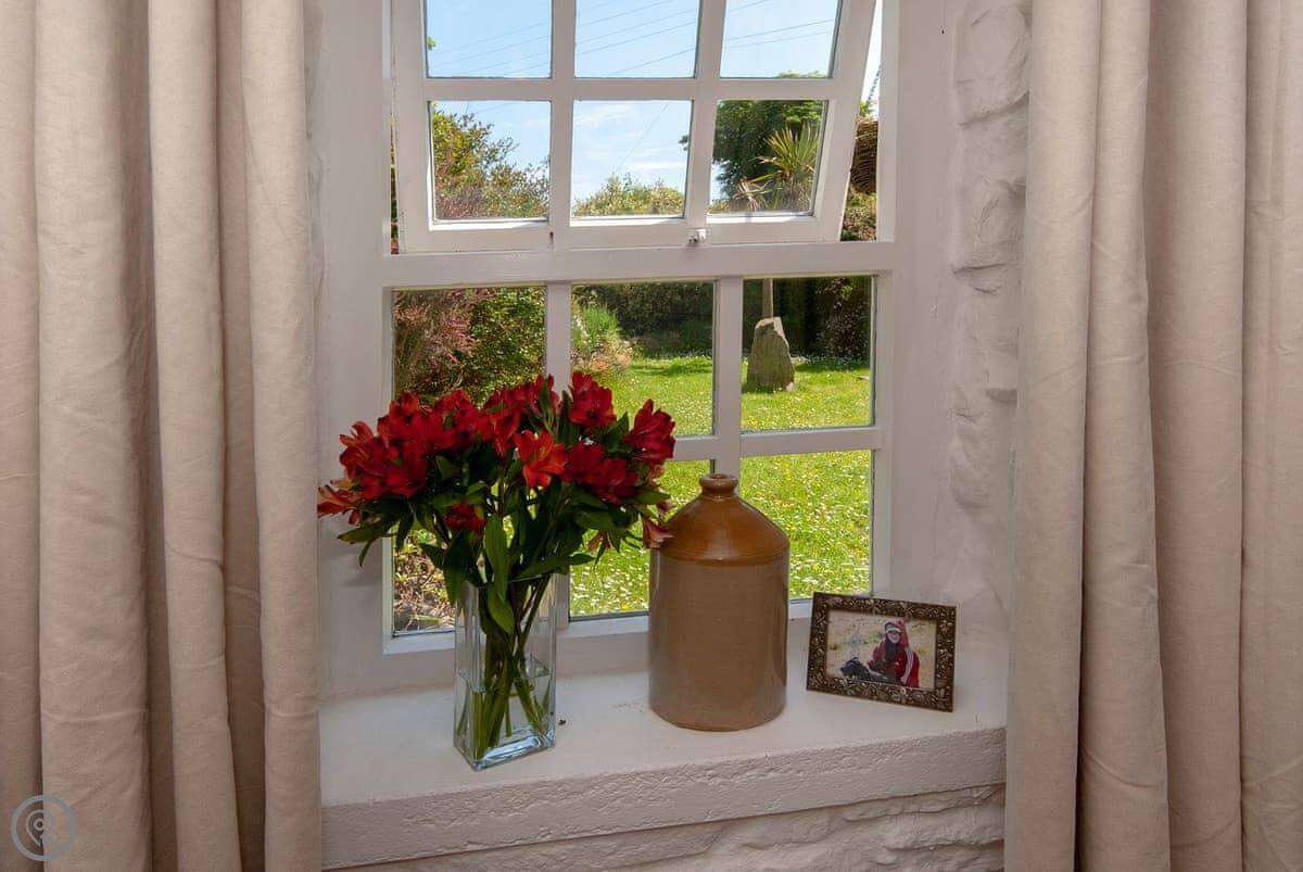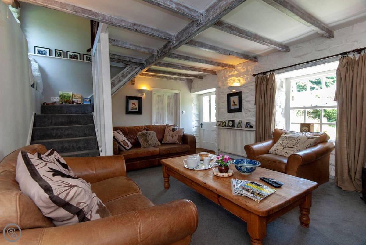 The three well-appointed comfortable bedrooms, with vaulted ceilings and wonderful A-frame beams, promise a good night’s sleep, in simple hushed rooms with quality linen, listen to the gentle sound of birdsong resonating in the still air. Spacious beamed landing with exposed whitewashed stone walls, evoke the history of the cottage, a comfortable chair overlooks the pretty front garden, ideal for escaping to for some quiet time with a good book. Write some postcards or peruse the selection of books available at the writing desk.