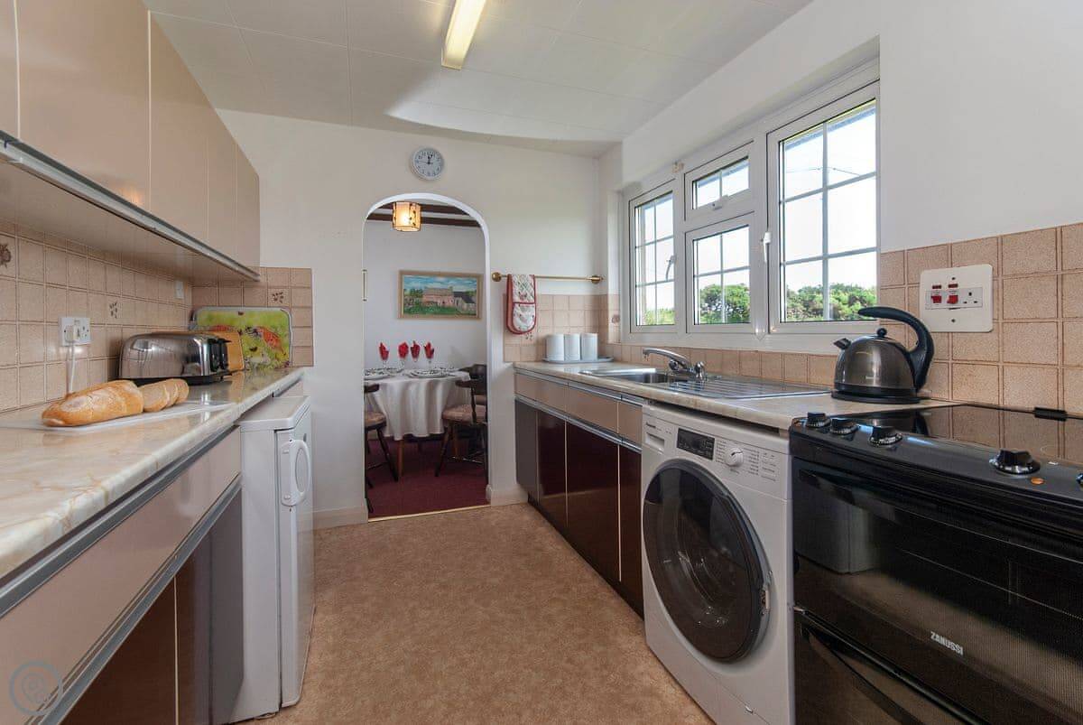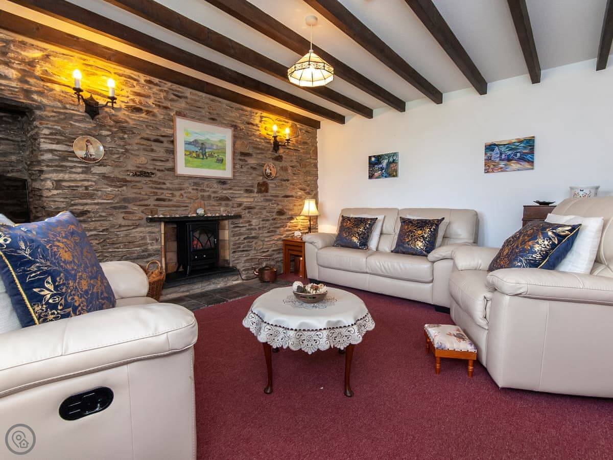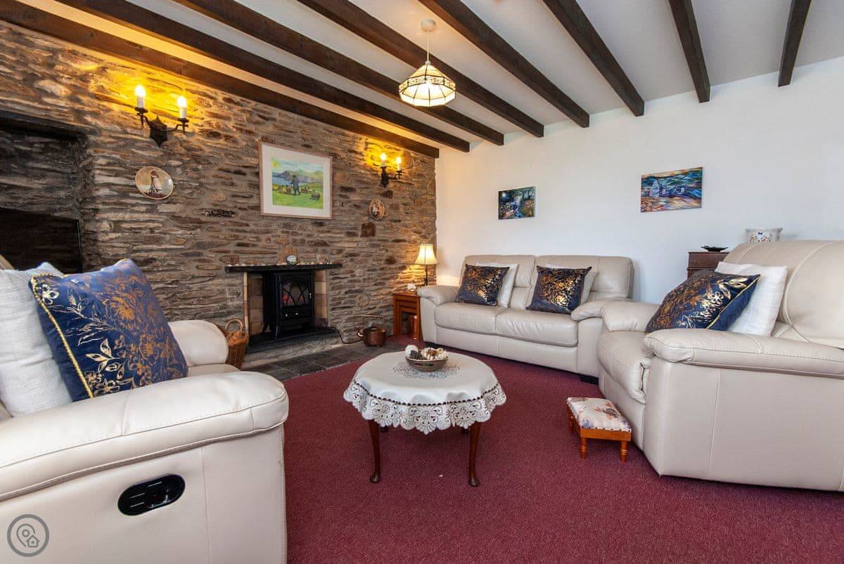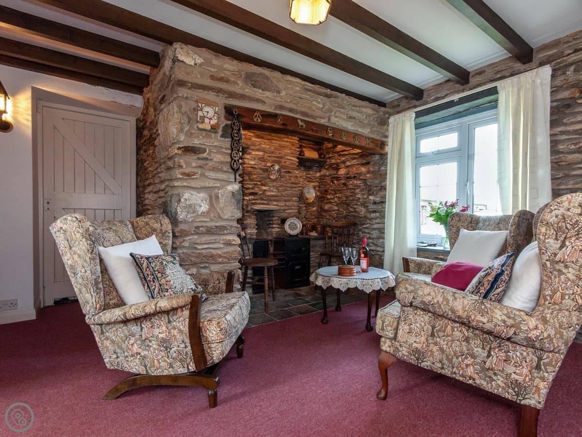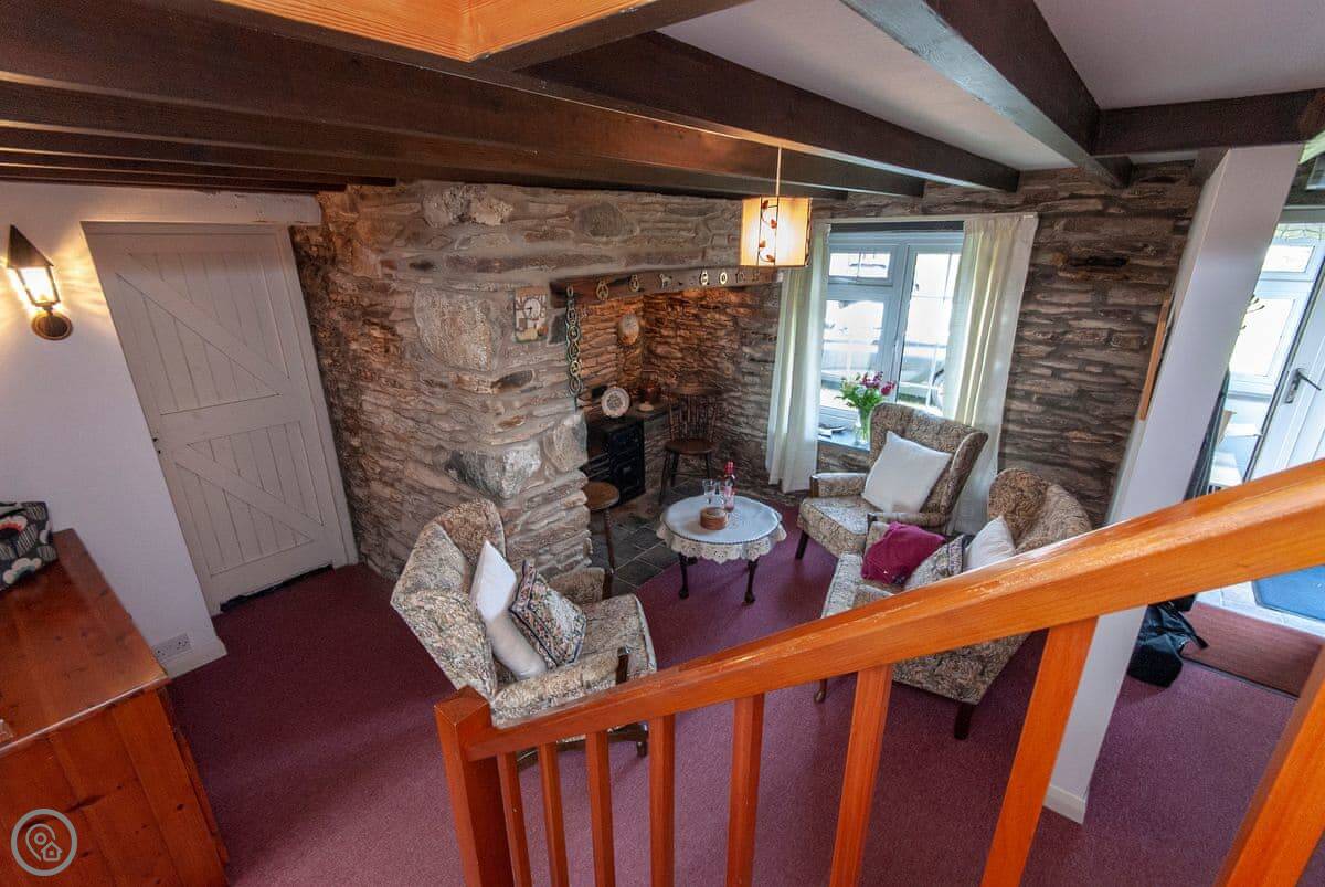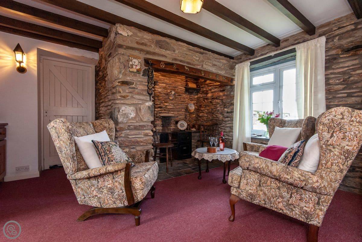 The cottage is old, so there are beams and stone walls. There's an inglenook fireplace in one of the living rooms with the original range still in it, though you can't use it. The other sitting room has the TV. The kitchen is a galley style. It works.