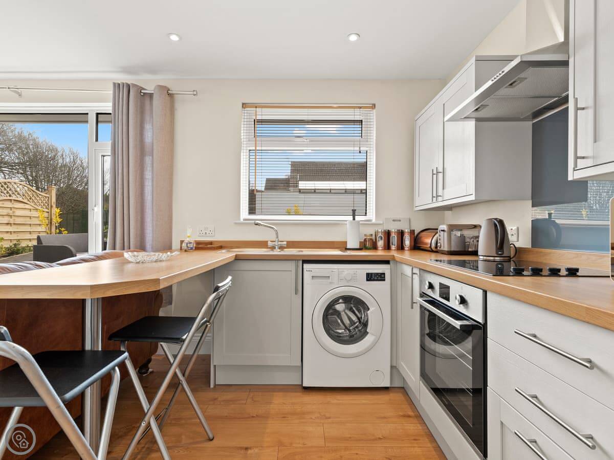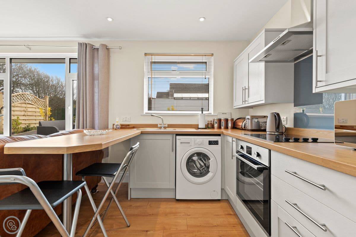 Inside, it's open plan downstairs. There's a TV and WiFi. The kitchen has a washing machine. Bedding and towels are included. Parking is on-site, which is a big help around here.