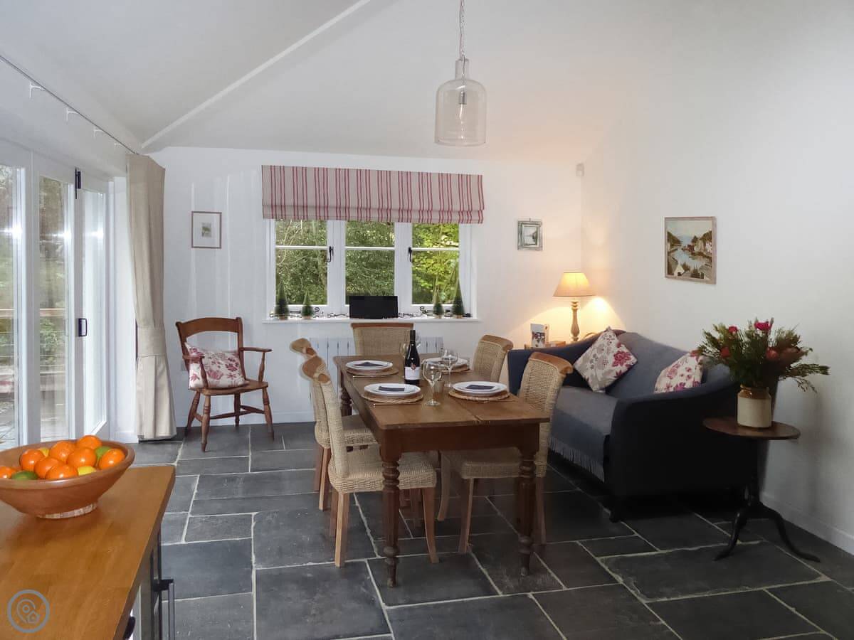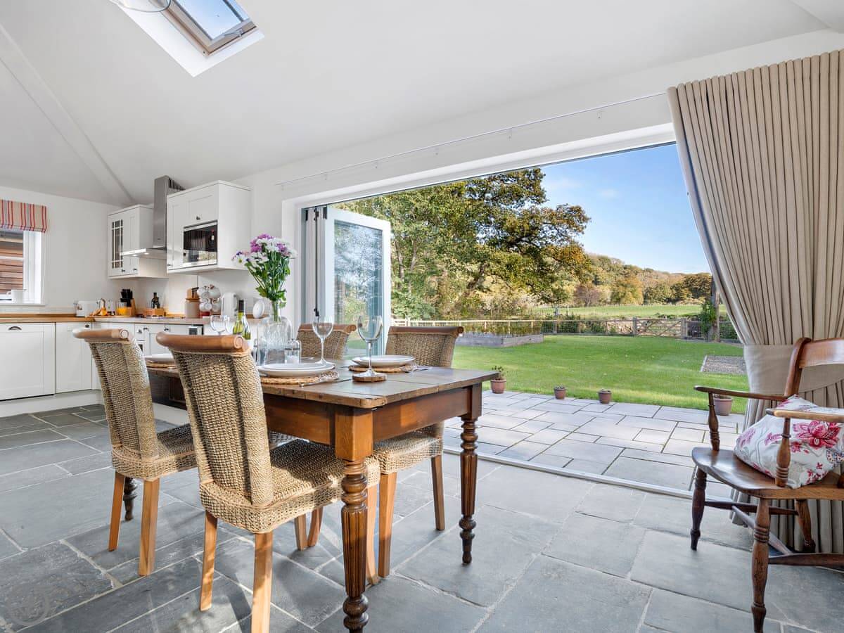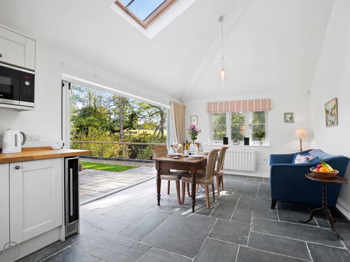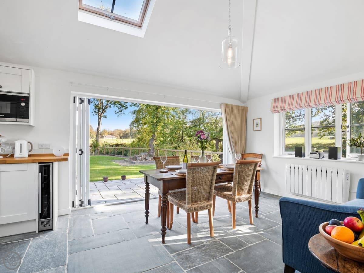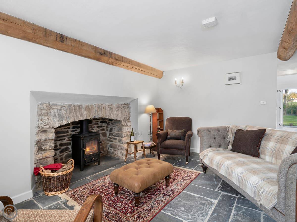 The light and airy dining room is conveniently open plan to the kitchen, flooded by sunlight through the bi-folding doors, with beautiful pastoral views of the garden and meadows. Around the dining table enjoy family meals together or chat to the holiday chef as they cook up a holiday feast in the well-equipped stylish cottage kitchen. The beamed cottage sitting room has timeless appeal. Relax on the comfortable sofa after a day in the pure Welsh air, in the glow of the cosy wood burner on chillier evenings.