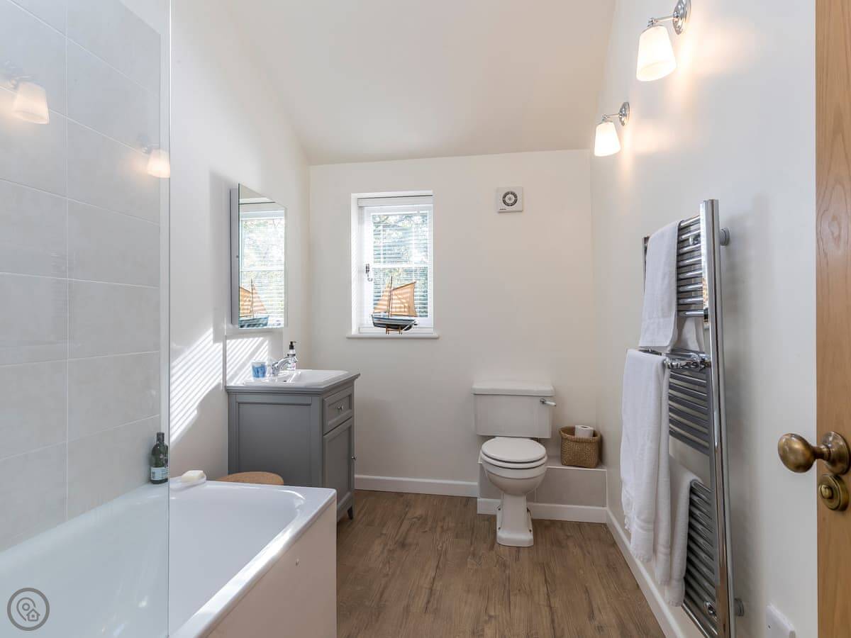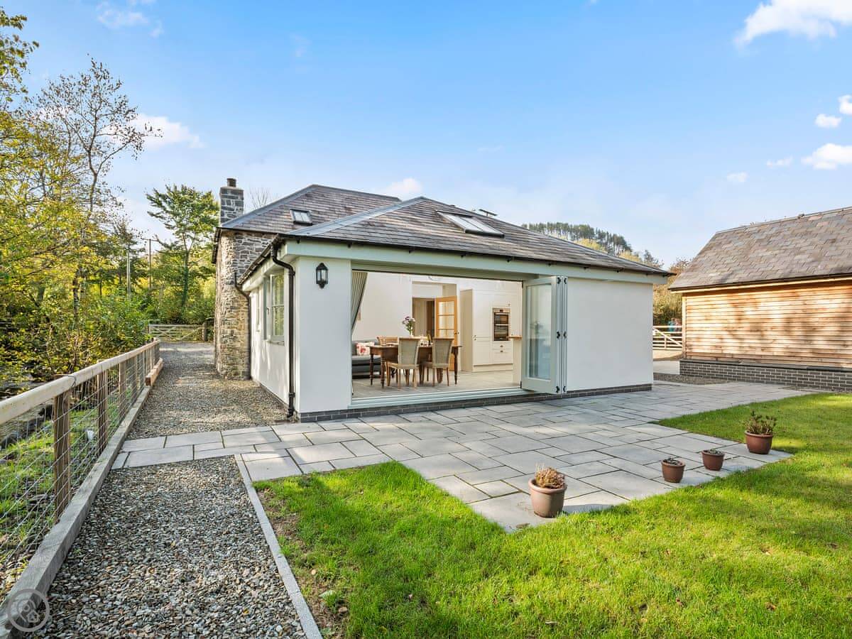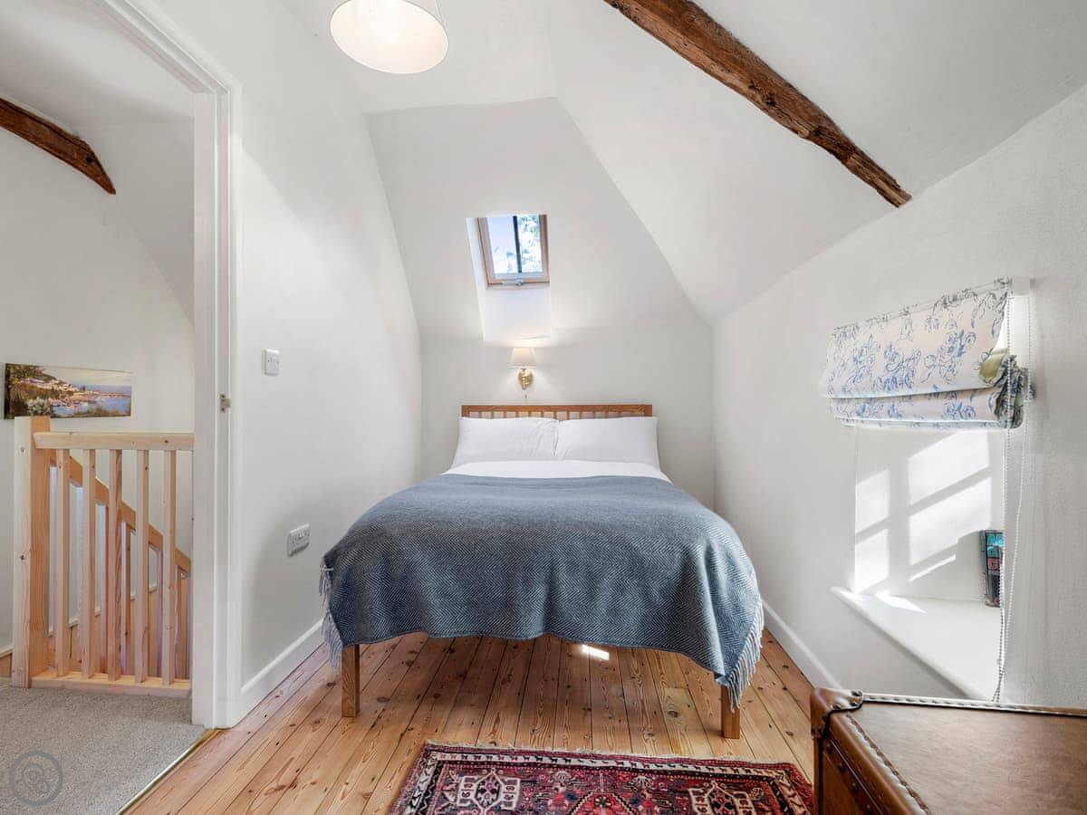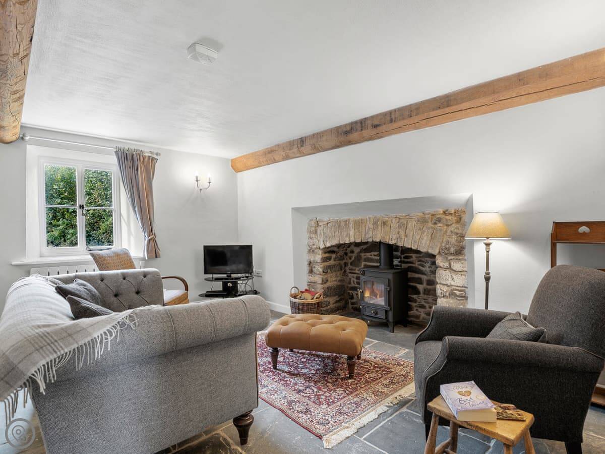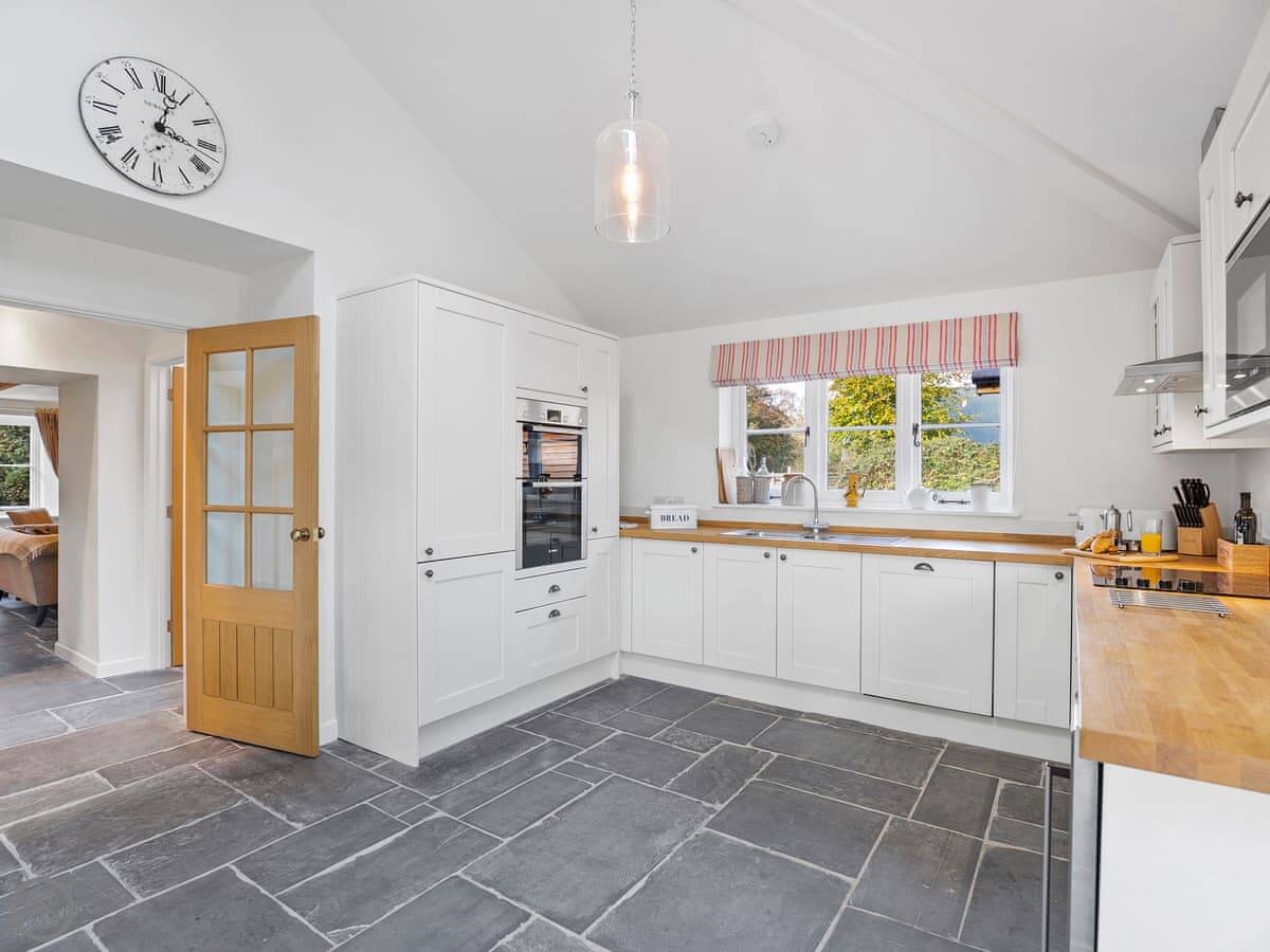 The light and airy dining room is conveniently open plan to the kitchen, flooded by sunlight through the bi-folding doors, with beautiful pastoral views of the garden and meadows. Around the dining table enjoy family meals together or chat to the holiday chef as they cook up a holiday feast in the well-equipped stylish cottage kitchen. The beamed cottage sitting room has timeless appeal. Relax on the comfortable sofa after a day in the pure Welsh air, in the glow of the cosy wood burner on chillier evenings.