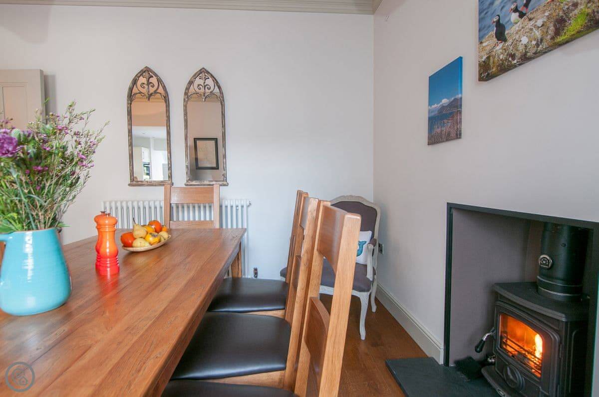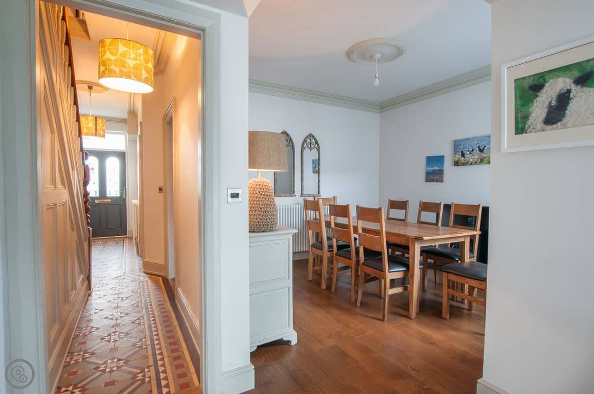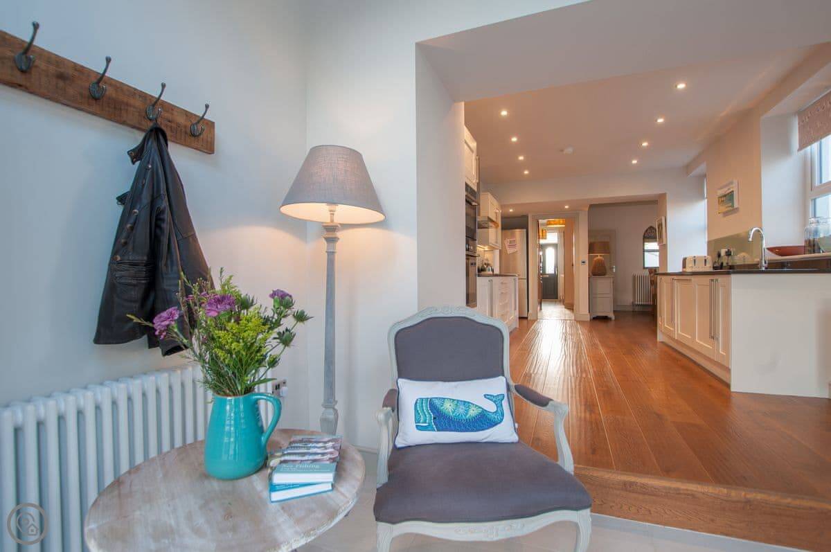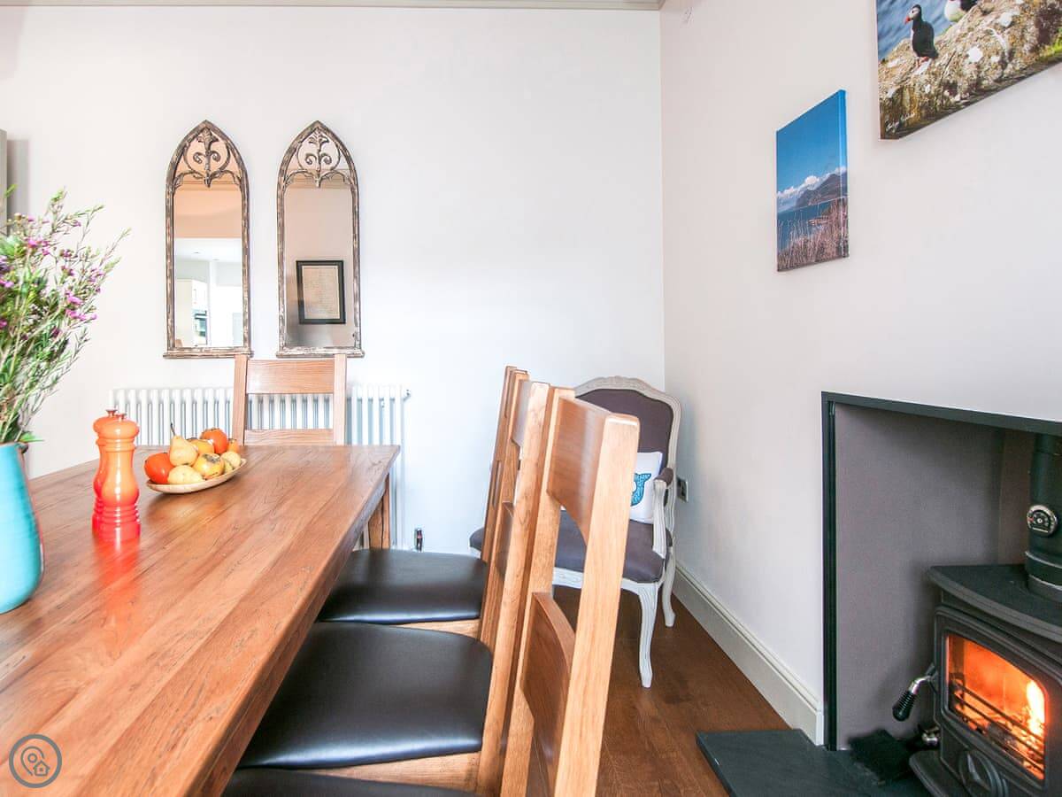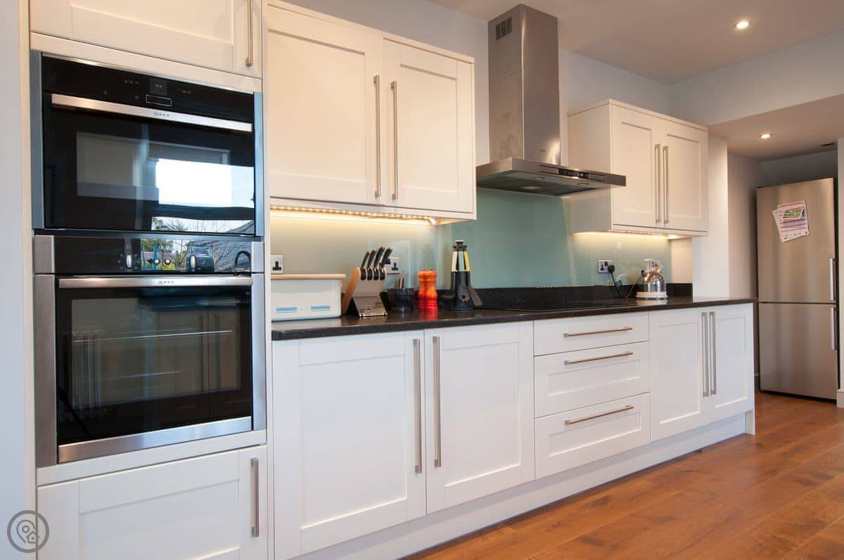 Renovated to perfection without losing its Edwardian personality. Painted throughout in pale grey and white making a perfect backdrop for the textures and fabrics. The matt pale grey furnishings give a Scandinavian undertone which enhances the warmth of the muted aquamarine, yellow and blue cushions and throws. The cosy and comfortable living room has deep leather couches and vibrant pictures of the locality. Enjoy fun and laughter over long indulgent meals in the cosy dining room with the fire crackling in the wood burner. The dining room opens out onto the large white kitchen, convenient for keeping an eye on the designated chef! An extremely well-equipped kitchen with plenty of worktop areas to please the most discerning gourmet cook, this spacious room is flooded with light from the floor to ceiling patio doors which lead out into the garden. Just off the kitchen is the separate toilet which has a special dog shower to wash off muddy little paws after a busy day in the sand.