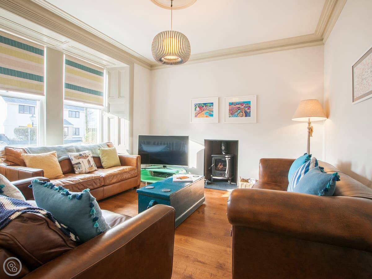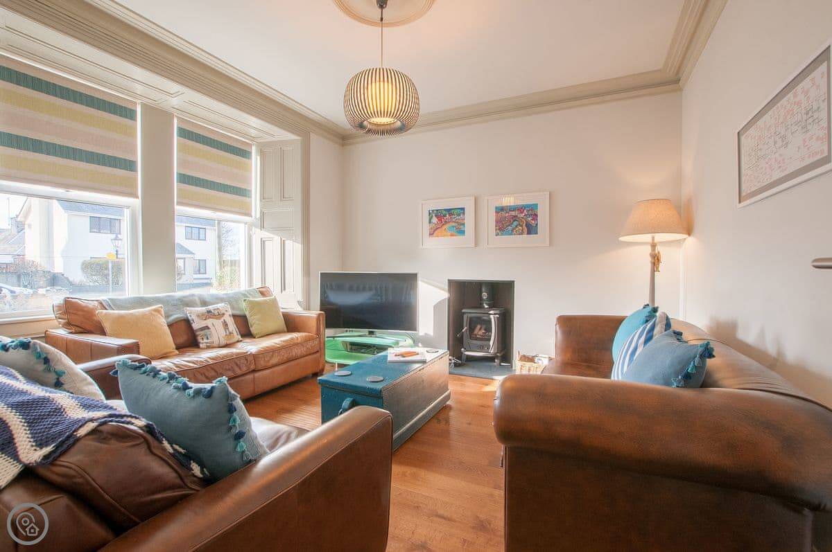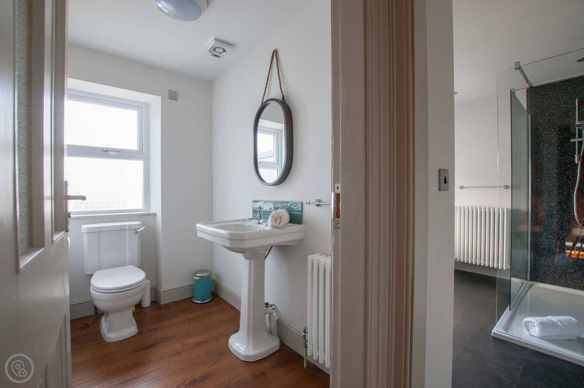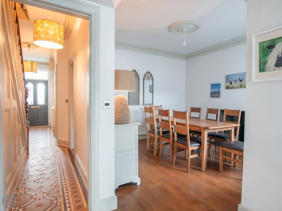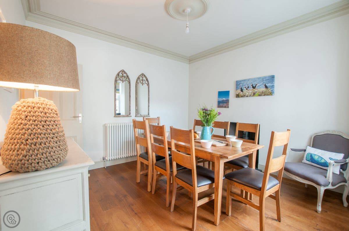 Renovated to perfection without losing its Edwardian personality. Painted throughout in pale grey and white making a perfect backdrop for the textures and fabrics. The matt pale grey furnishings give a Scandinavian undertone which enhances the warmth of the muted aquamarine, yellow and blue cushions and throws. The cosy and comfortable living room has deep leather couches and vibrant pictures of the locality. Enjoy fun and laughter over long indulgent meals in the cosy dining room with the fire crackling in the wood burner. The dining room opens out onto the large white kitchen, convenient for keeping an eye on the designated chef! An extremely well-equipped kitchen with plenty of worktop areas to please the most discerning gourmet cook, this spacious room is flooded with light from the floor to ceiling patio doors which lead out into the garden. Just off the kitchen is the separate toilet which has a special dog shower to wash off muddy little paws after a busy day in the sand.