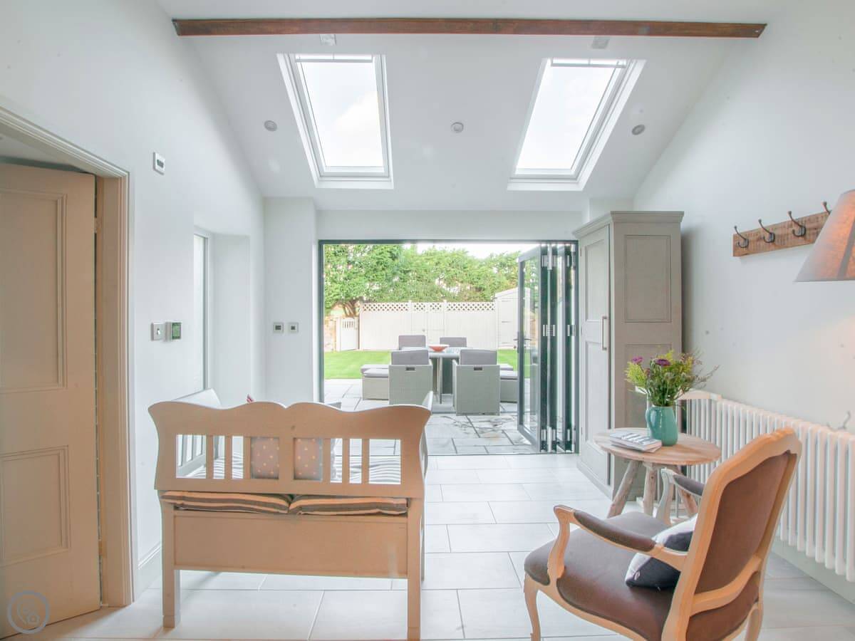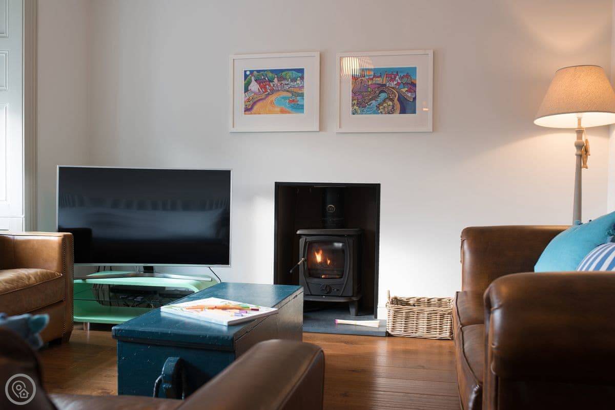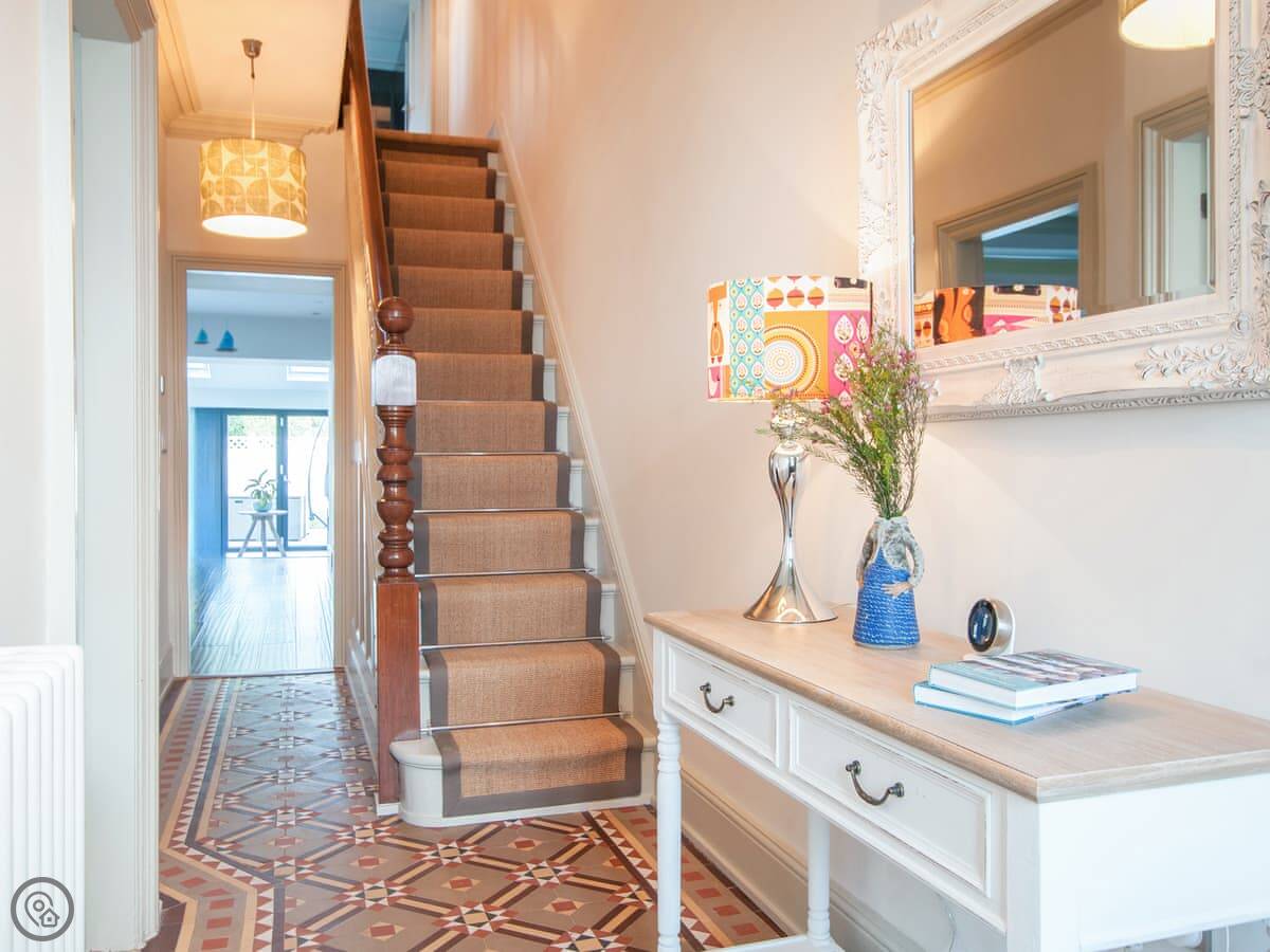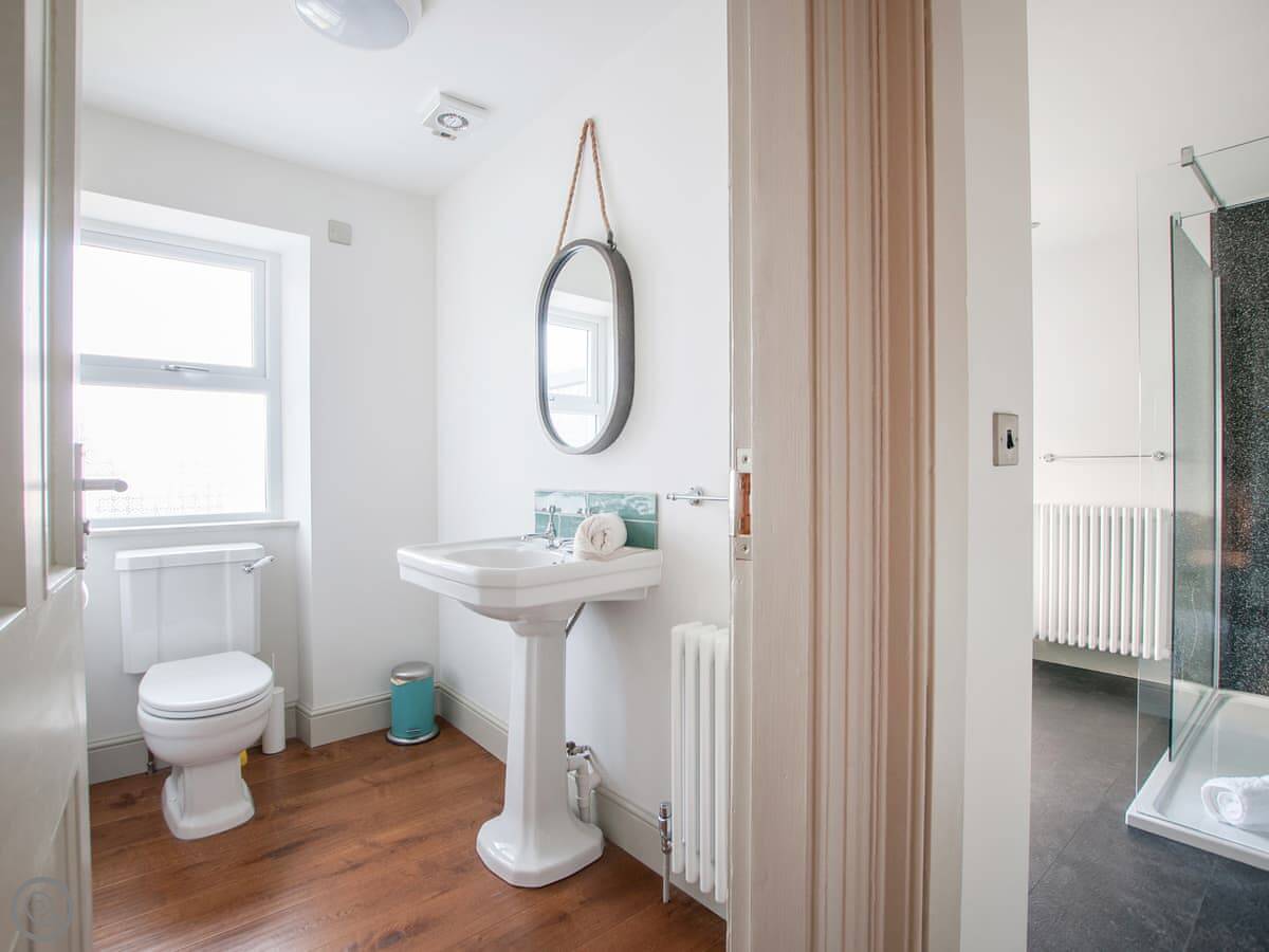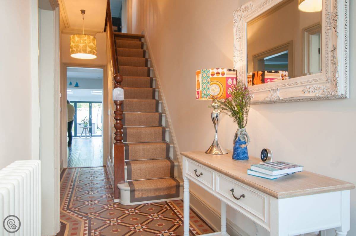 Renovated to perfection without losing its Edwardian personality. Painted throughout in pale grey and white making a perfect backdrop for the textures and fabrics. The matt pale grey furnishings give a Scandinavian undertone which enhances the warmth of the muted aquamarine, yellow and blue cushions and throws. The cosy and comfortable living room has deep leather couches and vibrant pictures of the locality. Enjoy fun and laughter over long indulgent meals in the cosy dining room with the fire crackling in the wood burner. The dining room opens out onto the large white kitchen, convenient for keeping an eye on the designated chef! An extremely well-equipped kitchen with plenty of worktop areas to please the most discerning gourmet cook, this spacious room is flooded with light from the floor to ceiling patio doors which lead out into the garden. Just off the kitchen is the separate toilet which has a special dog shower to wash off muddy little paws after a busy day in the sand.