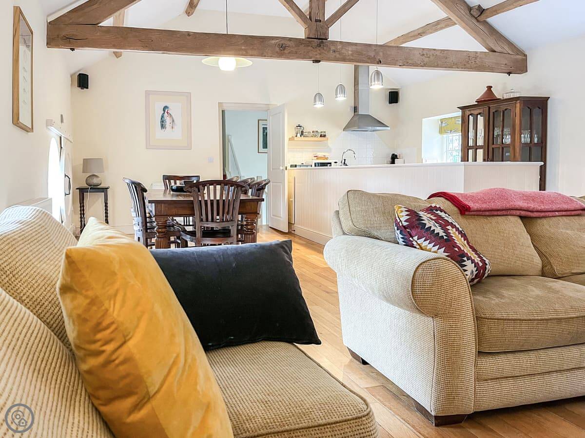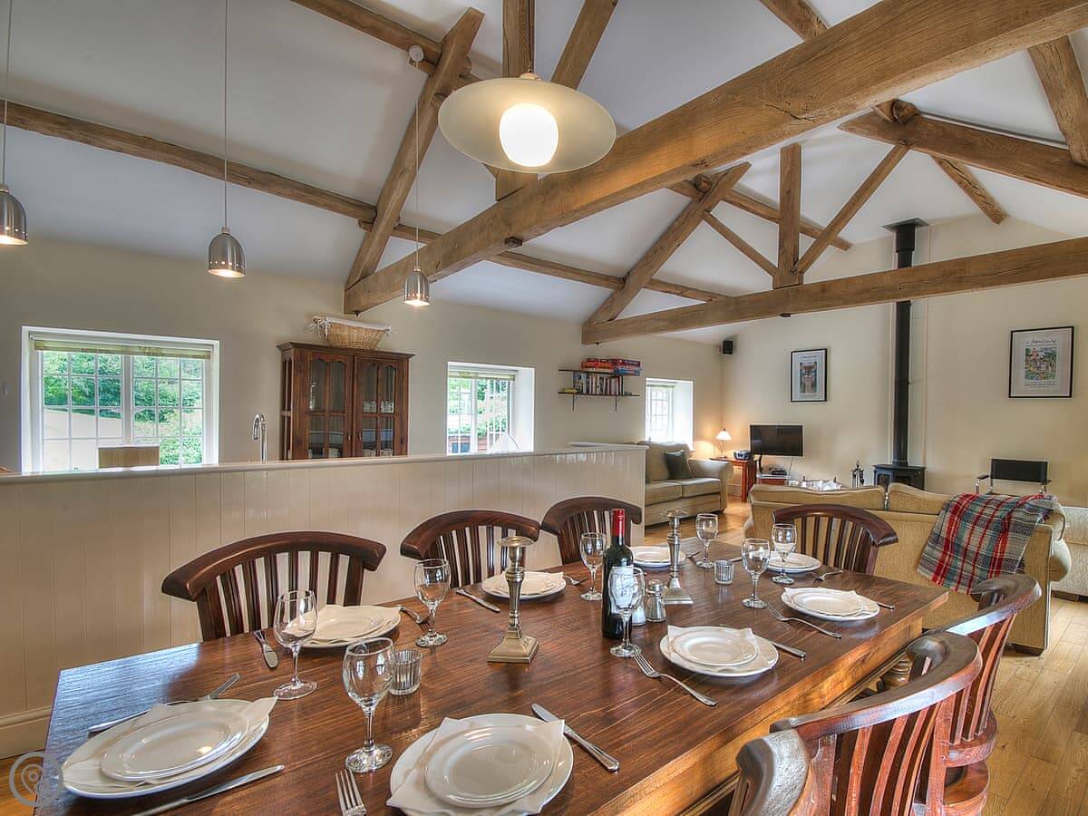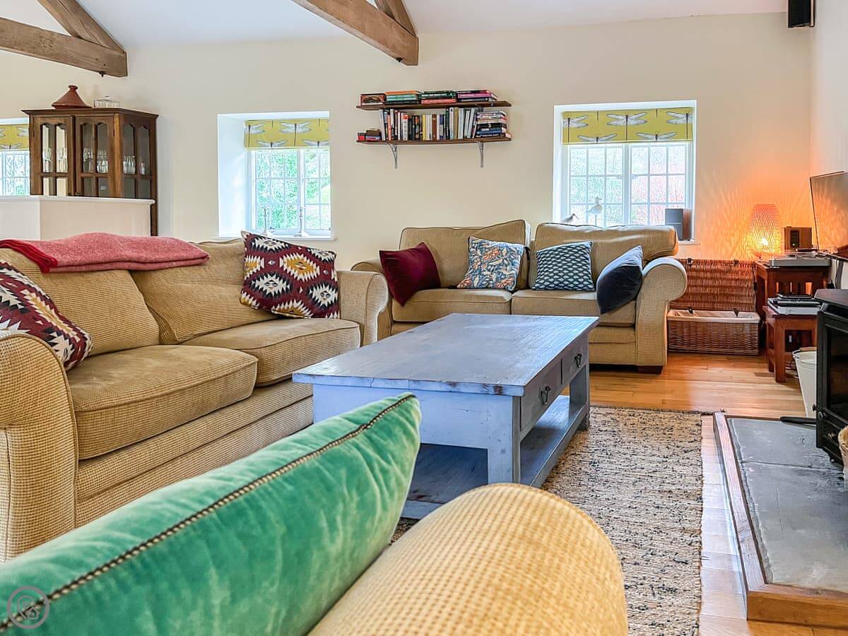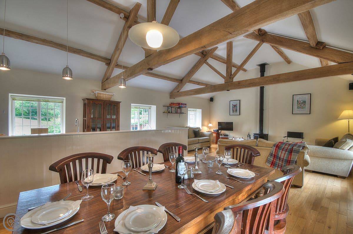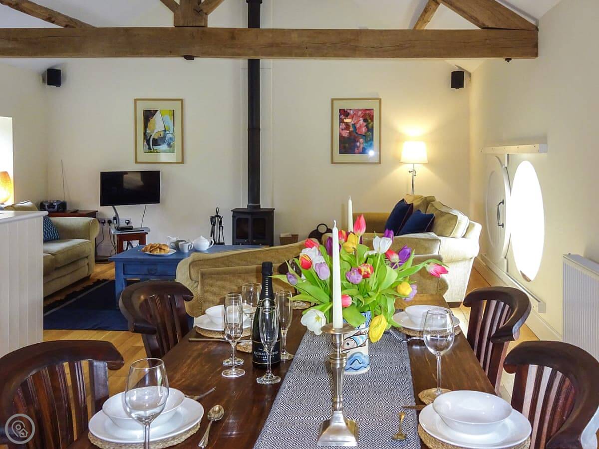 There is a beautiful double aspect living dining kitchen area with views across the gardens to one side and over the listed cobbled courtyard to the other. A record player with a collection of old vinyl and blue tooth speakers makes for a great evening relaxing around the wood burner on the 3 large sofas. A dining table to seat 8 and a spacious kitchen area all make for a great entertaining space.