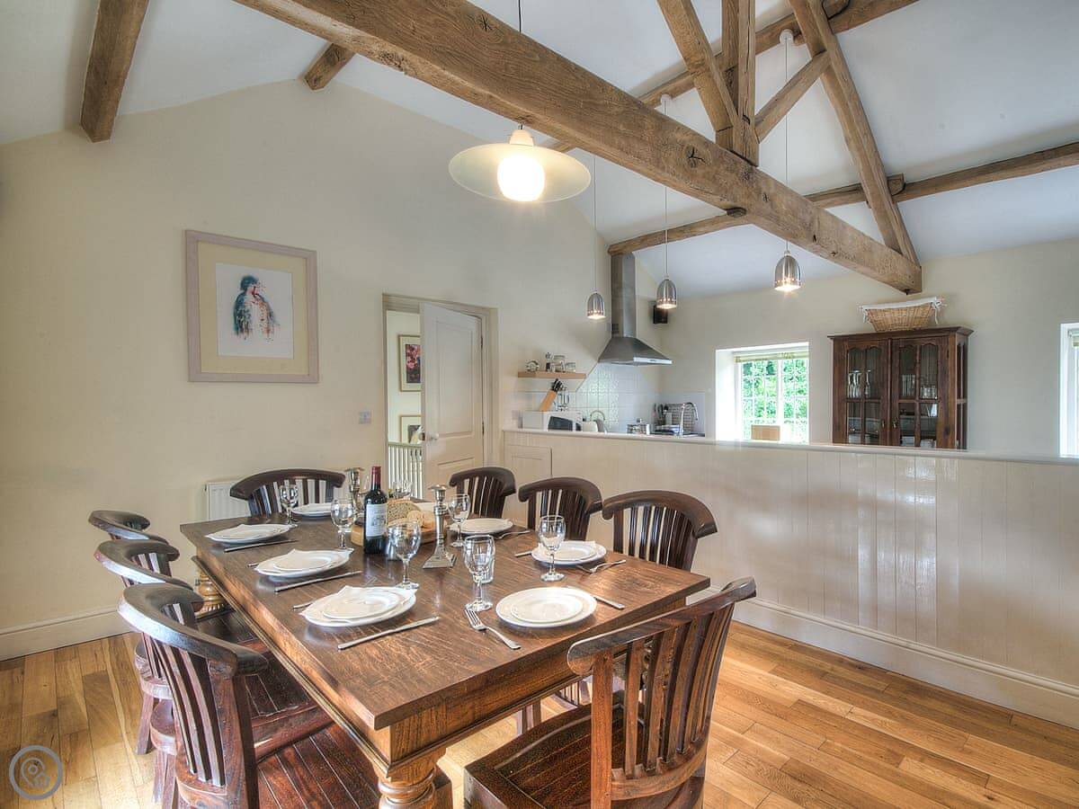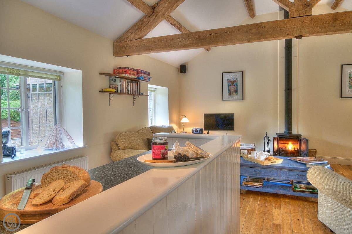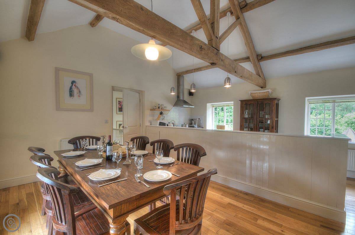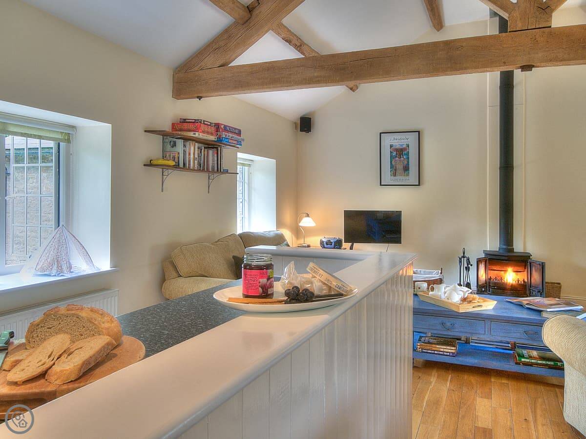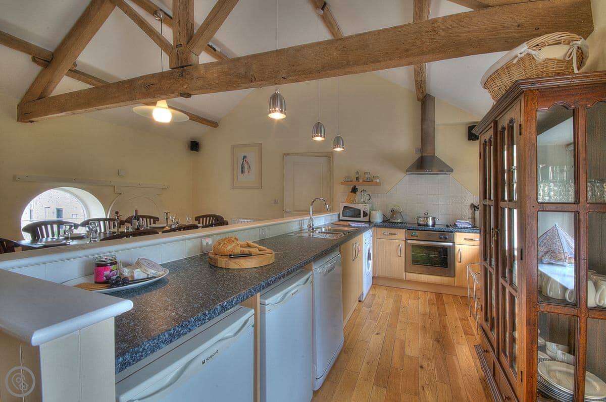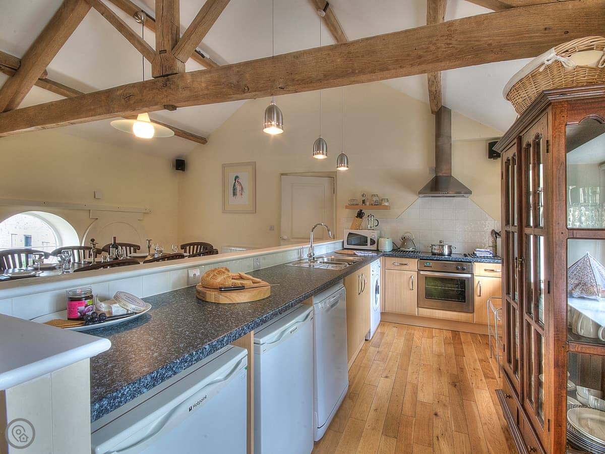 There is a beautiful double aspect living dining kitchen area with views across the gardens to one side and over the listed cobbled courtyard to the other. A record player with a collection of old vinyl and blue tooth speakers makes for a great evening relaxing around the wood burner on the 3 large sofas. A dining table to seat 8 and a spacious kitchen area all make for a great entertaining space.