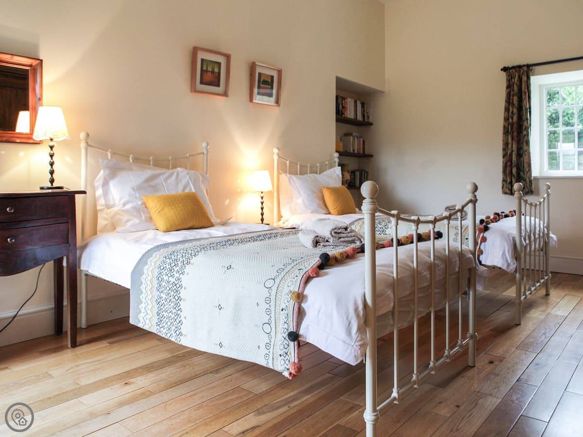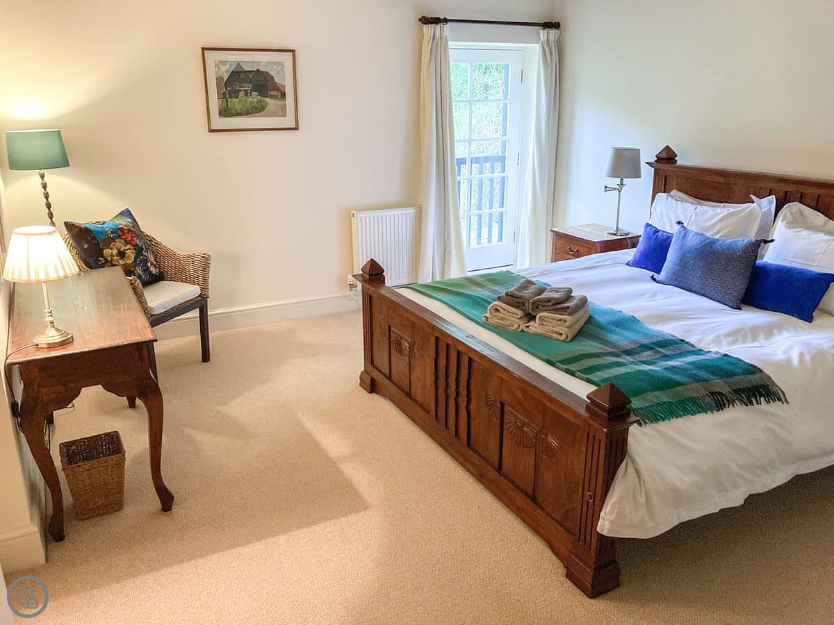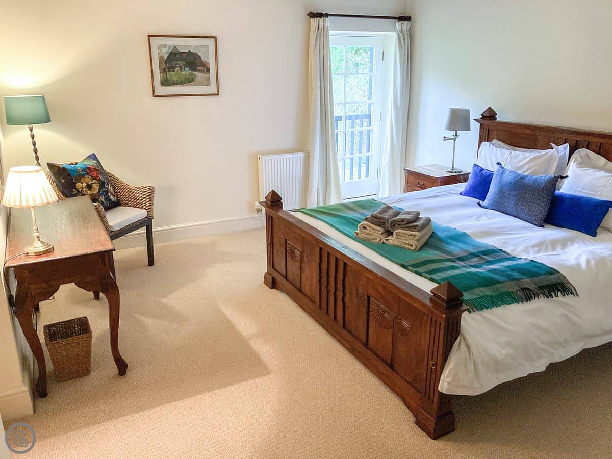 Accessed via a further set of stairs the two upstairs bedrooms are very peaceful are adorned with luxury bed linen and glorious oak beams. Bedroom 3 has a full-length window with a Juliette balcony and views across the grounds to fields beyond.
