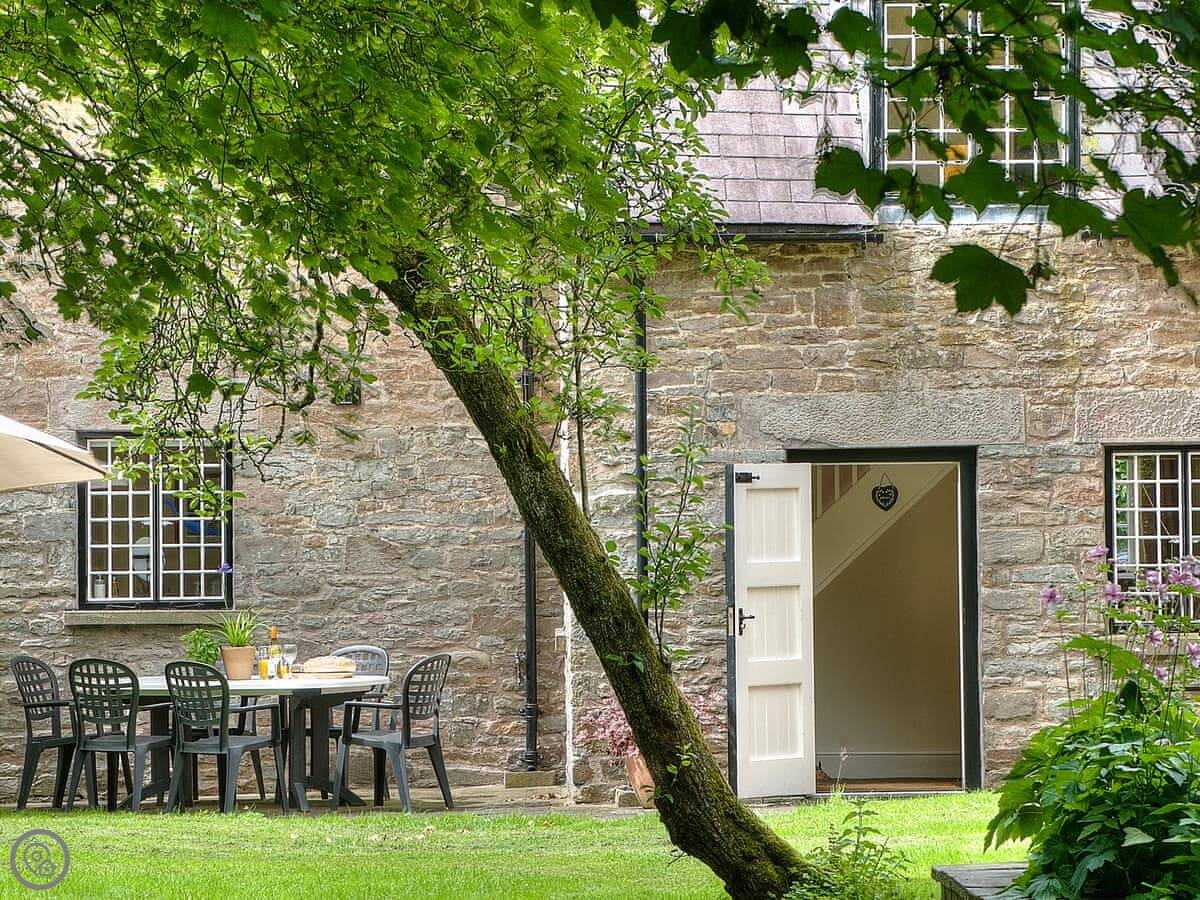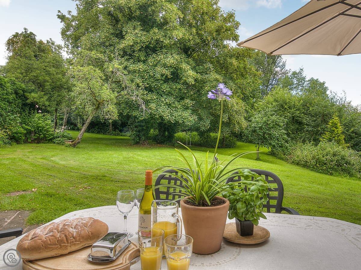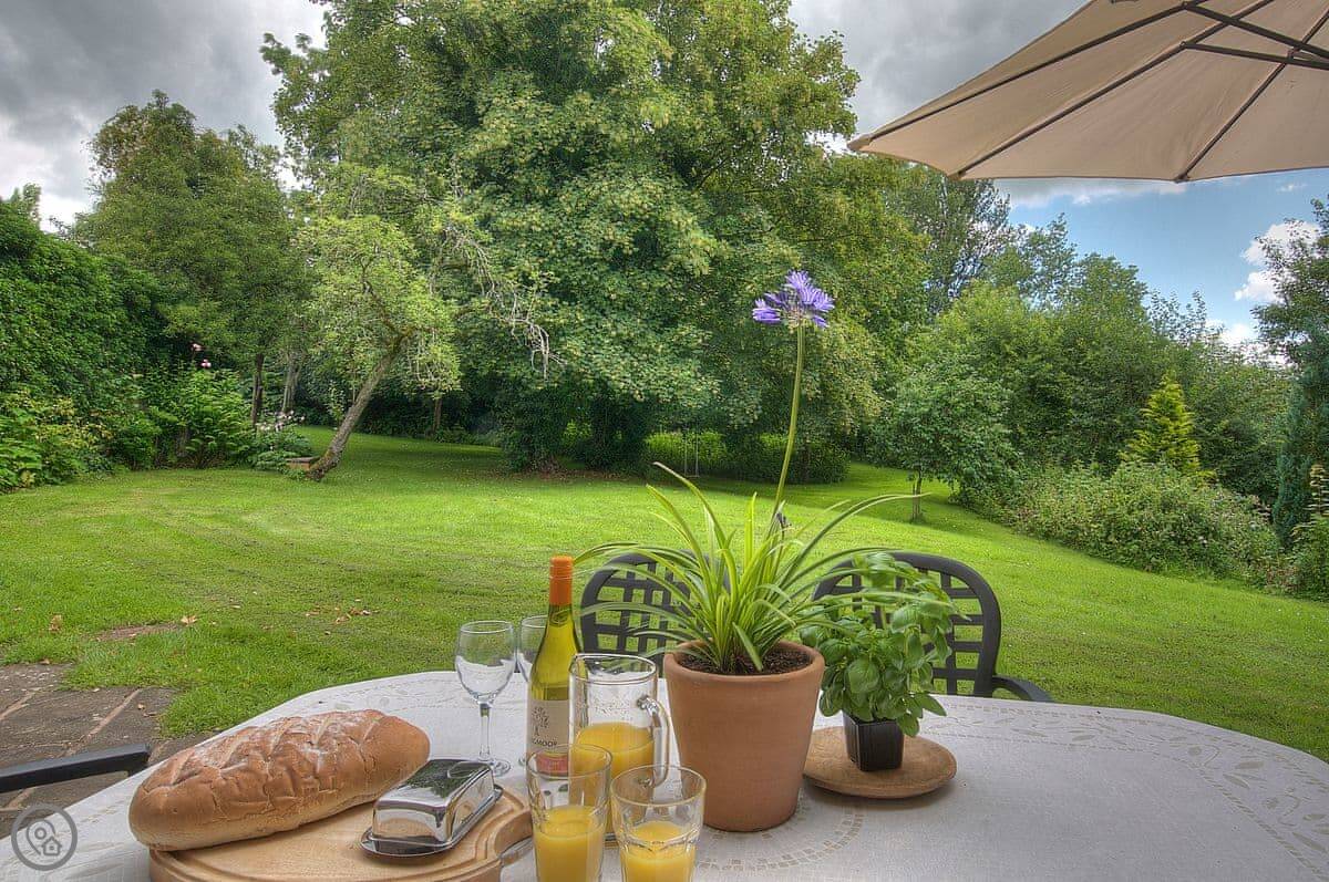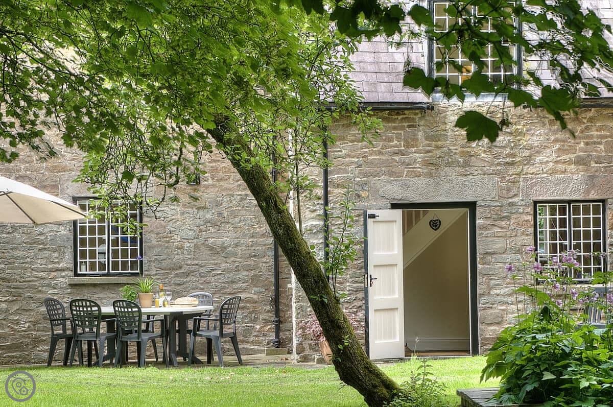 Outside is your own bit of garden with a table and chairs. There's a barbecue. You can see the castle gardens from there. There's also a covered area with a table tennis table. There's a tap for cleaning off muddy boots or dogs, and somewhere to lock up bikes.