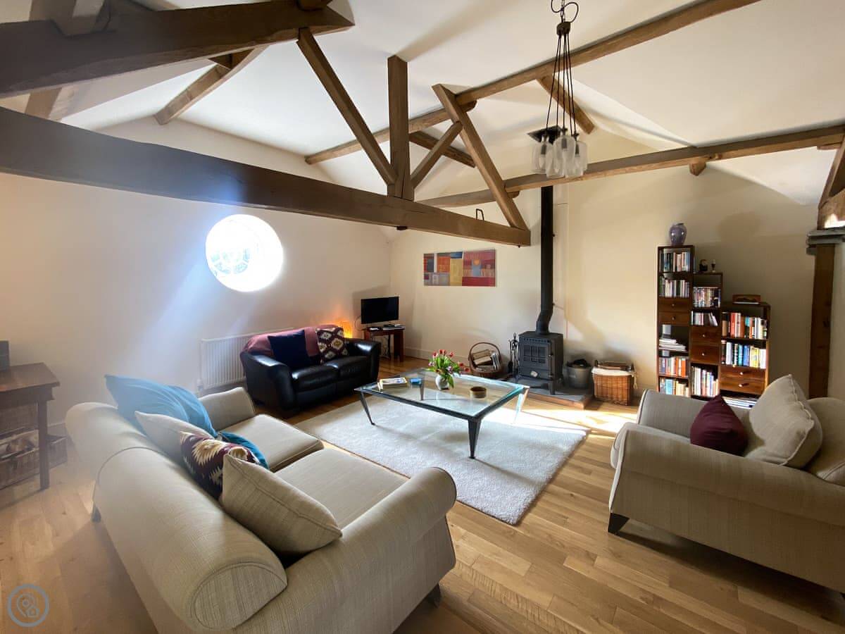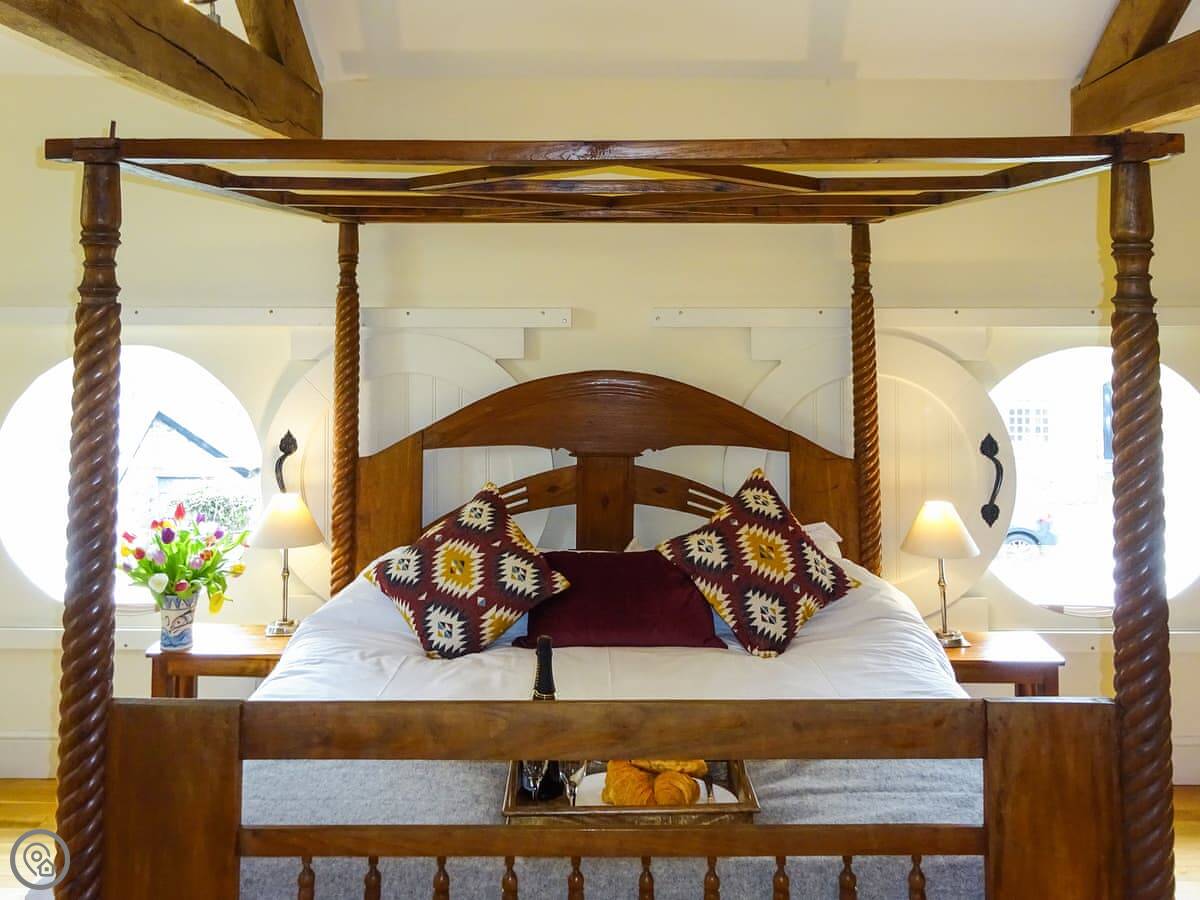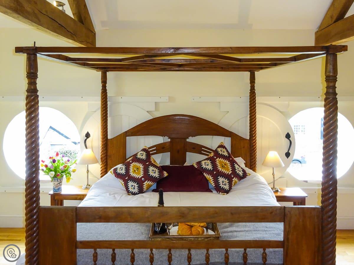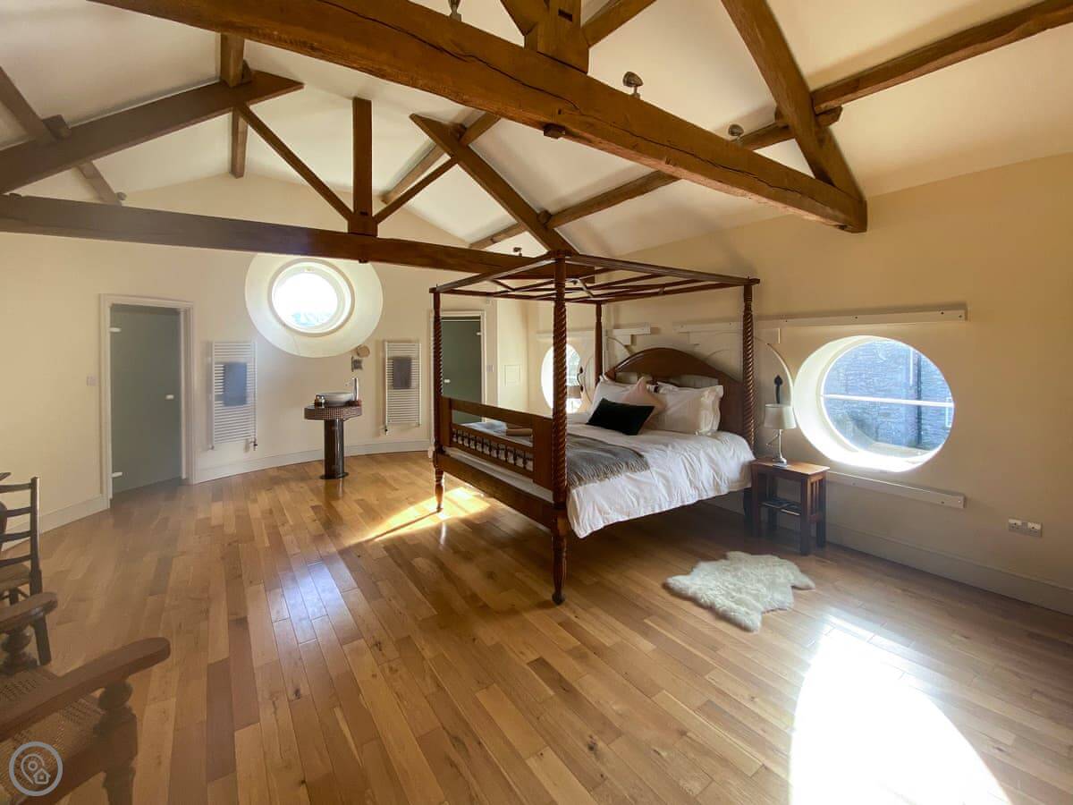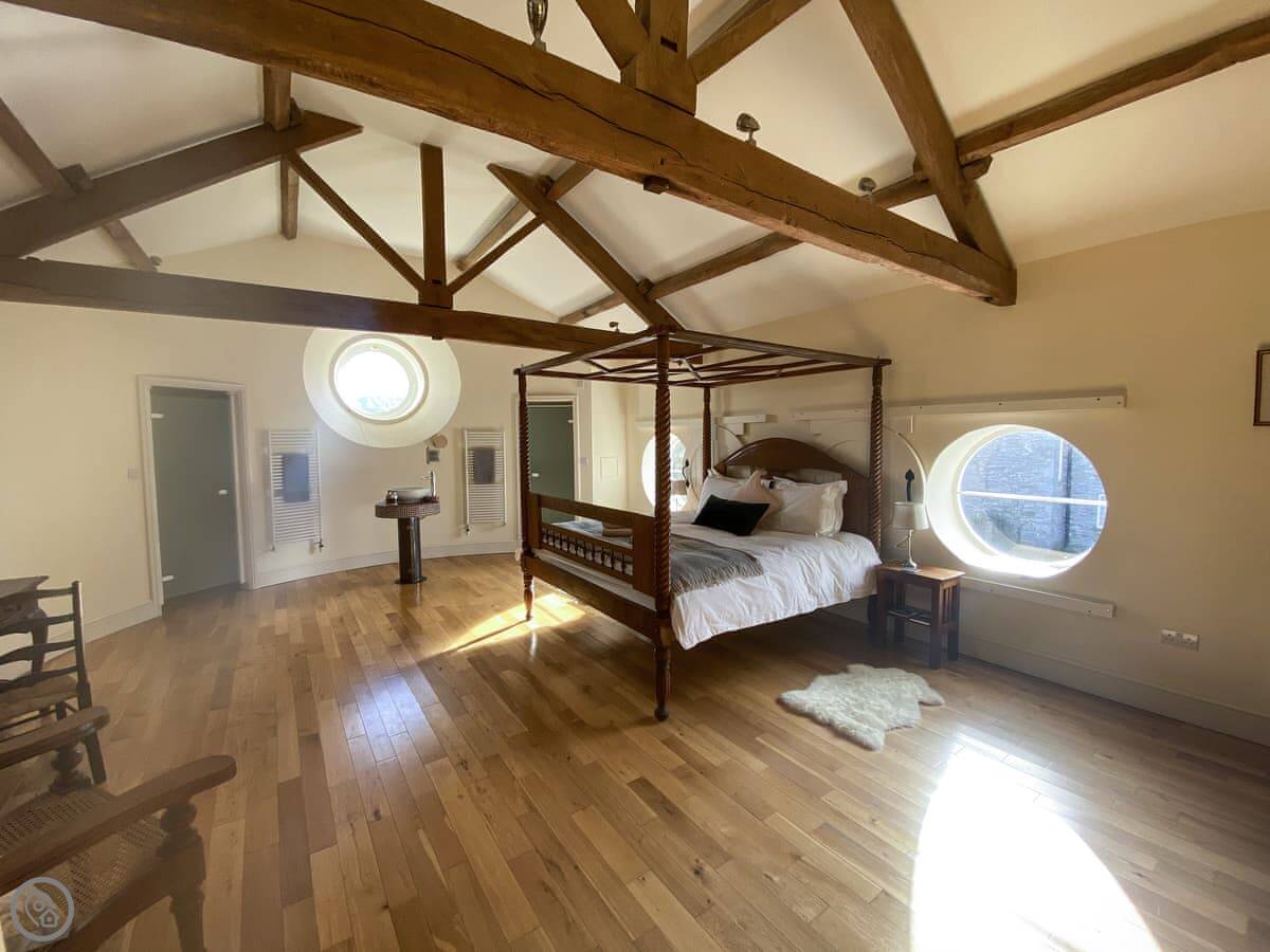 Upstairs is the main bedroom. It's big, with a four-poster bed. The round windows are original, they used to chuck hay out of them. The en-suite is a shower room. Also up here is the living area. It's a huge room with beams, a wood burner, a big table, sofas, and a kitchen along one wall. There's a dishwasher and a washing machine. We've left a record player with some vinyl, and a few books and board games.