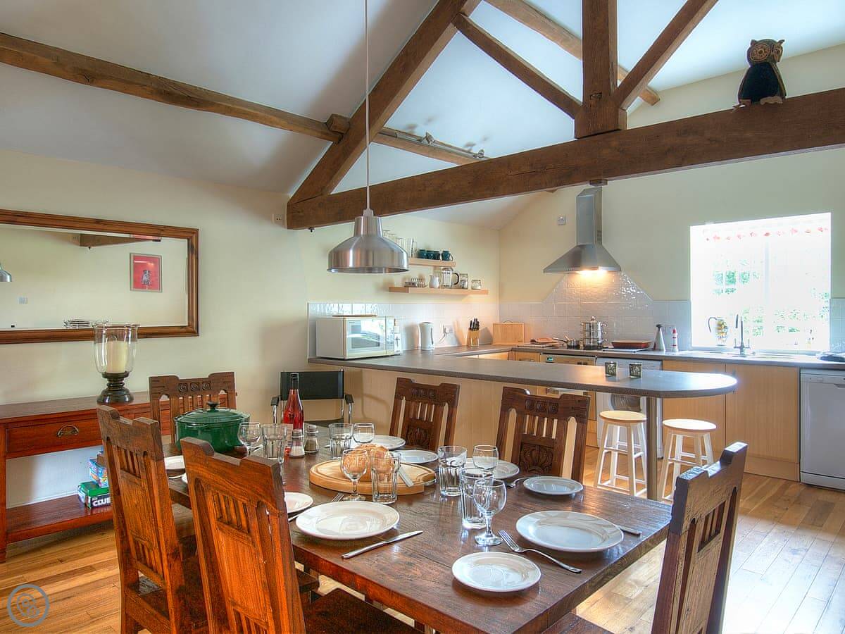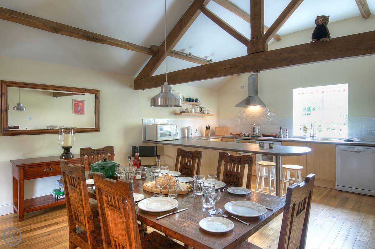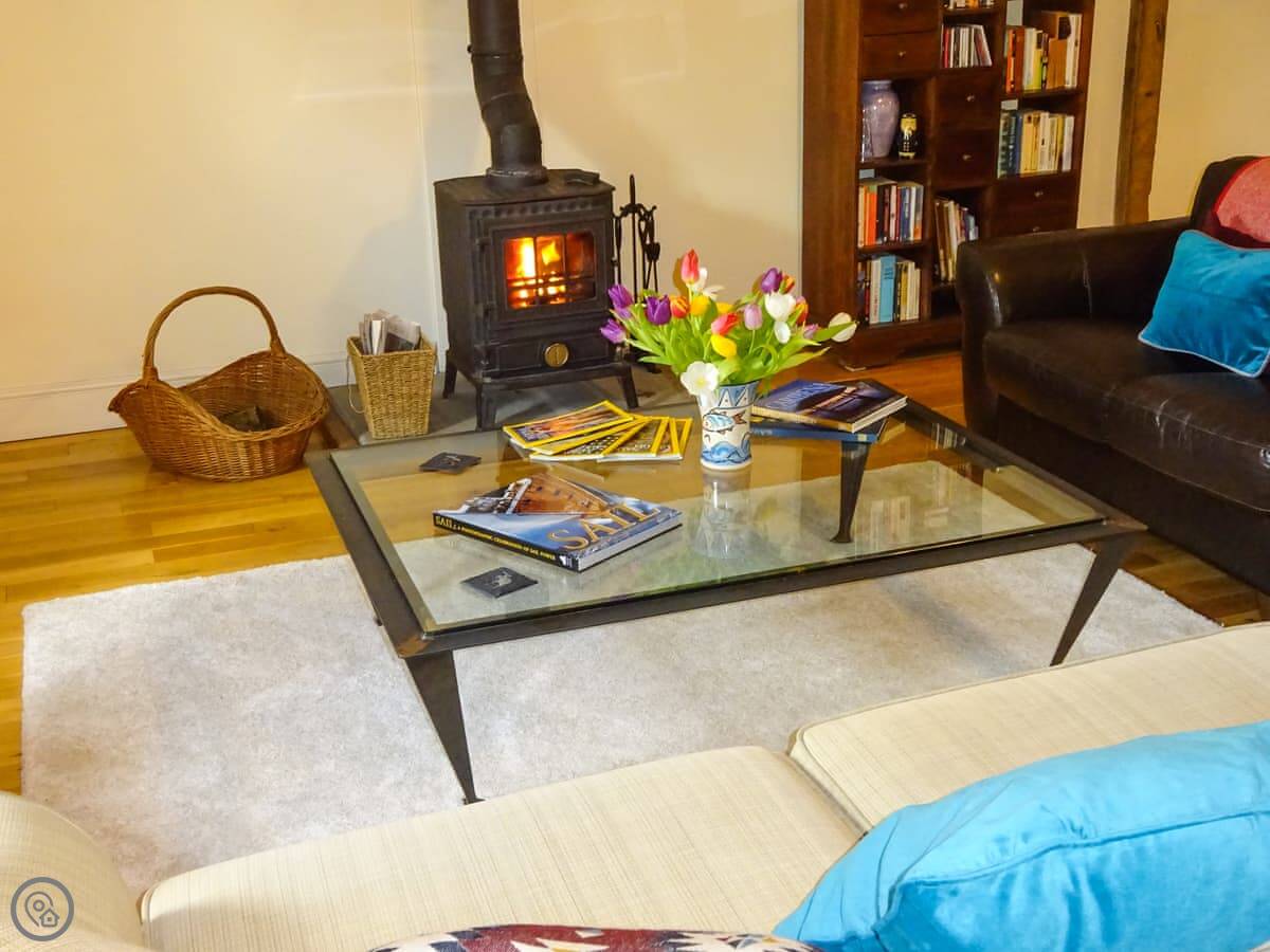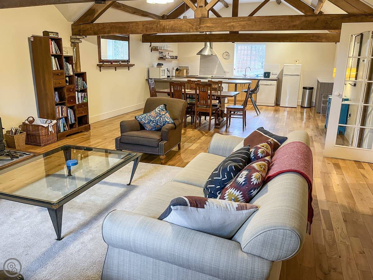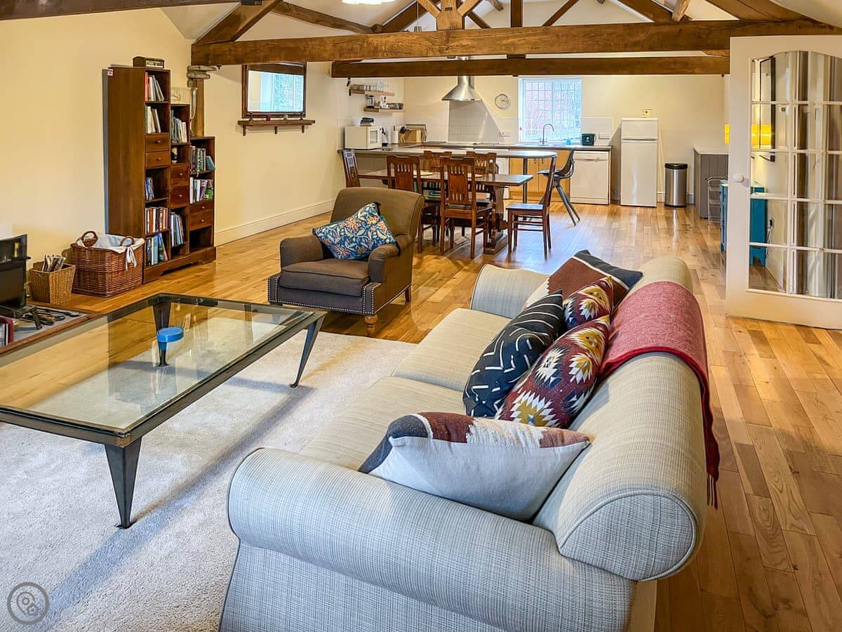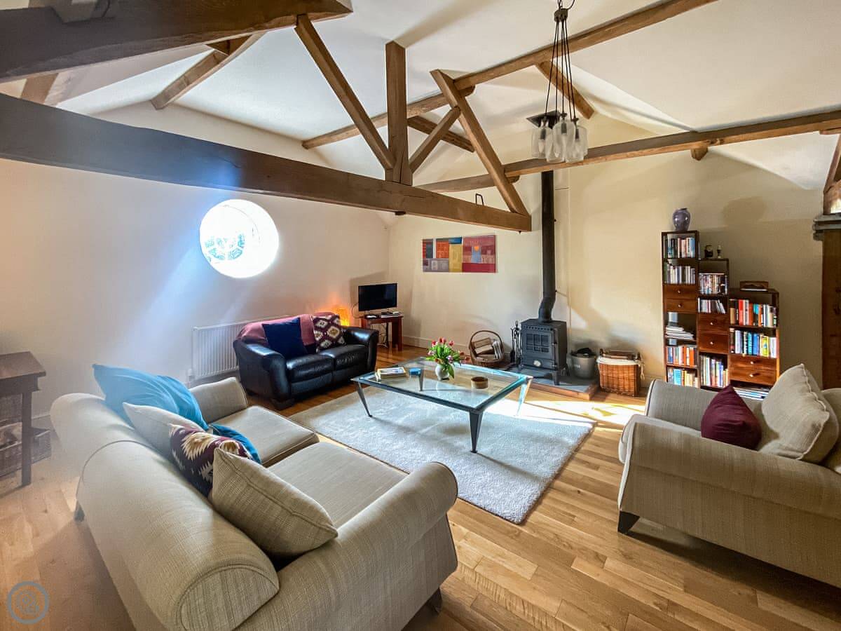 Upstairs is the main bedroom. It's big, with a four-poster bed. The round windows are original, they used to chuck hay out of them. The en-suite is a shower room. Also up here is the living area. It's a huge room with beams, a wood burner, a big table, sofas, and a kitchen along one wall. There's a dishwasher and a washing machine. We've left a record player with some vinyl, and a few books and board games.