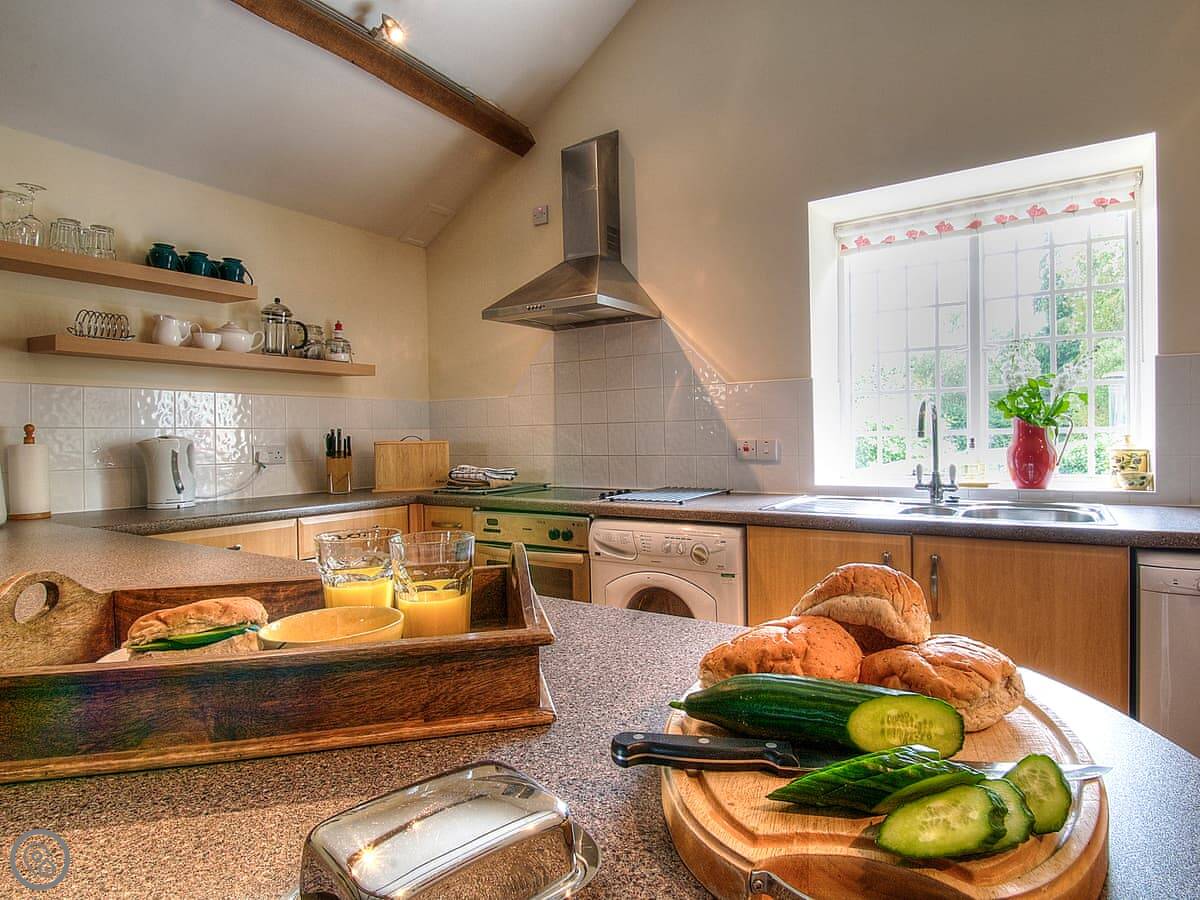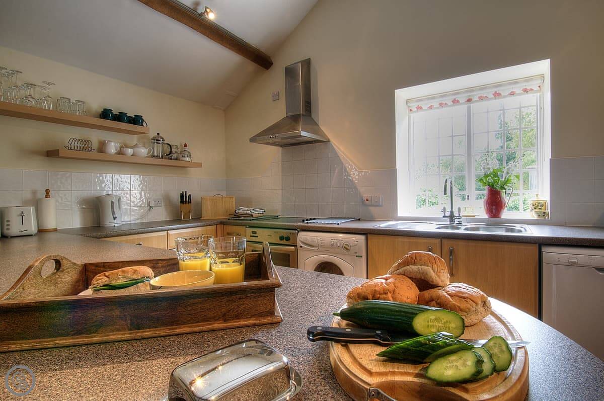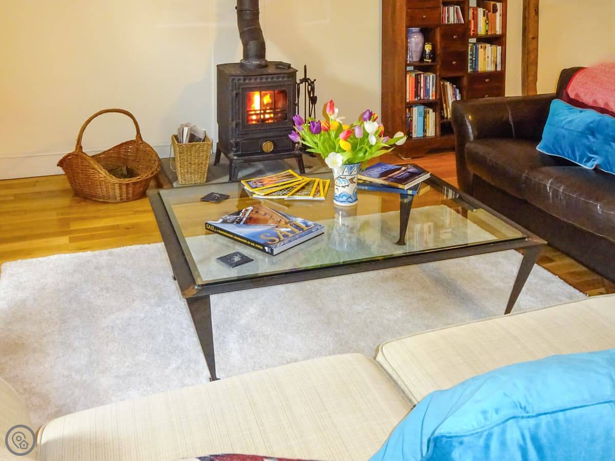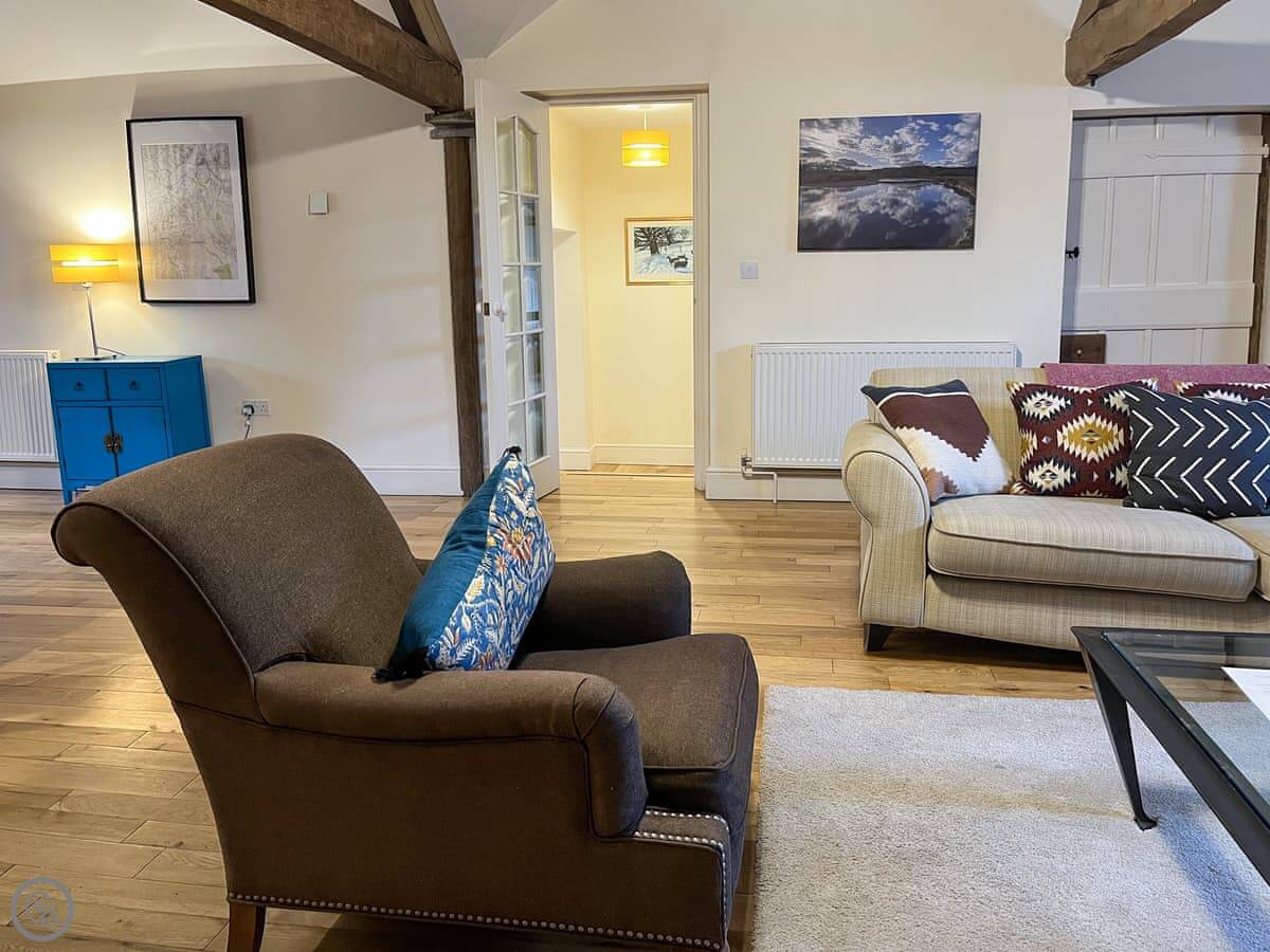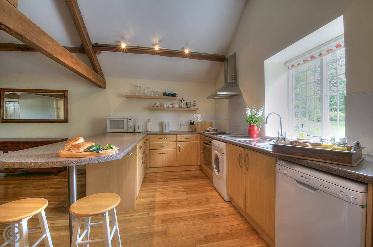 Upstairs is the main bedroom. It's big, with a four-poster bed. The round windows are original, they used to chuck hay out of them. The en-suite is a shower room. Also up here is the living area. It's a huge room with beams, a wood burner, a big table, sofas, and a kitchen along one wall. There's a dishwasher and a washing machine. We've left a record player with some vinyl, and a few books and board games.