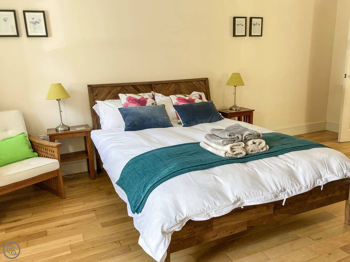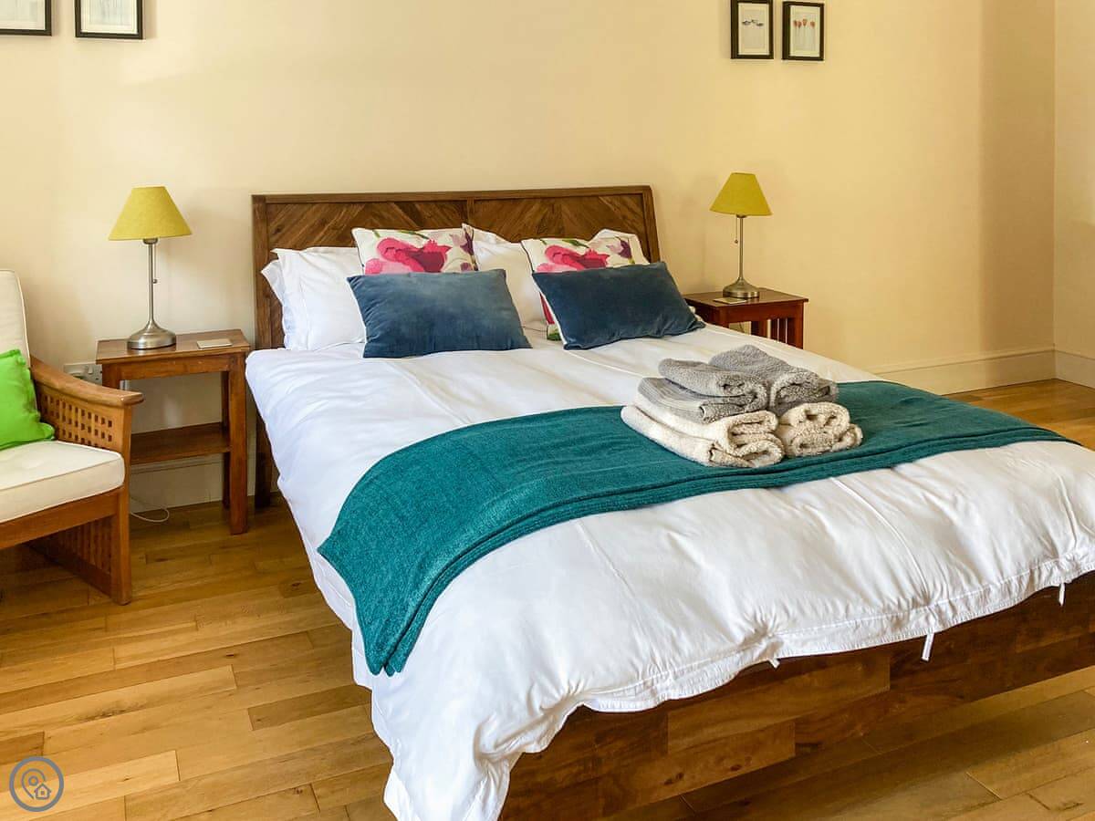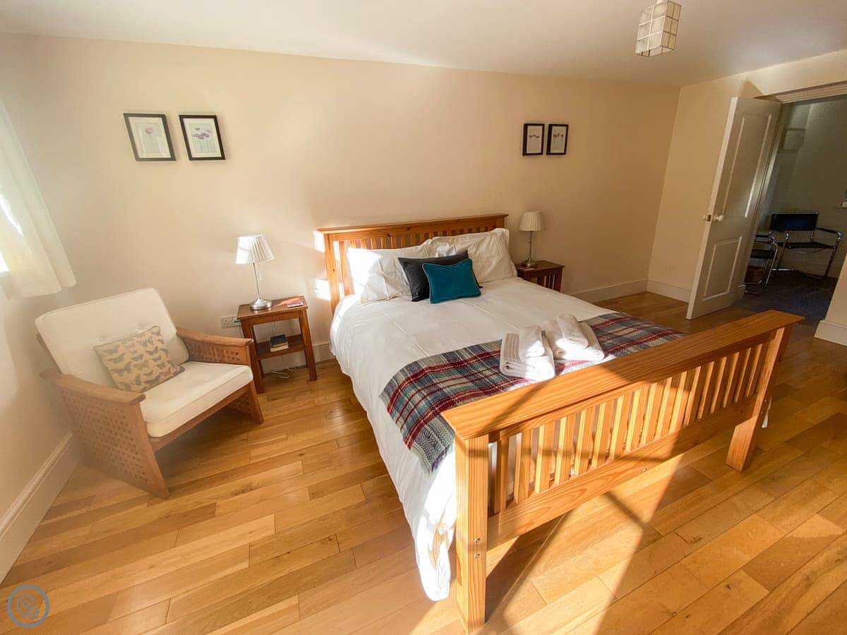 The ground floor has two bedrooms and a bathroom that connects to both. That bathroom has a door out to the garden, which is handy if you've got kids or a dog coming in muddy. There's a cot and a highchair if you need them.