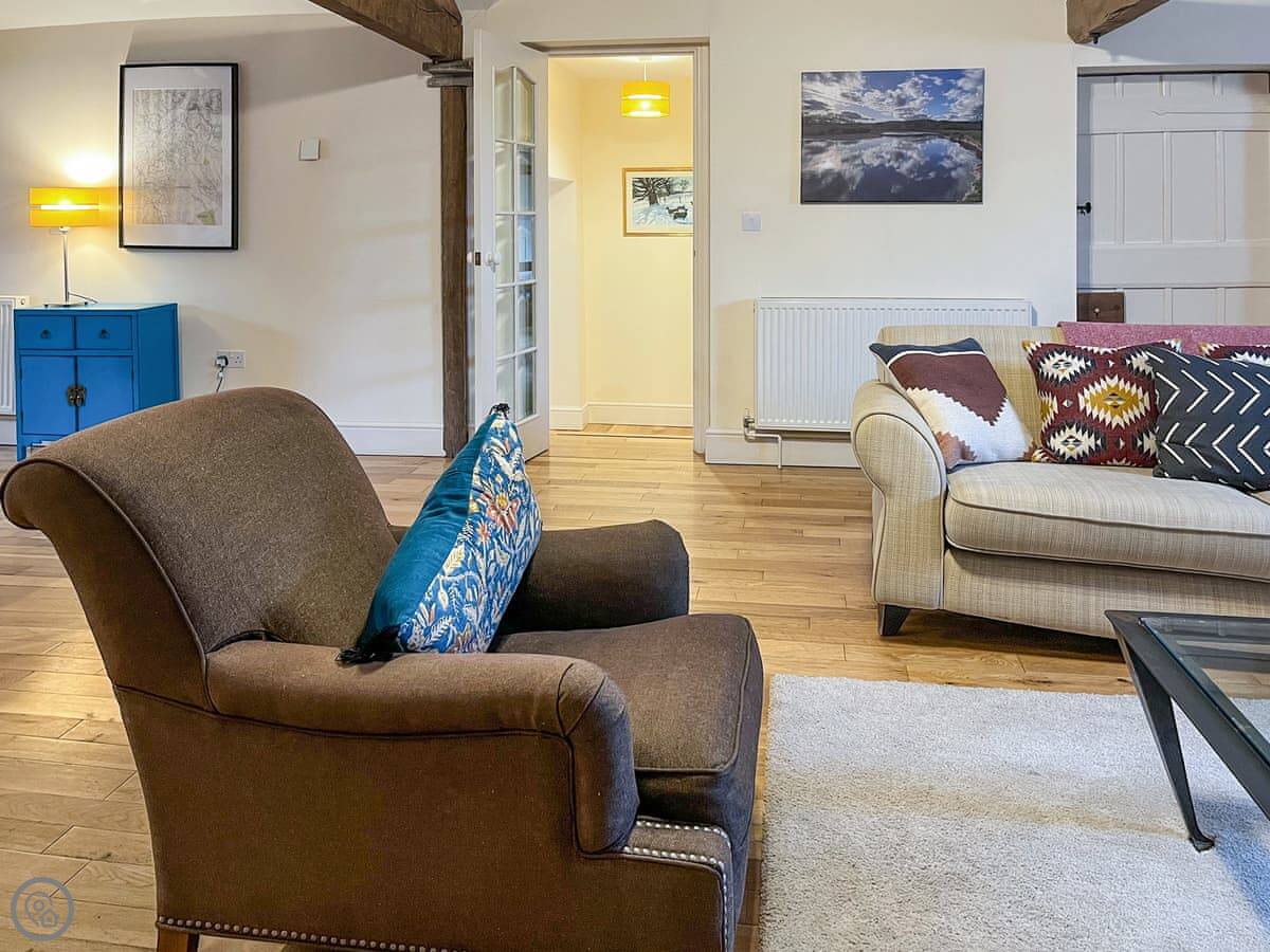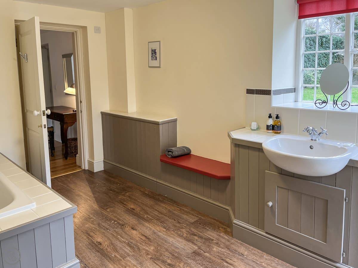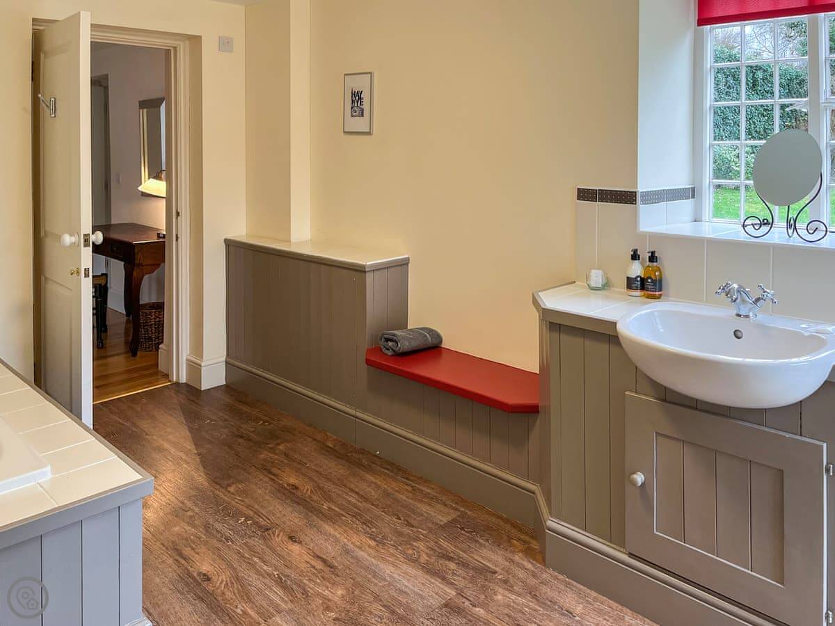 The ground floor has two bedrooms and a bathroom that connects to both. That bathroom has a door out to the garden, which is handy if you've got kids or a dog coming in muddy. There's a cot and a highchair if you need them.