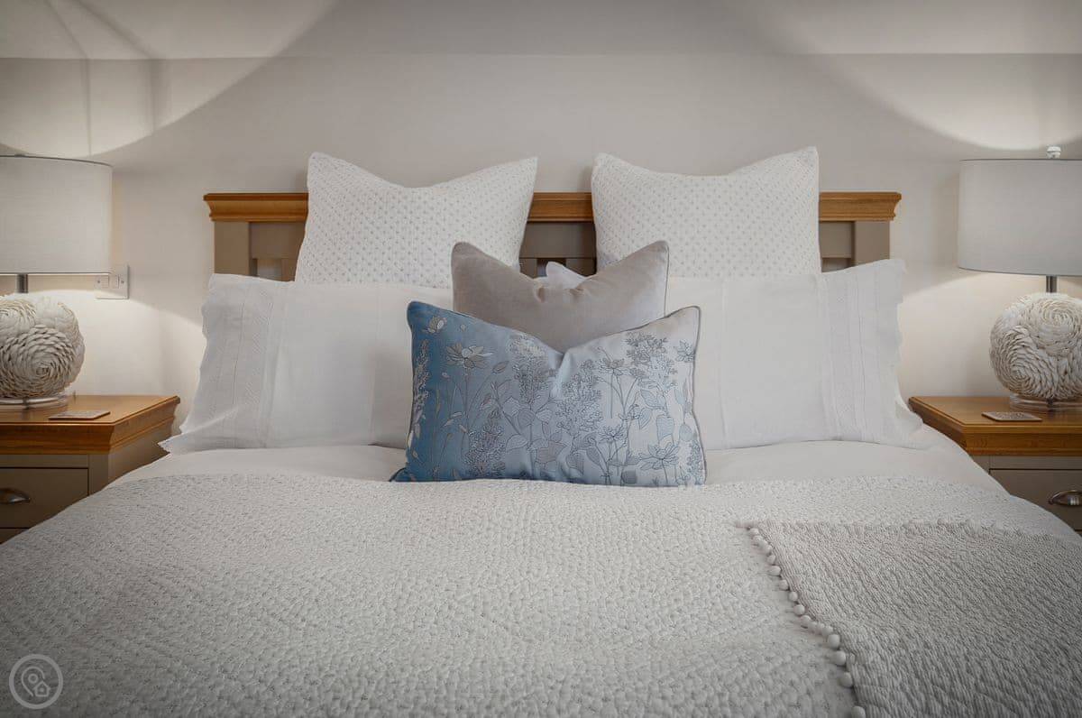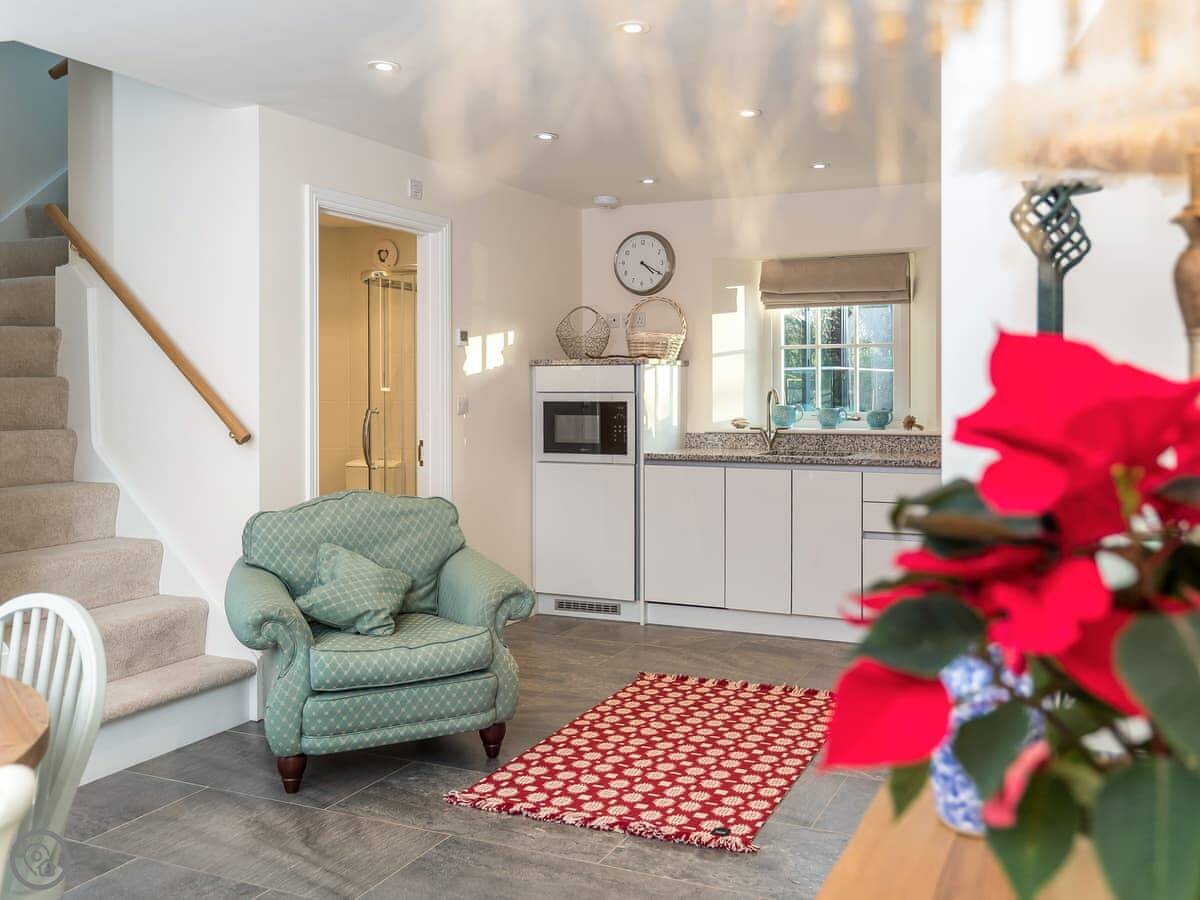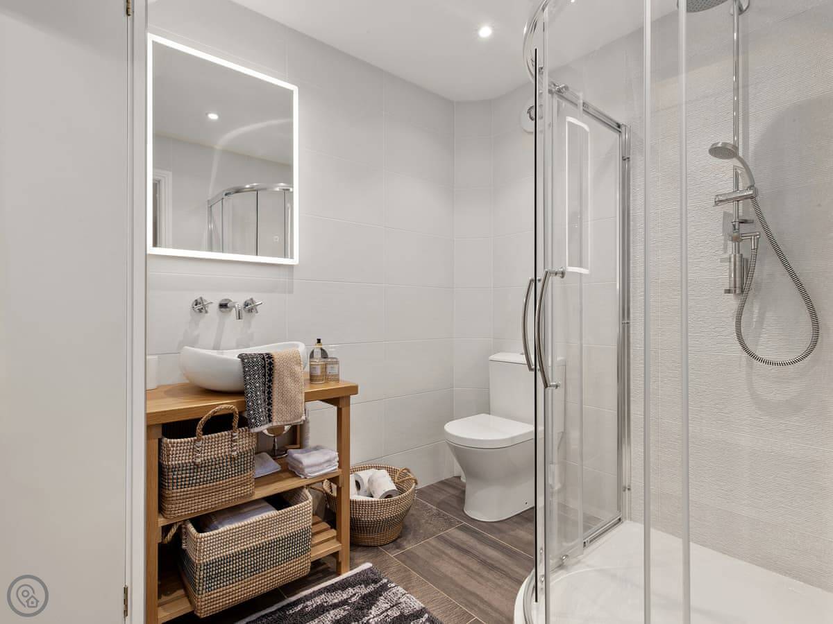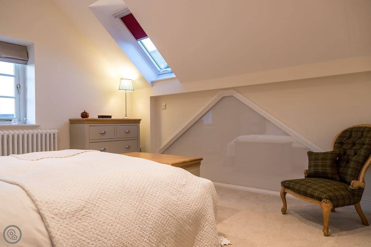 Scandinavian style, ultra-efficient wood burner and downstairs underfloor heating are there to ensure a cosy stay. A wonderful locally crafted kitchen with A-frame beams a granite work surface, high tech NEFF cooker and hob, and all the items you need to relax and prepare gourmet meals. The house is decorated throughout to the highest standards enhanced by an abundance of wonderful soft furnishings. Smart TV with Sky and swift Wi-Fi. The house has one bedroom set on a mezzanine, the flick of a switch obscures the glass to make it a private and luxurious bedroom, with electric blinds to enhance the feel.