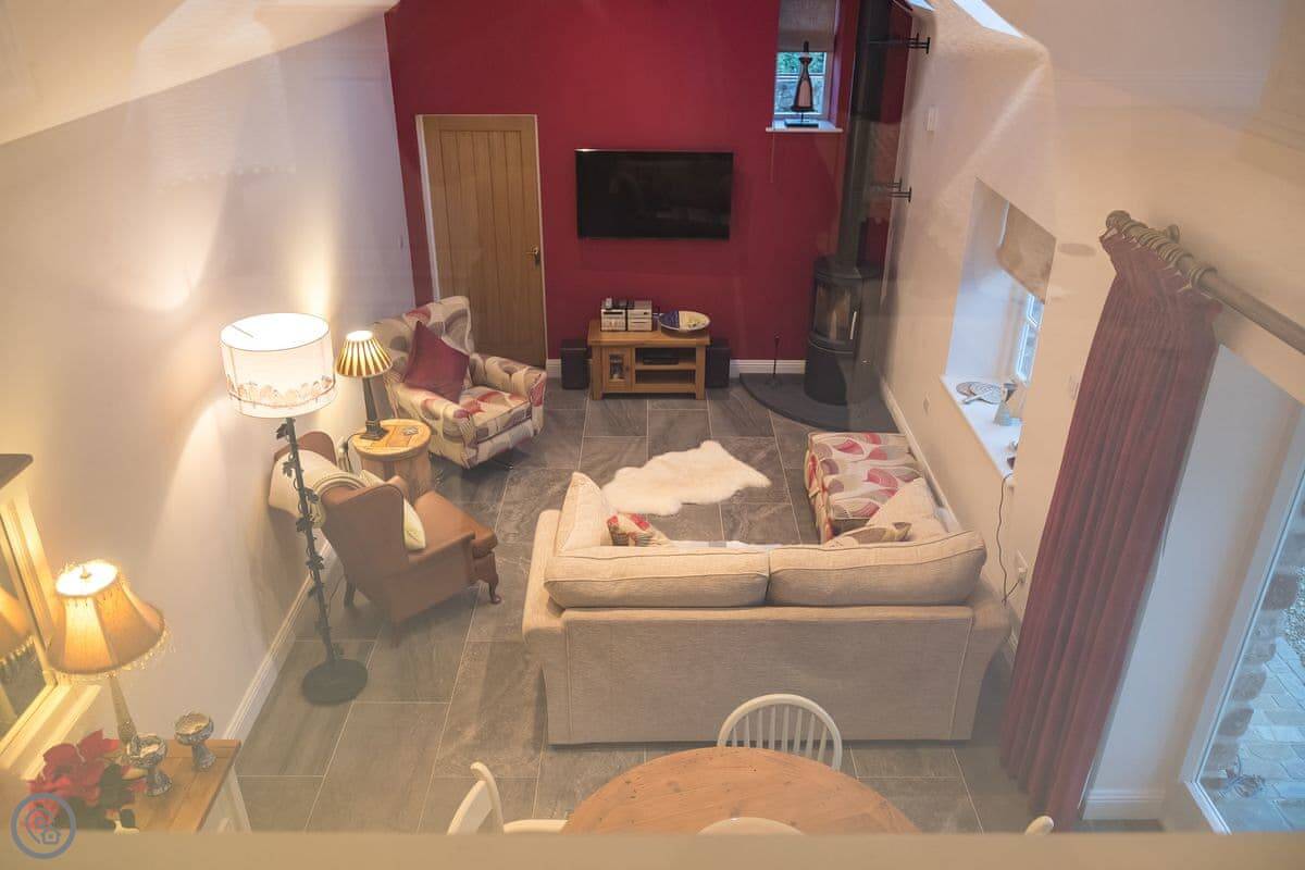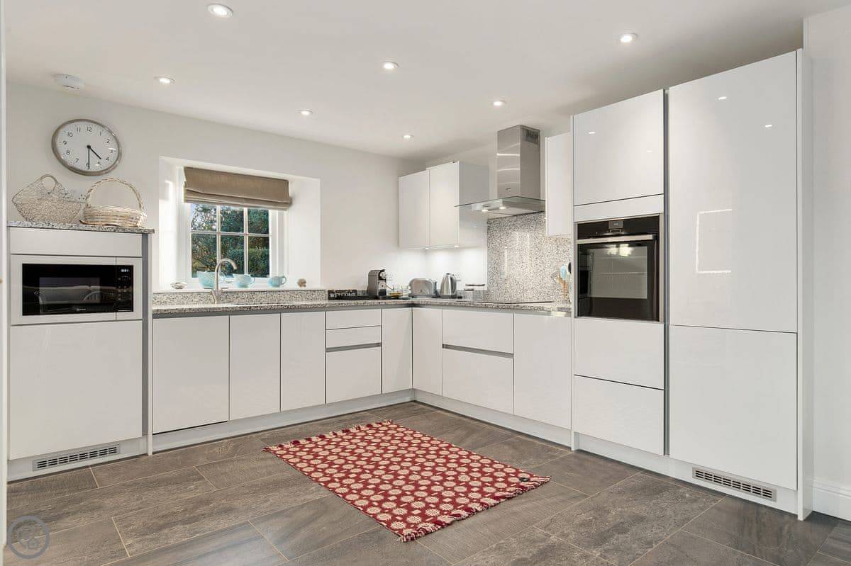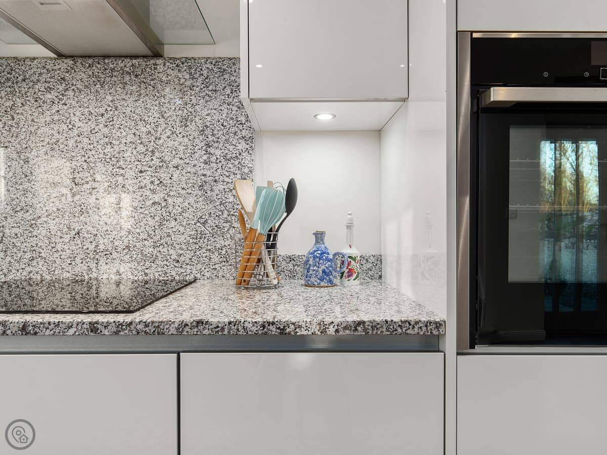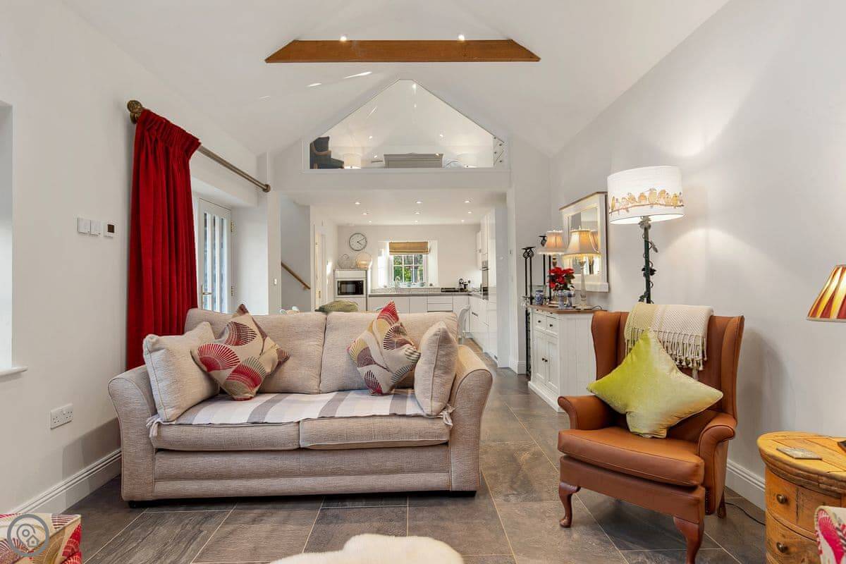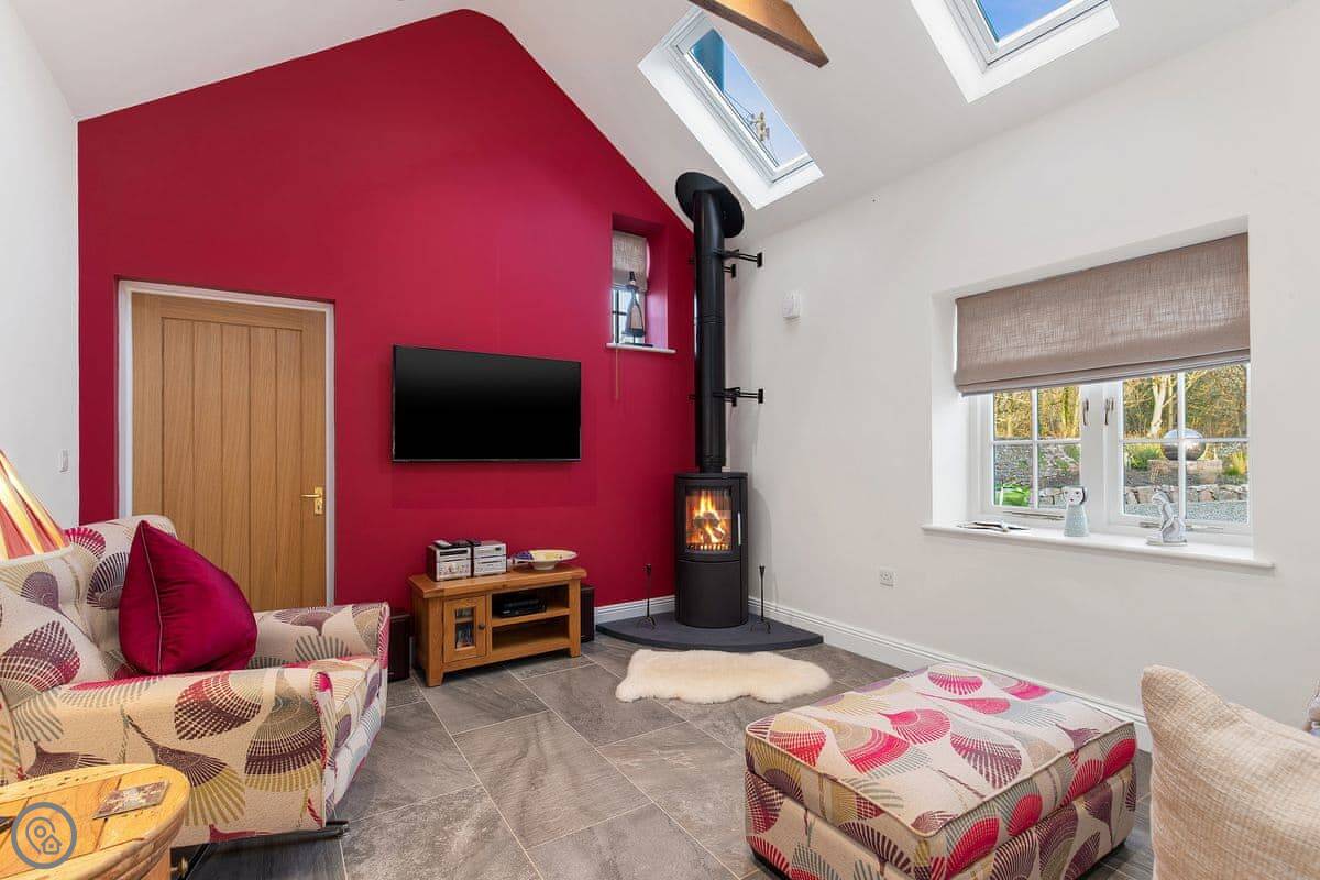 Scandinavian style, ultra-efficient wood burner and downstairs underfloor heating are there to ensure a cosy stay. A wonderful locally crafted kitchen with A-frame beams a granite work surface, high tech NEFF cooker and hob, and all the items you need to relax and prepare gourmet meals. The house is decorated throughout to the highest standards enhanced by an abundance of wonderful soft furnishings. Smart TV with Sky and swift Wi-Fi. The house has one bedroom set on a mezzanine, the flick of a switch obscures the glass to make it a private and luxurious bedroom, with electric blinds to enhance the feel.