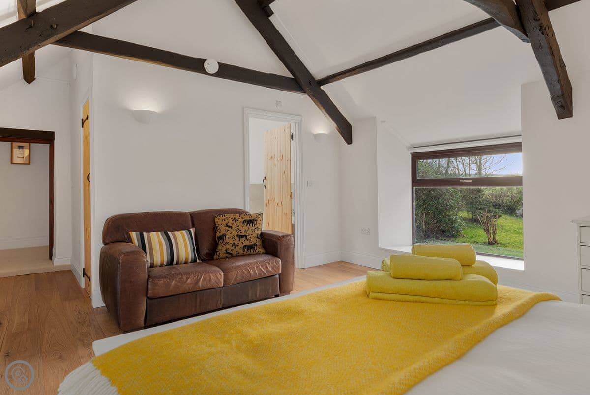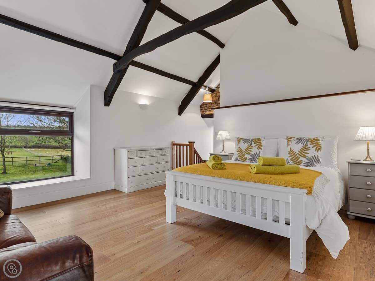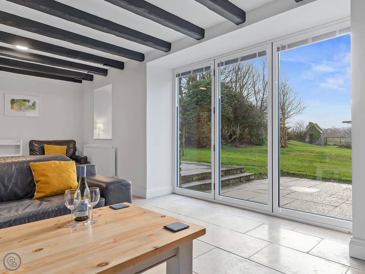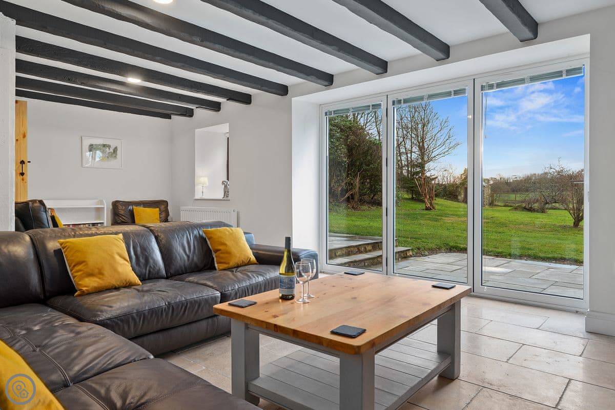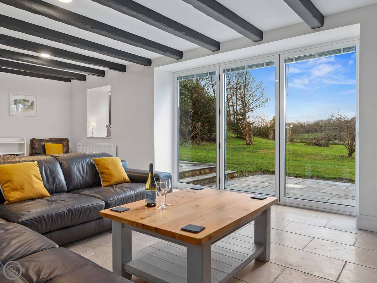 The house sleeps eleven, in five bedrooms. There are three bathrooms, one is ensuite to the main bedroom. It's got a 4 Star rating. The ceilings are beamed and quite high in some rooms. There are two living rooms and a conservatory, which is useful with a big group so people can spread out.
