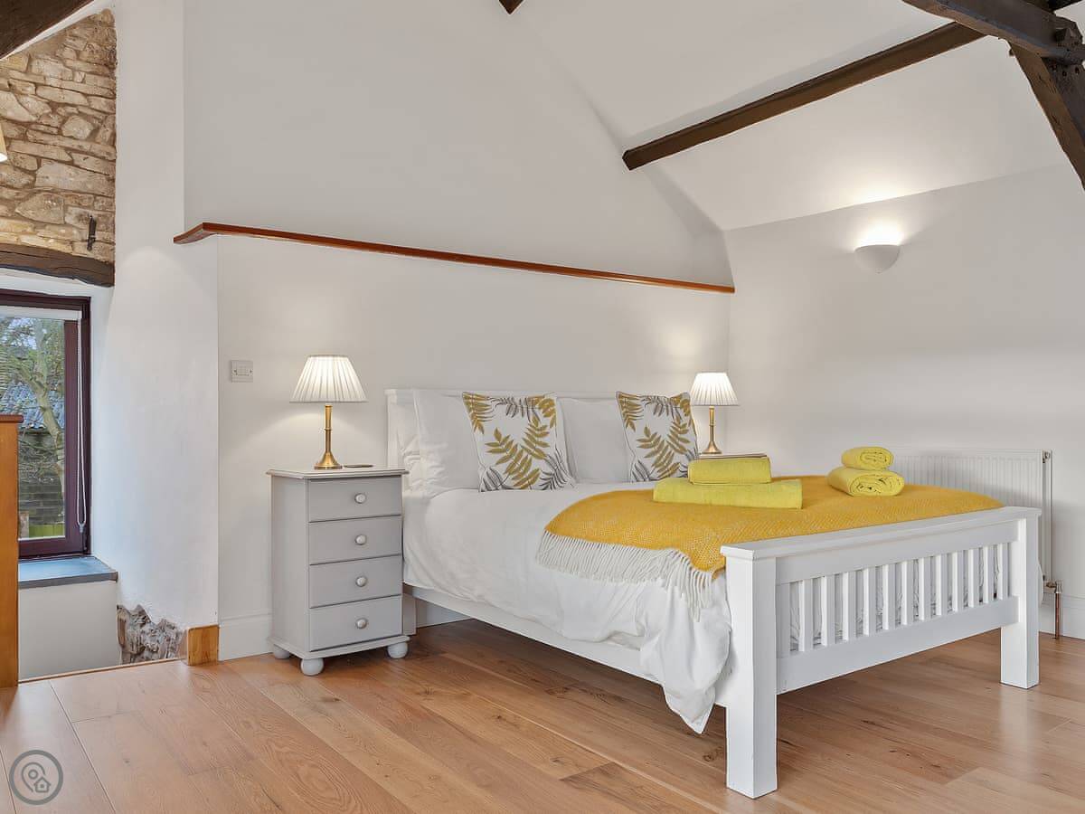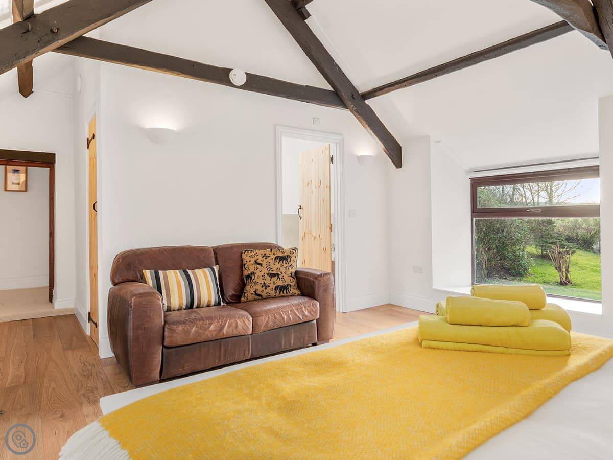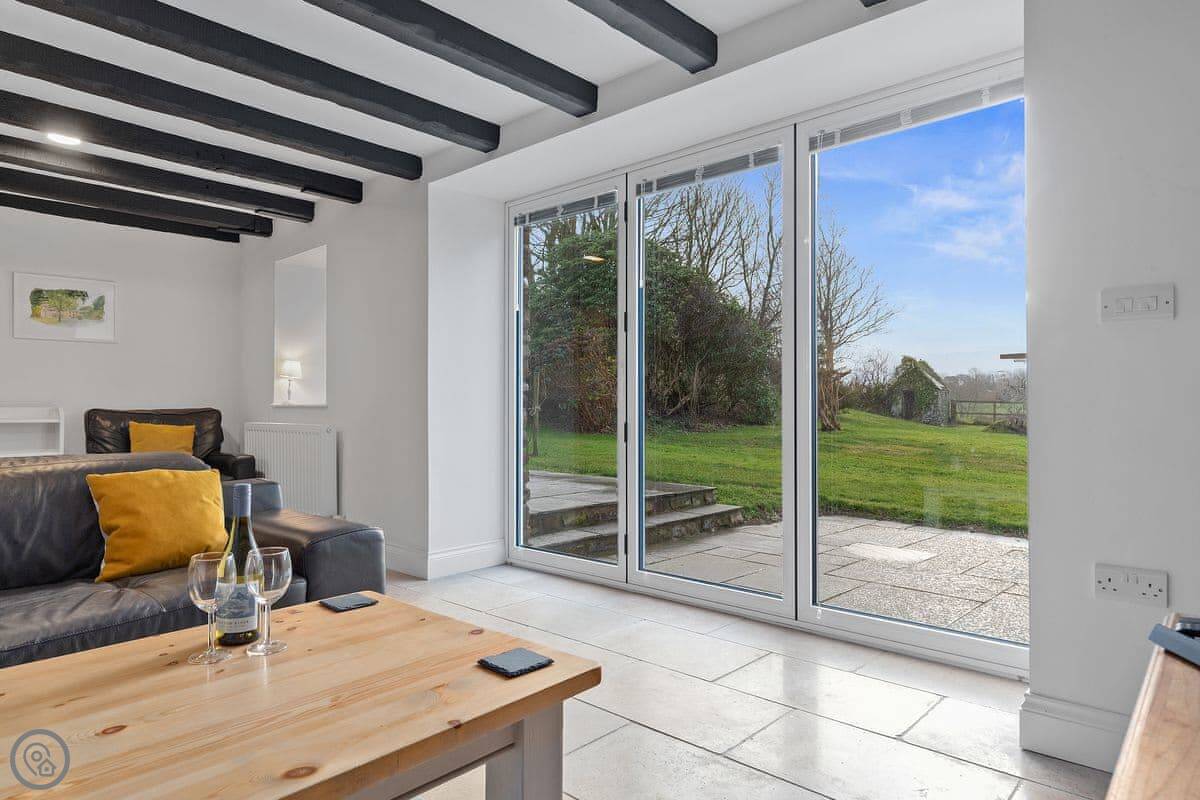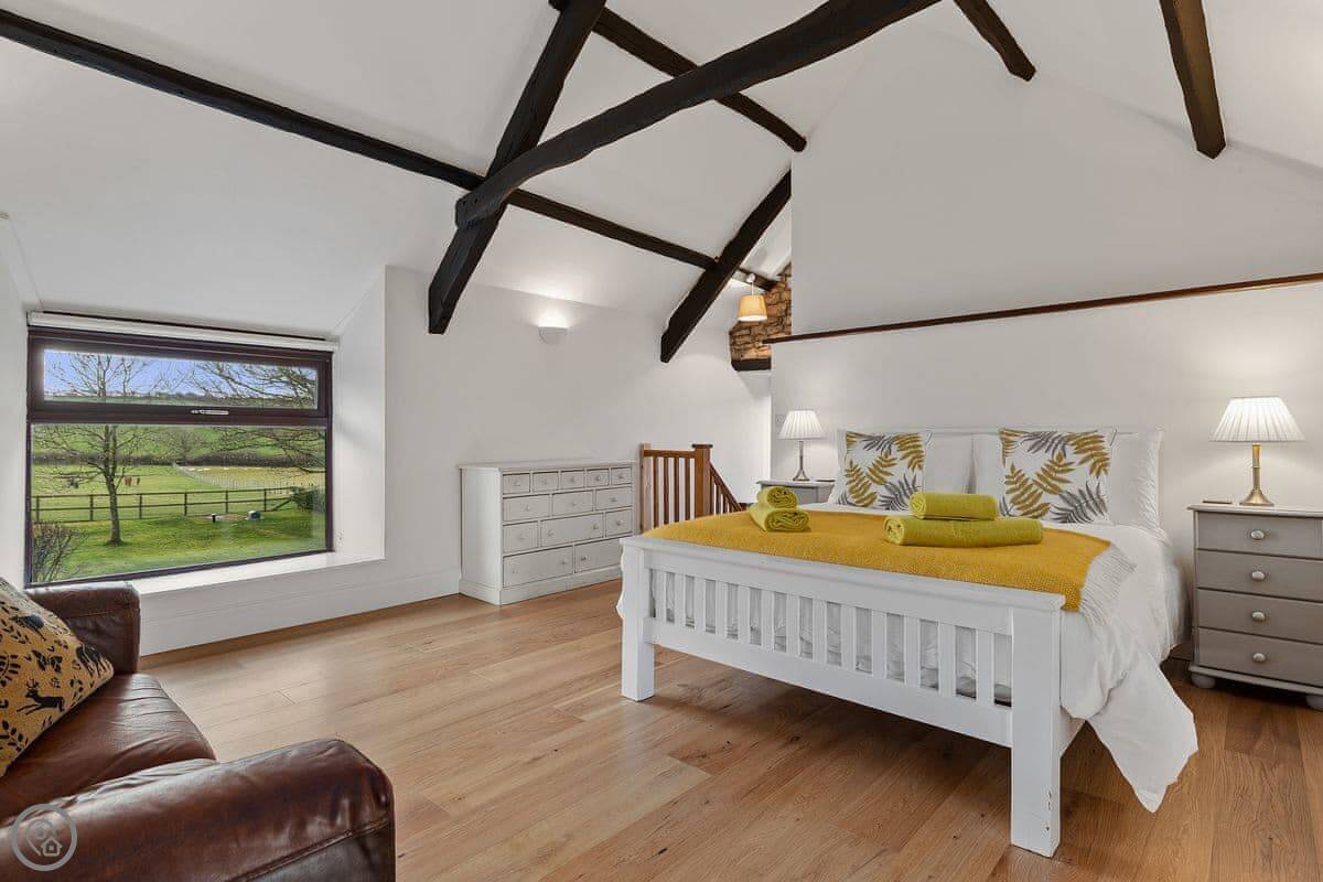 The house sleeps eleven, in five bedrooms. There are three bathrooms, one is ensuite to the main bedroom. It's got a 4 Star rating. The ceilings are beamed and quite high in some rooms. There are two living rooms and a conservatory, which is useful with a big group so people can spread out.