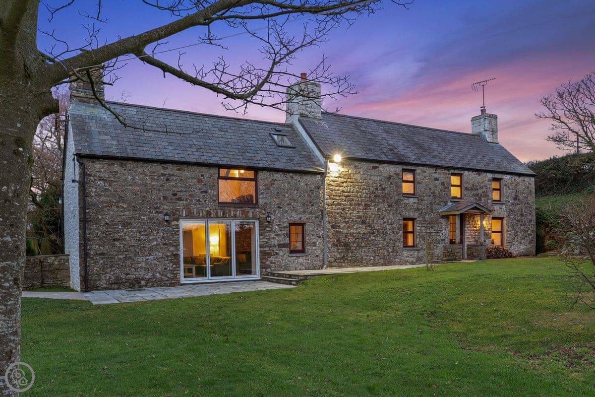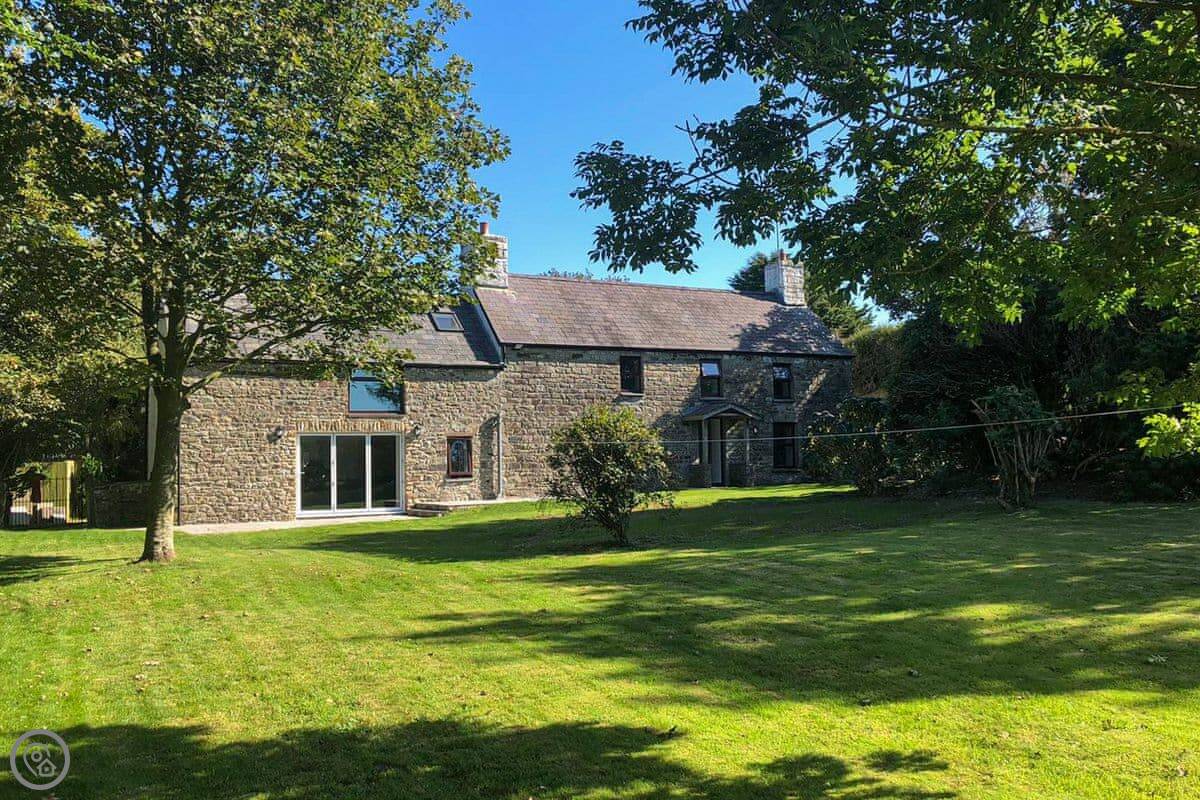 Morfa Ganol is a farmhouse near Penmorfa in Carmarthenshire. It's detached, and you get a fair bit of land with it. The garden is mostly lawn, with some trees and shrubs. The views from the patio are over fields and hills. It's quiet.