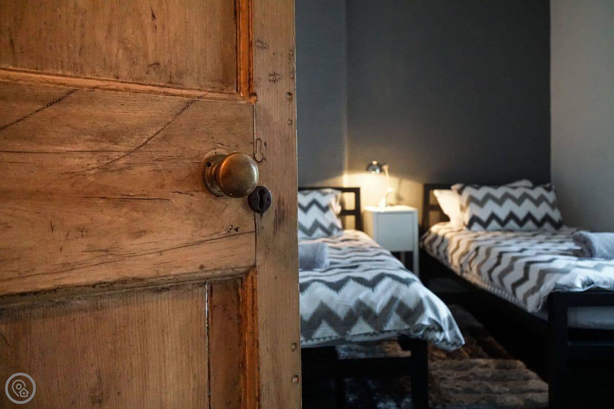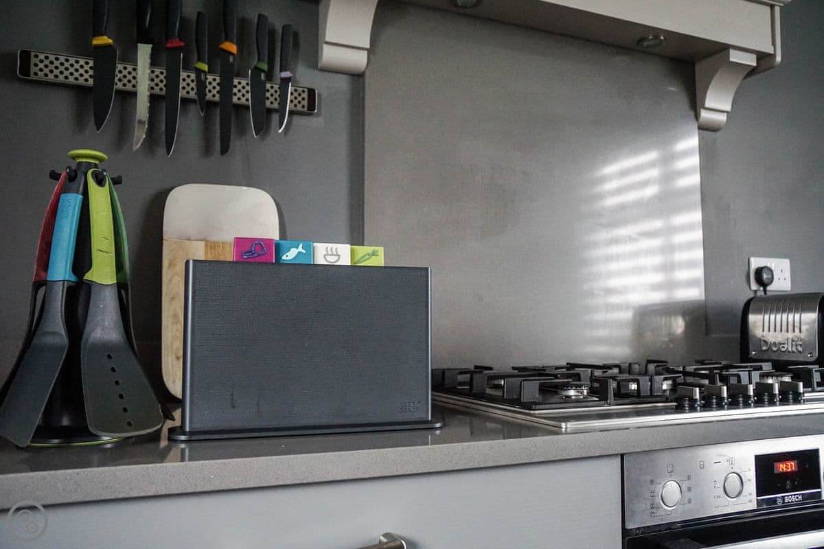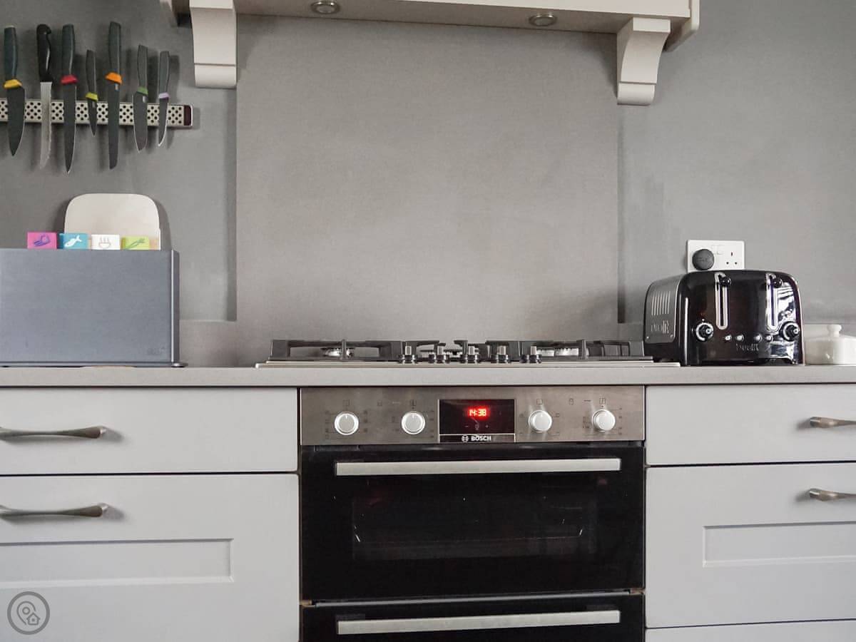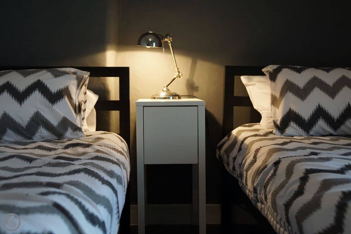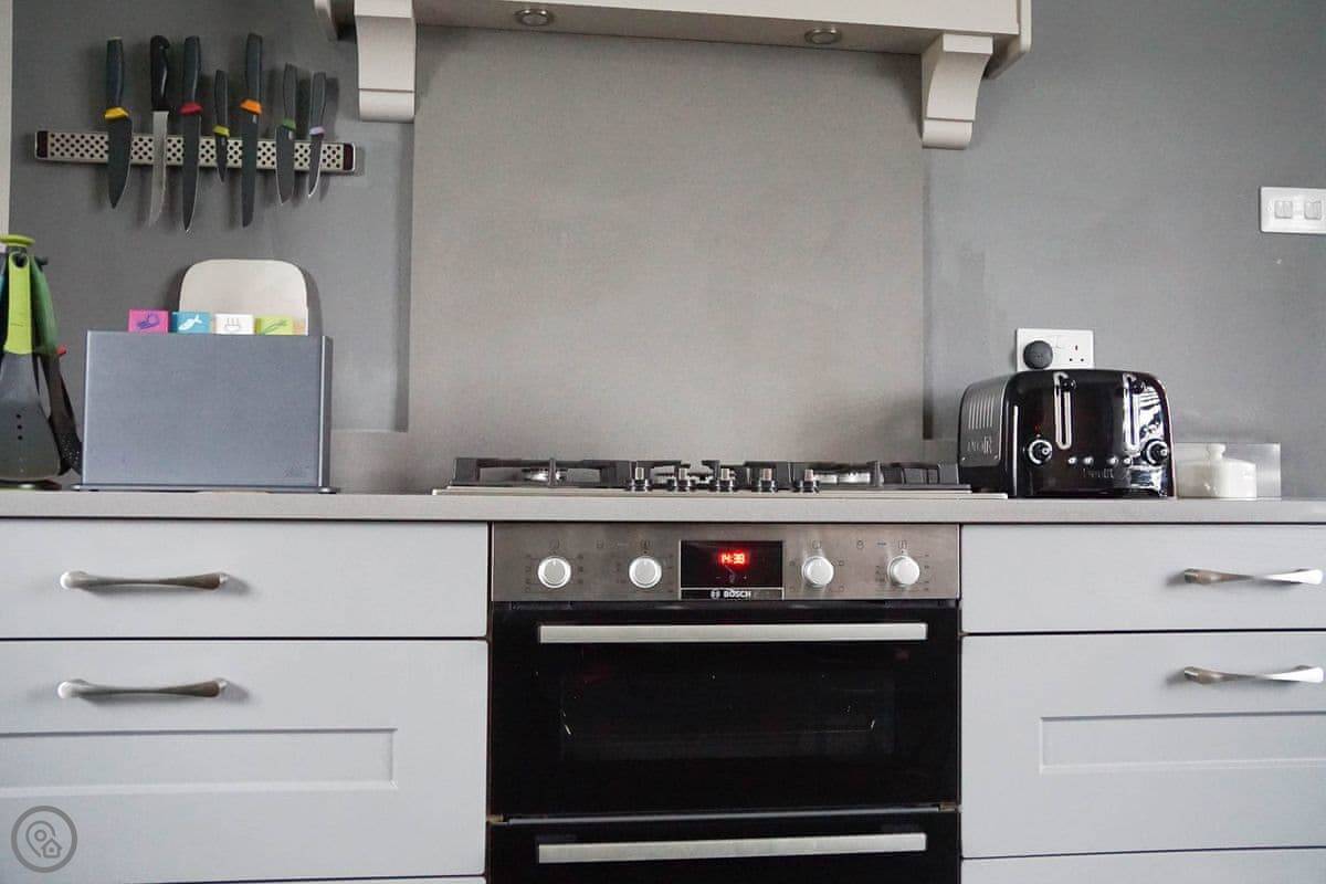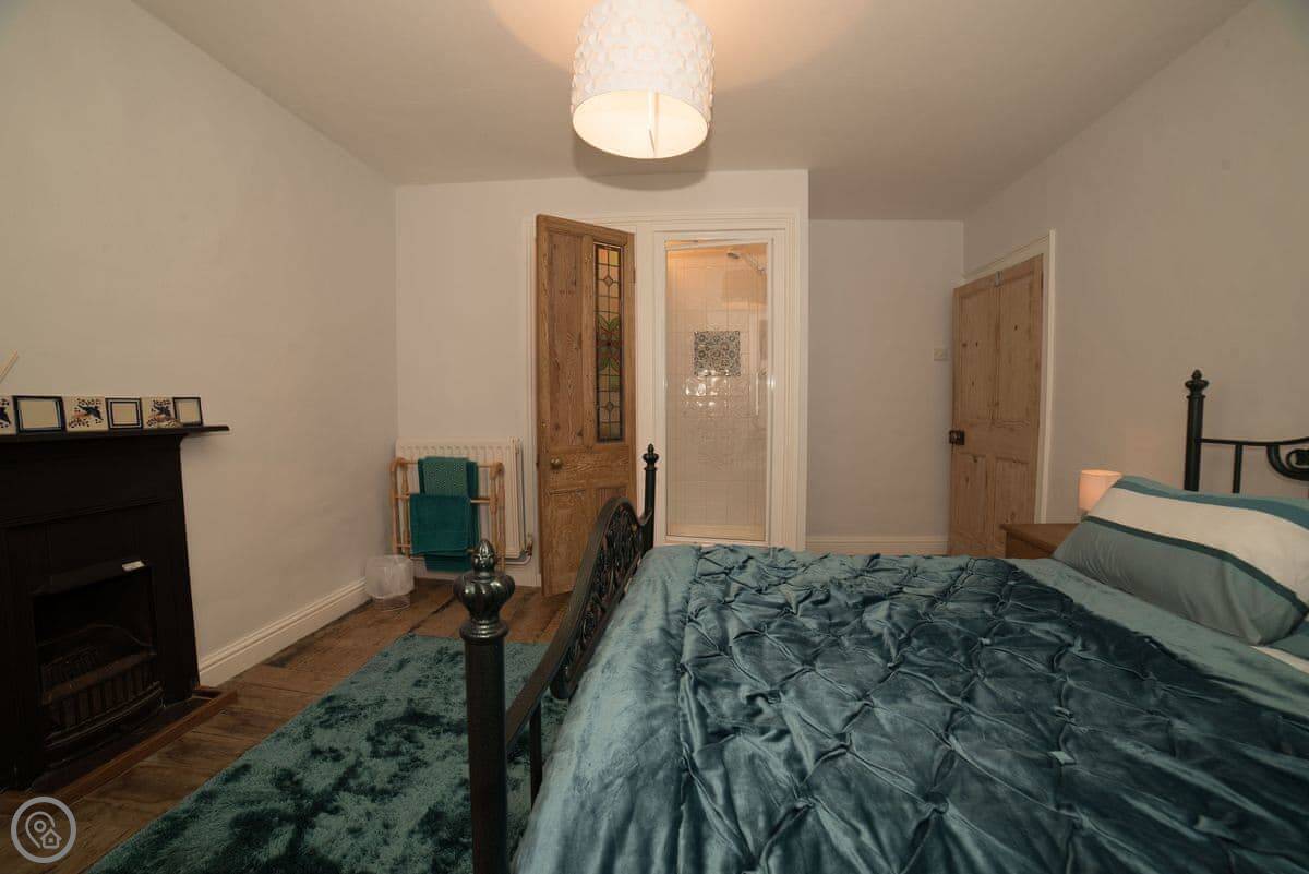 It’s got the basics: washing machine, dishwasher, wifi, TV. Bedding and towels are provided. Parking for a couple of cars right there. The entrance is step-free, so it works for wheelchairs or prams. Pets are welcome, up to two.