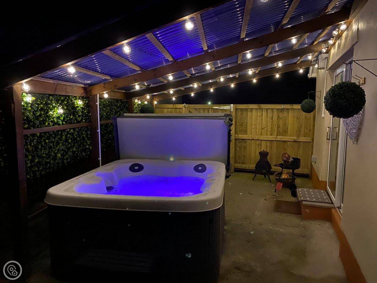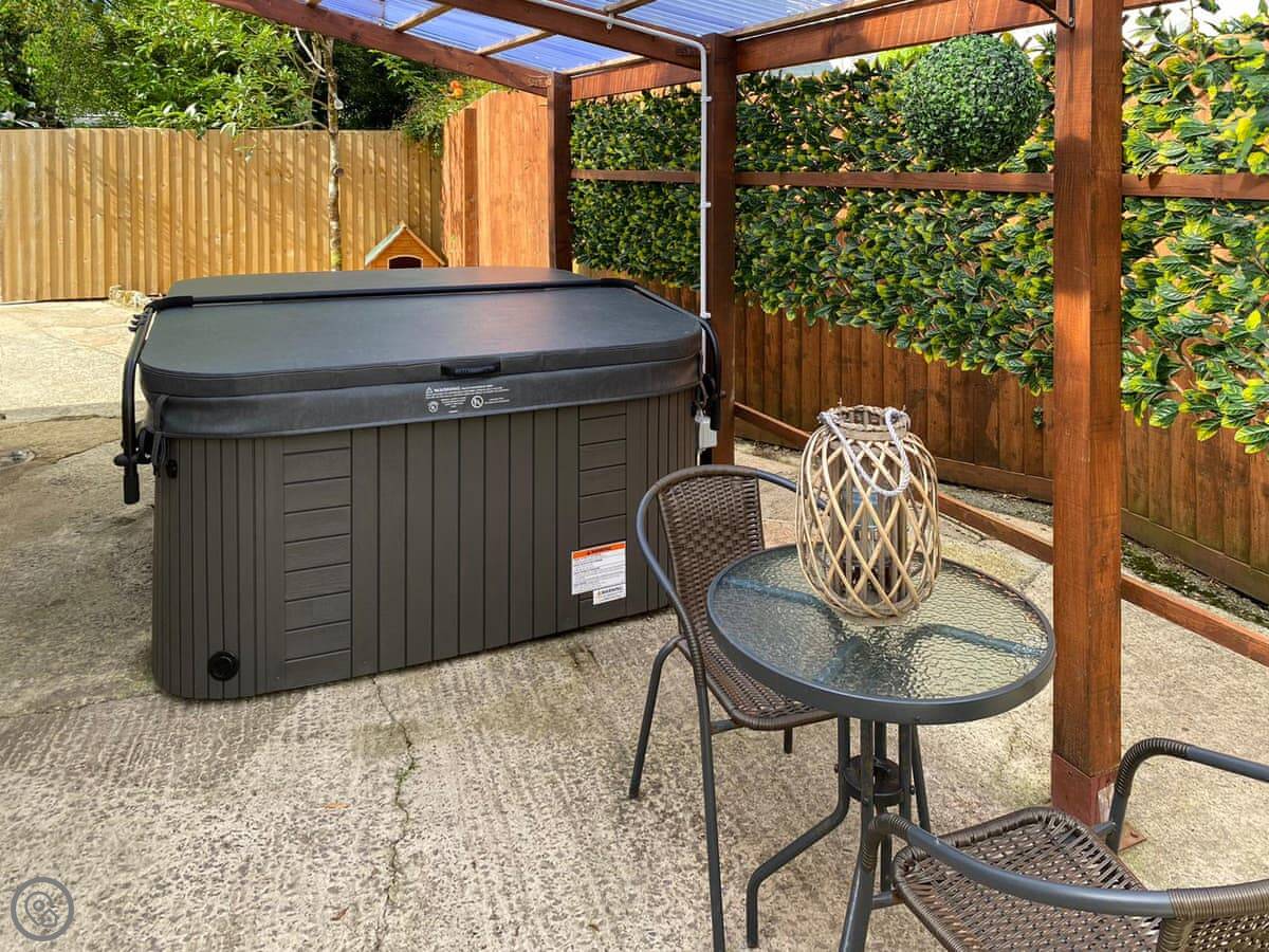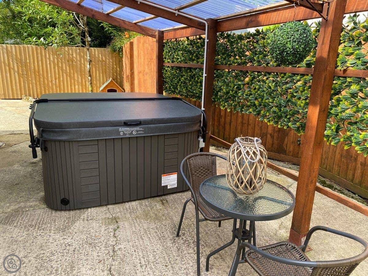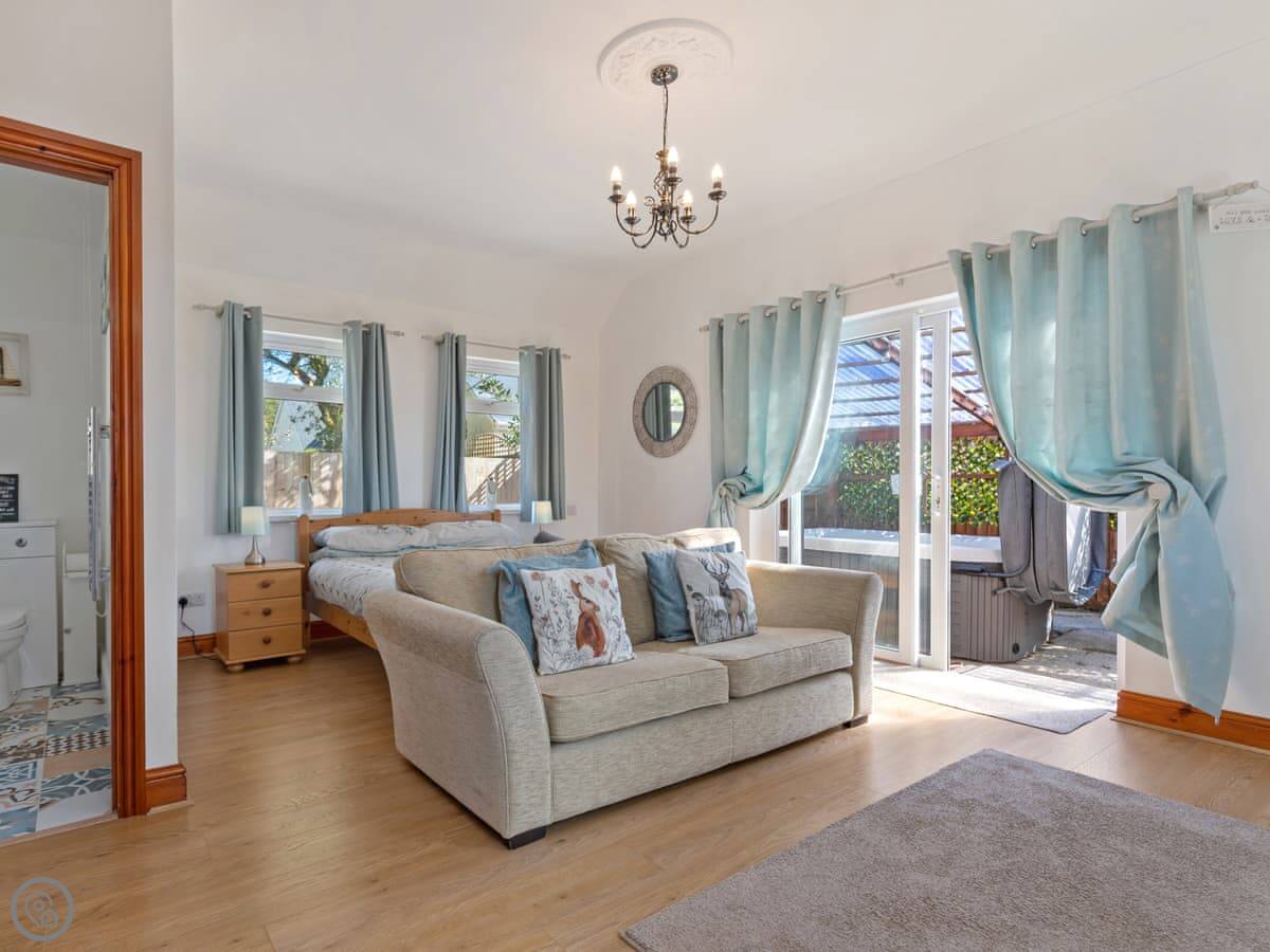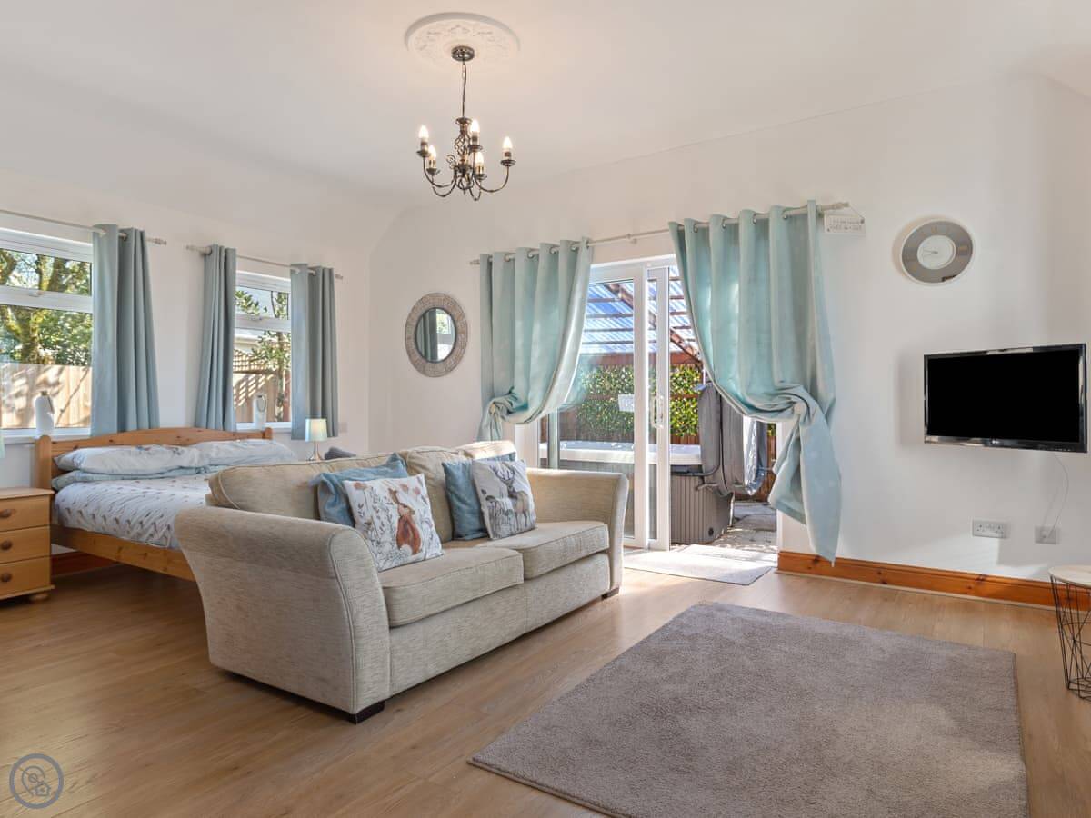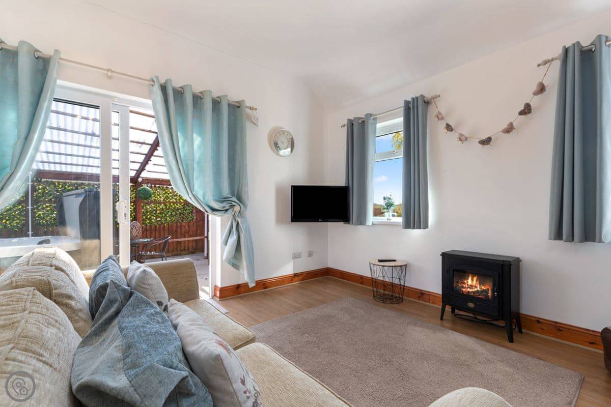 The Cwtch offers an open plan, contemporary kitchen and dining area, with a table and three chairs. The bedroom/living space is a well designed and stylish area, which has been dressed with, a king-size bed and has a large TV, elegant electric heater and comfortable two-seater sofa. The separate en-suite shower room is a bright area which has a stylish finish. Sliding doors lead out to a delightful, private courtyard with a hot tub which is romantically lit with with lights above. You’ll also find a table and chairs along with a firepit, perfect for some alfresco dining. The property has been finished to a high standard throughout.