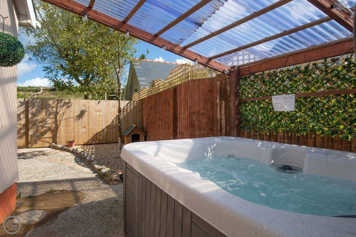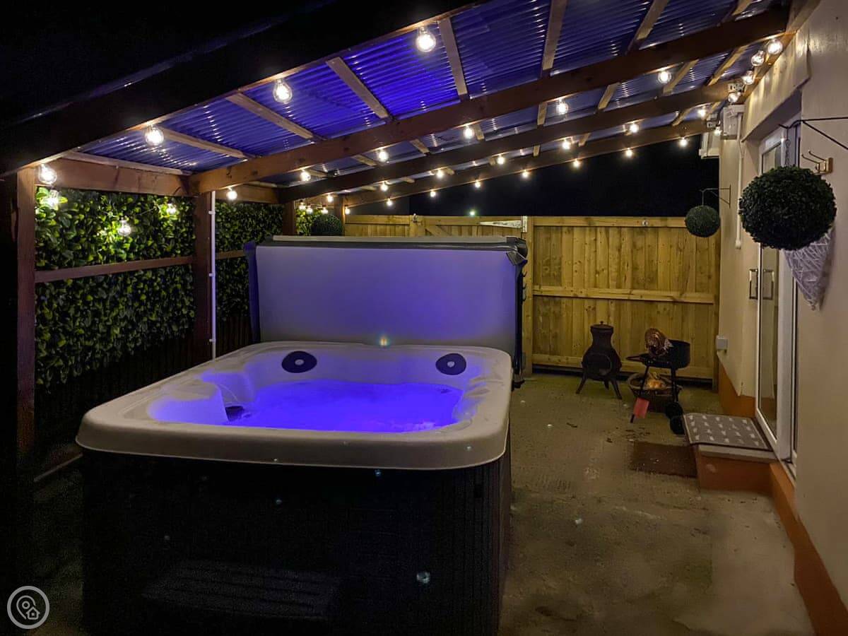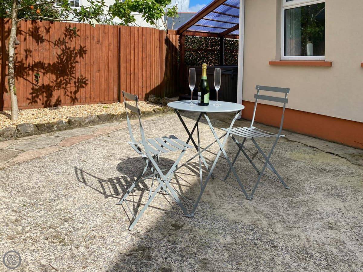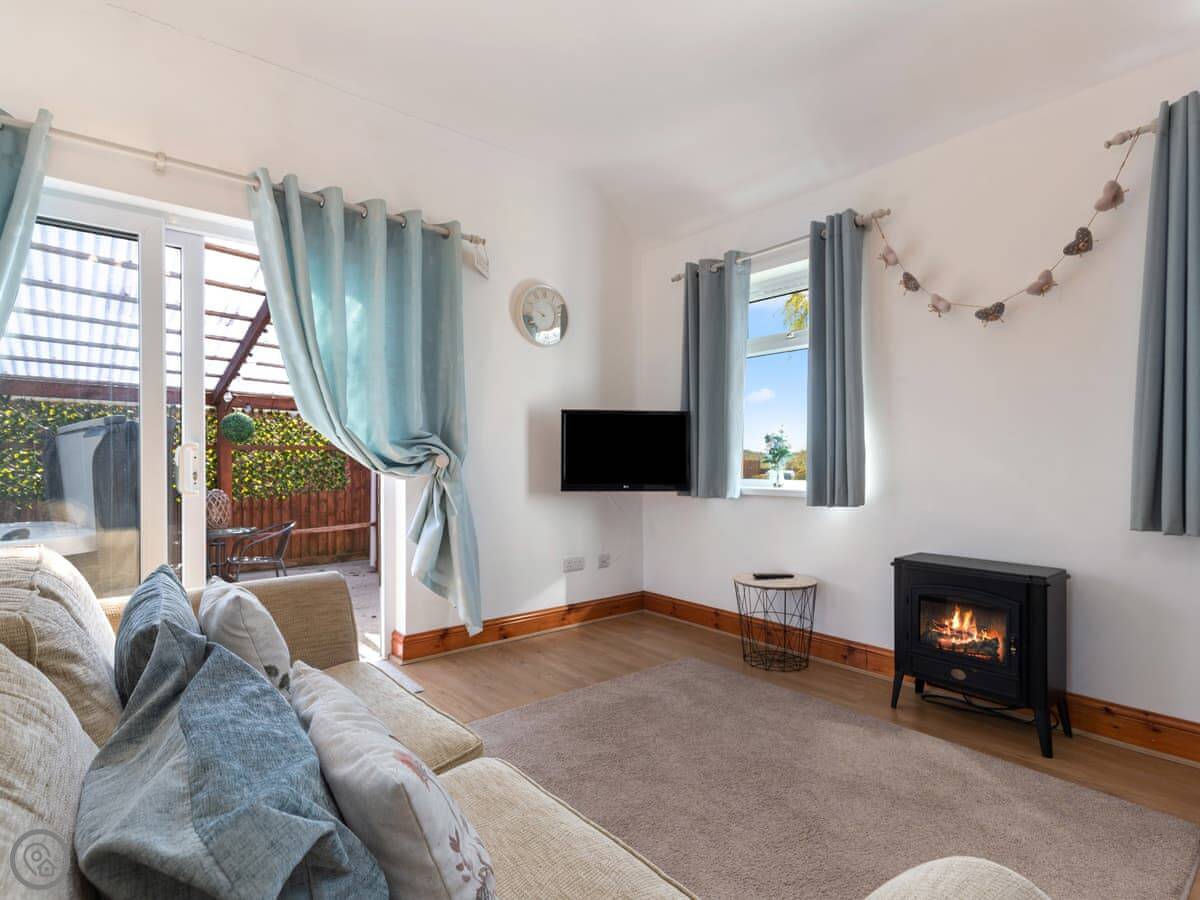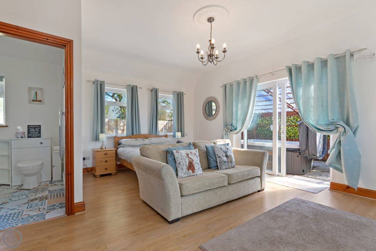 The Cwtch offers an open plan, contemporary kitchen and dining area, with a table and three chairs. The bedroom/living space is a well designed and stylish area, which has been dressed with, a king-size bed and has a large TV, elegant electric heater and comfortable two-seater sofa. The separate en-suite shower room is a bright area which has a stylish finish. Sliding doors lead out to a delightful, private courtyard with a hot tub which is romantically lit with with lights above. You’ll also find a table and chairs along with a firepit, perfect for some alfresco dining. The property has been finished to a high standard throughout.