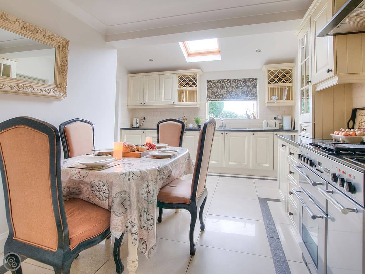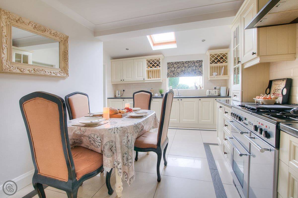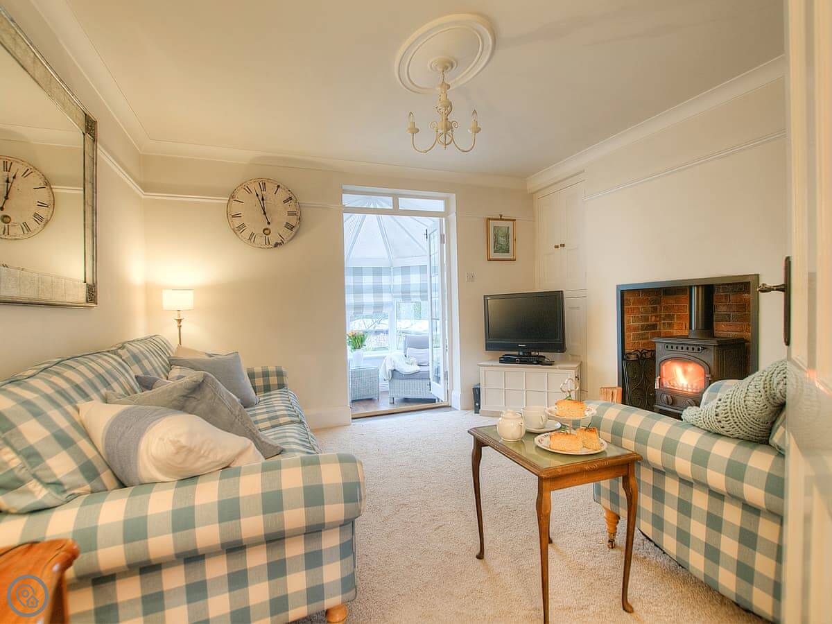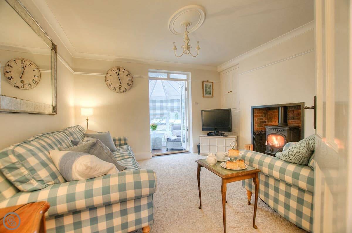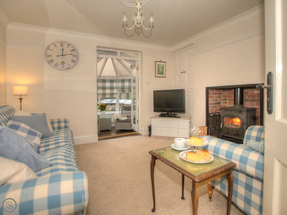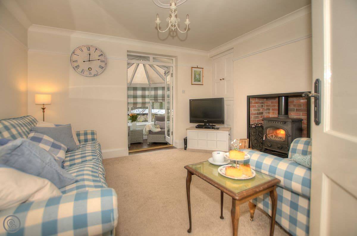 The house is warm. It's got a wood-burner in the snug and a new heat pump system for the central heating. There are two living areas: one with a bay window and another that leads into a conservatory. The kitchen has a Range cooker. Outside, there's a decked balcony off the conservatory and a garden with a lawn and a big outdoor table.