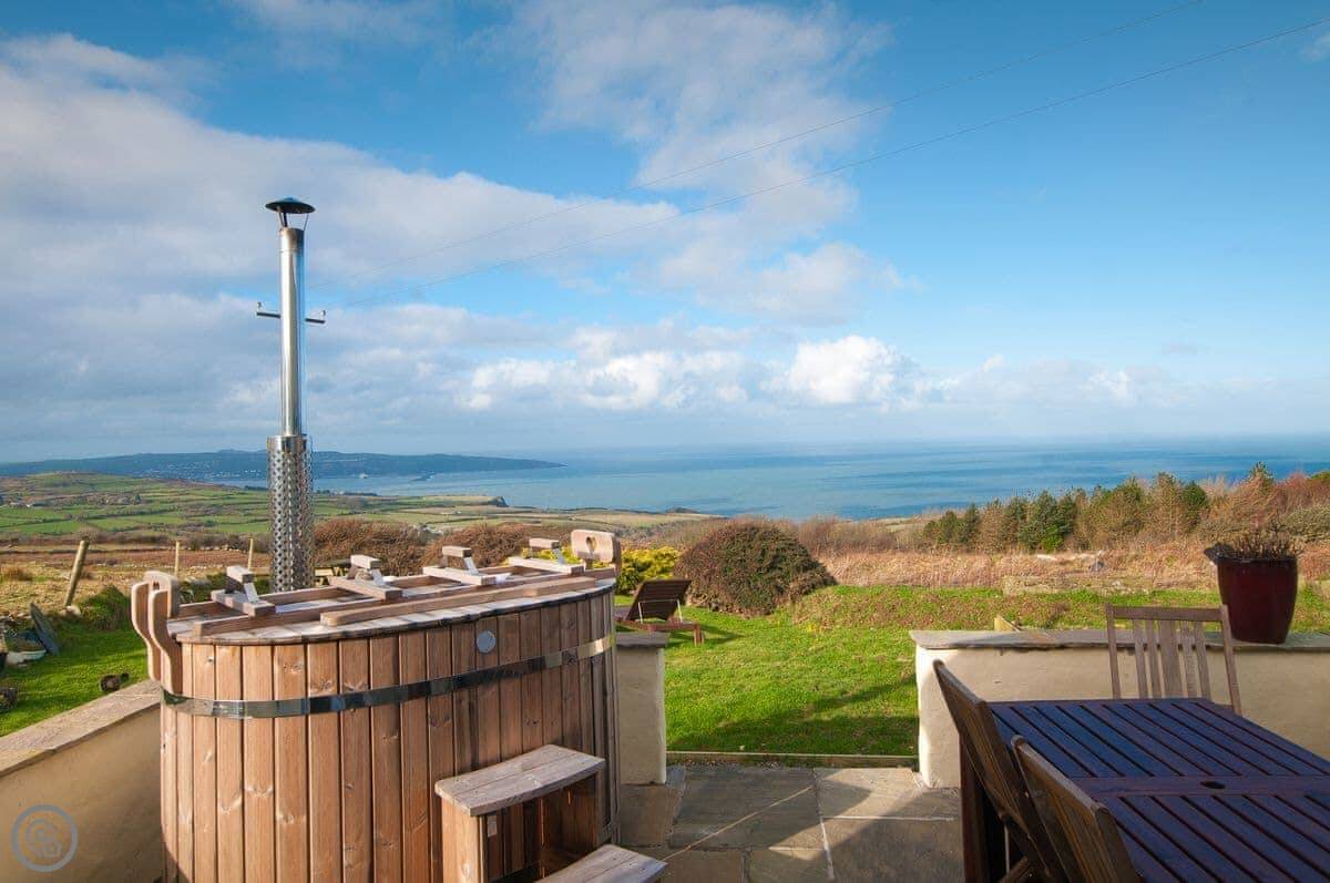 A convenient utility room is equipped with a washing machine and tumble dryer. The rear cloak room with ample hanging space is an ideal place to leave walking boots and beach toys. Pretty cottage bedrooms, 1 king-size on the ground floor, 1 king-size and twin bedroom on the first floor provide every comfort for a restful night’s sleep. The enclosed garden with wood stove heated hot tub, barbecue, and wooden garden furniture extends the living space for socialising and alfresco meals.