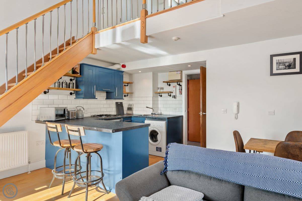 The beautiful apartment includes an open plan living, kitchen and dining area featuring the most amazing view of the marina. Within the kitchen are the appliances and utensils you need when cooking the perfect meal to be enjoyed after an adventurous day exploring the ins and outs of the glorious city. The exceptional property provides you with two bedrooms, both including kingsize beds to assure quality and comfort is received, also a large family bathroom is elegantly finished with a freestanding bath with a shower. This family and pet-friendly apartment offers you style and comfort. The local artwork and wooden theme throughout all come together to give the setting its own special character. At the rear of the property, you will find your own private parking space.