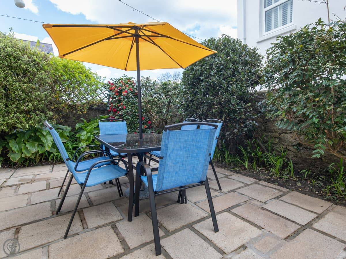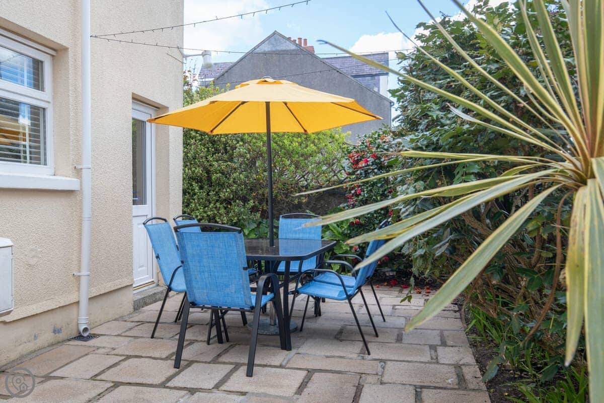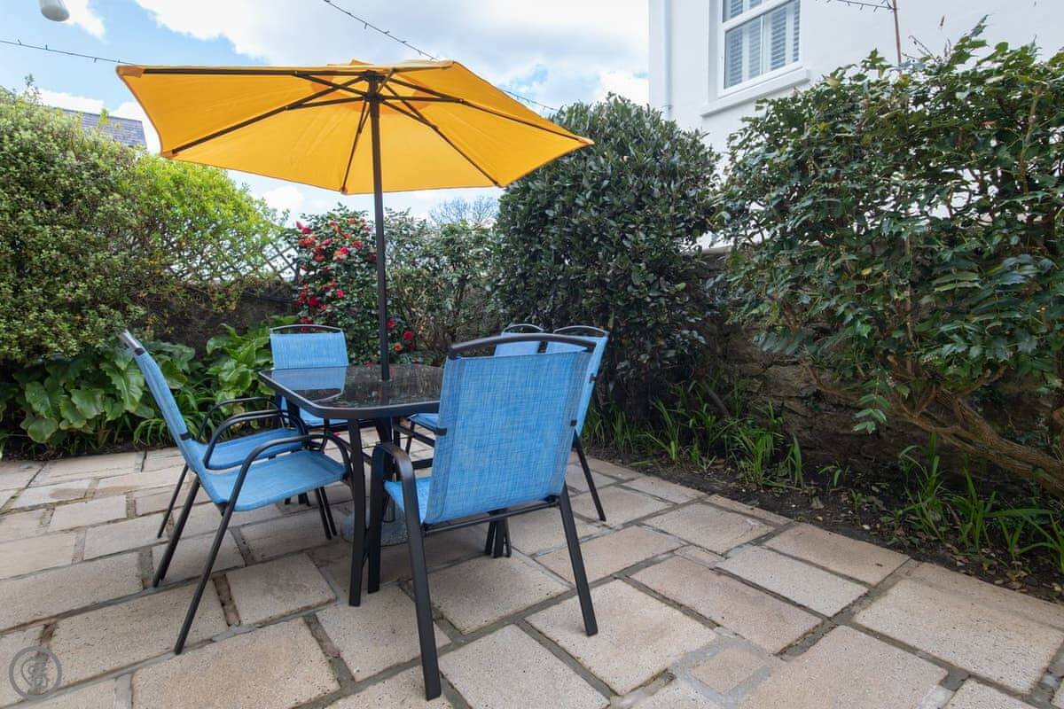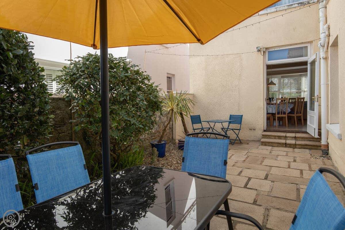 Out the back is a small courtyard. It's walled in. There's a bistro set and a larger table with a parasol. It gets the sun in the morning.