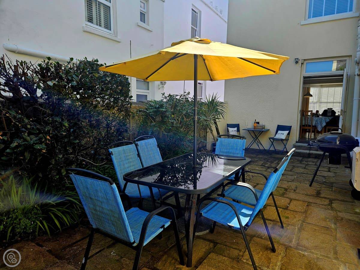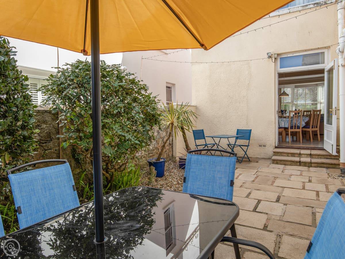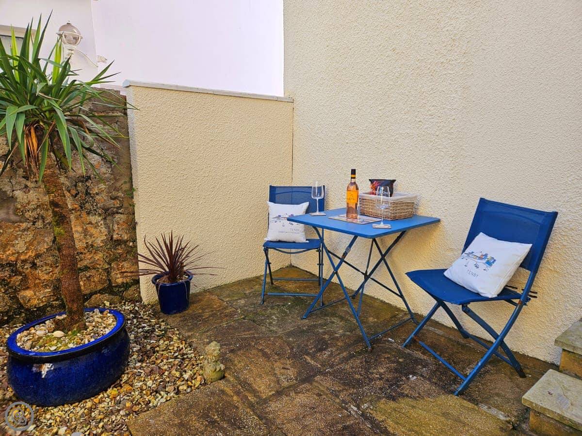 Out the back is a small courtyard. It's walled in. There's a bistro set and a larger table with a parasol. It gets the sun in the morning.