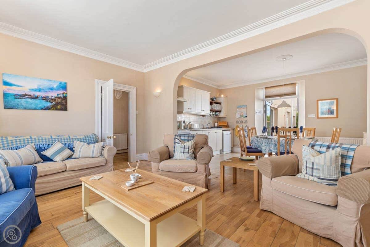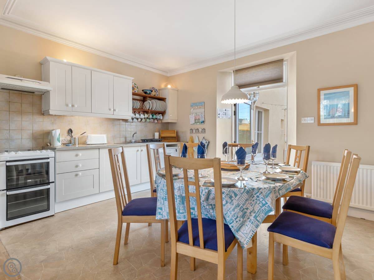 Downstairs is mostly open plan. Kitchen, dining table, living area. Through a door at the back there's a second sitting room with a big corner sofa and a TV. That's handy if people want to split up.