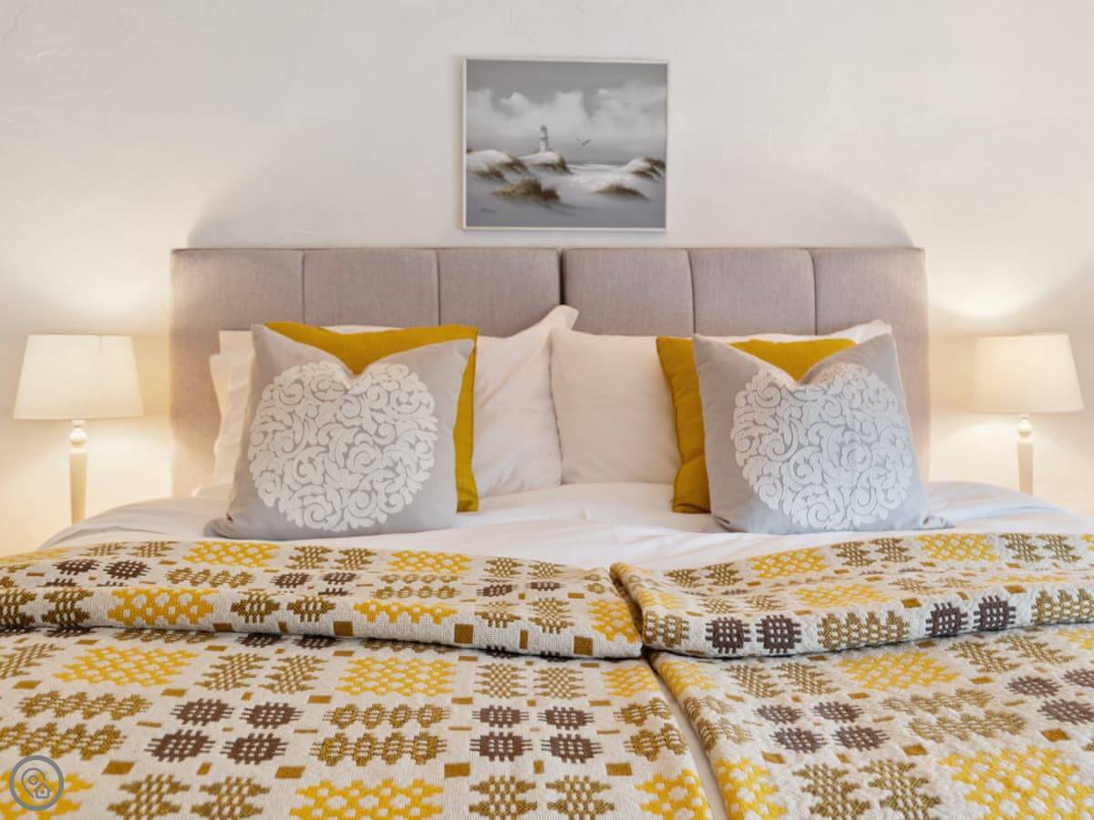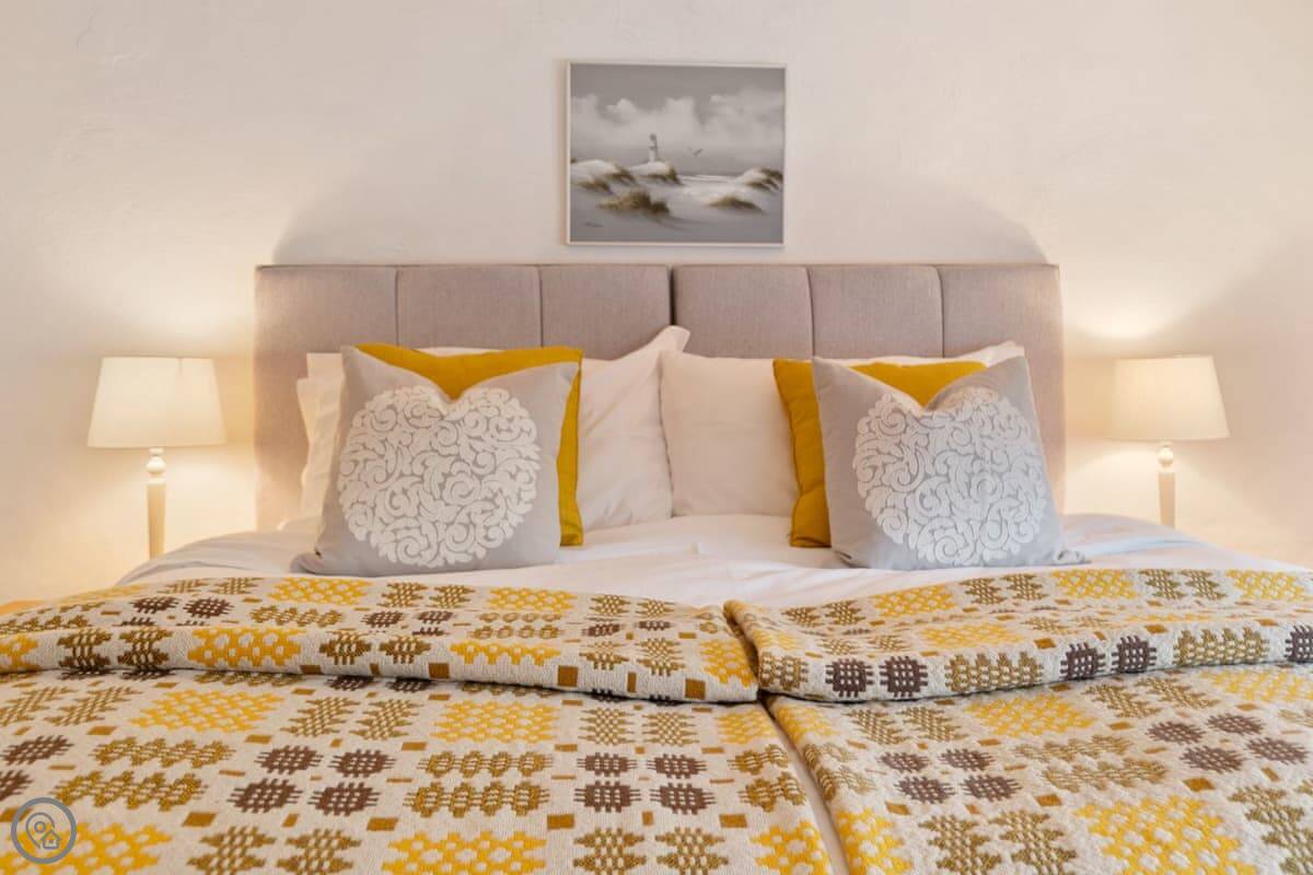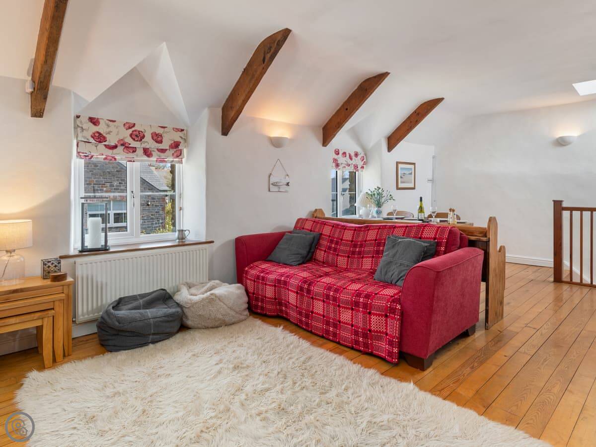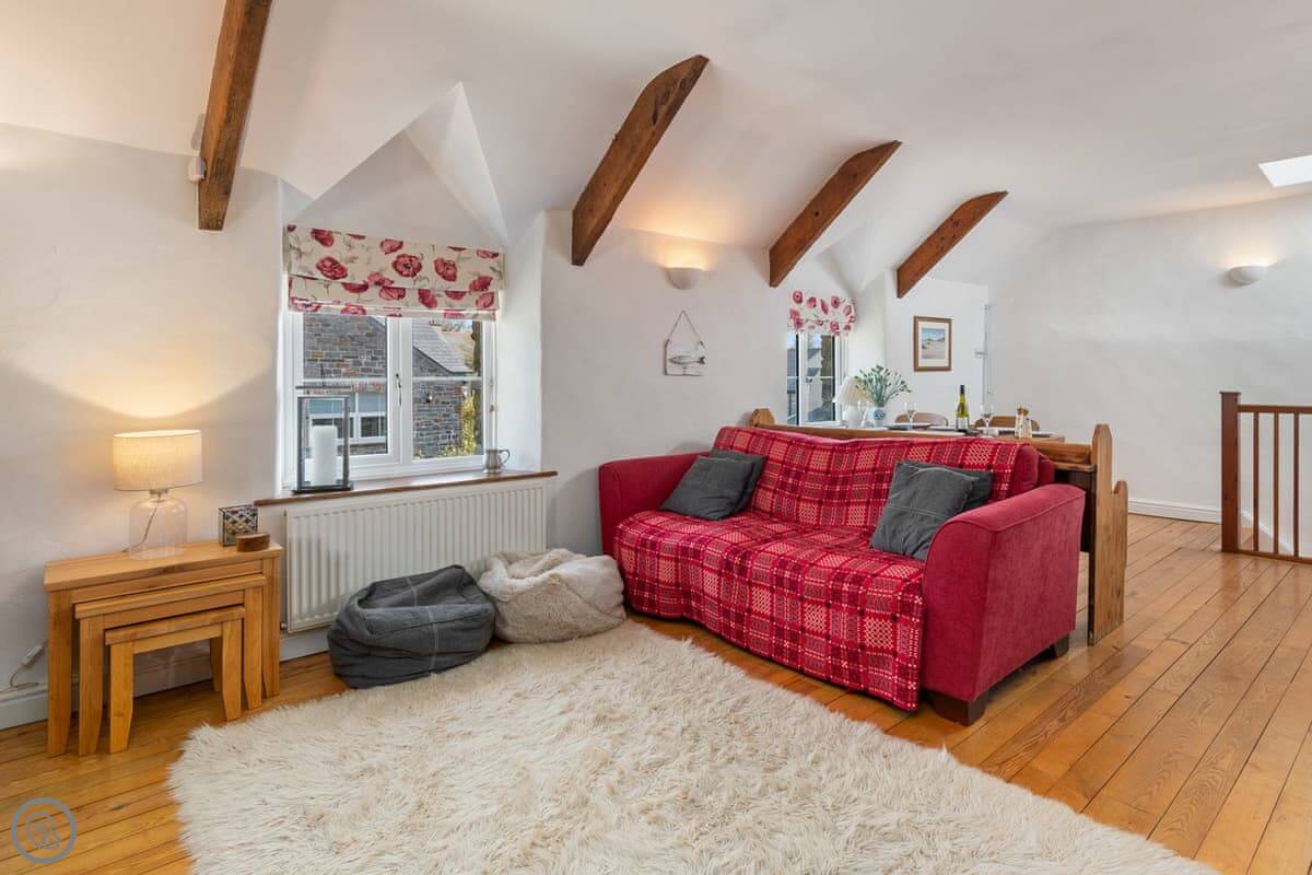 It sleeps four. Two bedrooms, one bathroom. It has a 4 Star rating. The living space is all on one level. One bedroom is downstairs off the living room. The other is up a flight of stairs. Those stairs are quite steep and narrow, typical for a cottage.