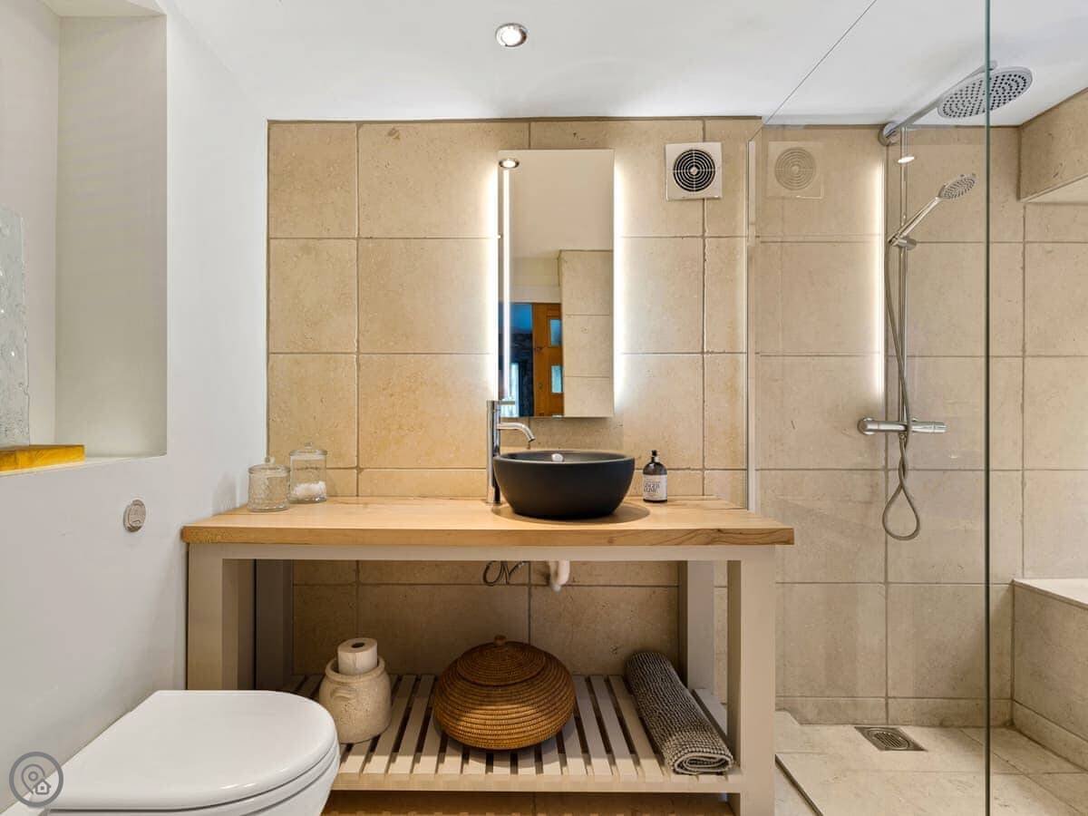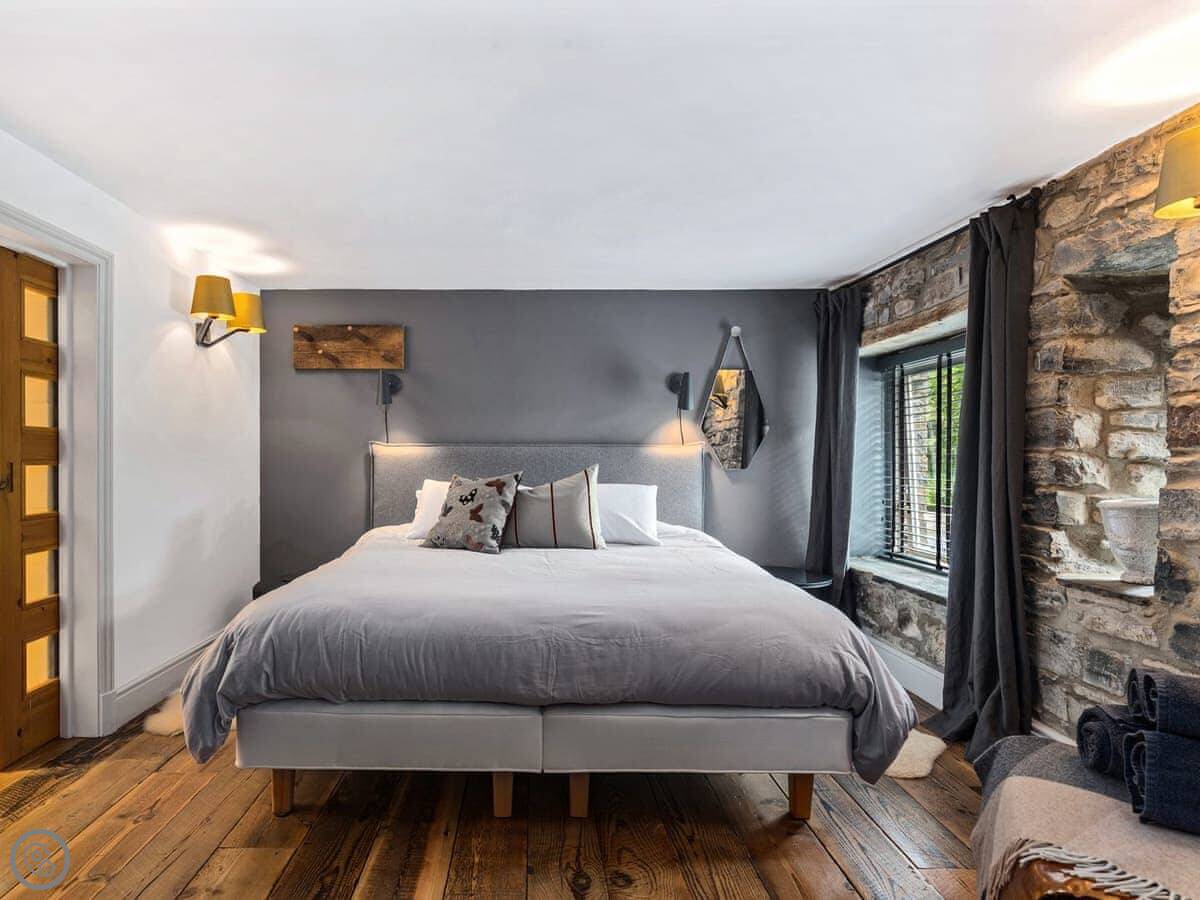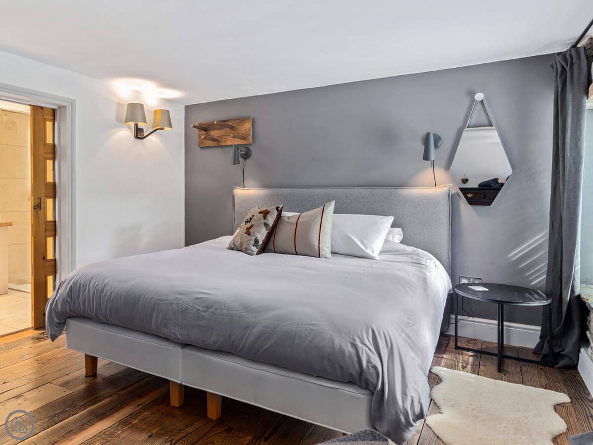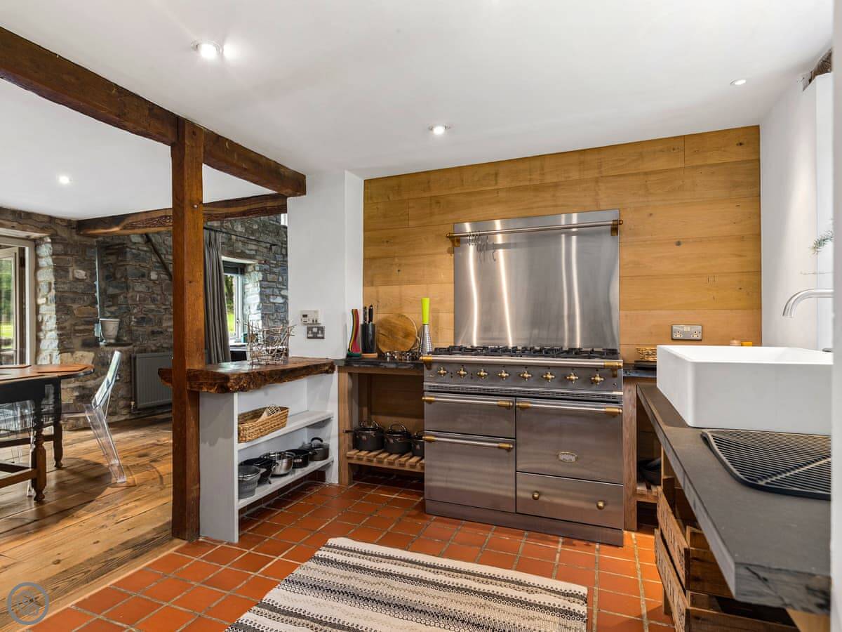 It sleeps six. Three bedrooms, two bathrooms. One of those bathrooms is an en-suite off the main bedroom. We did the kitchen new, so it's got a dishwasher and all that. There's a woodburning stove in the main room.