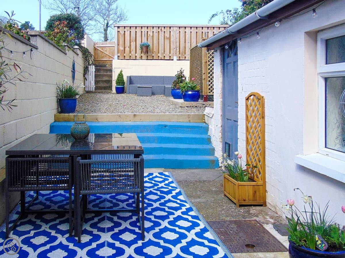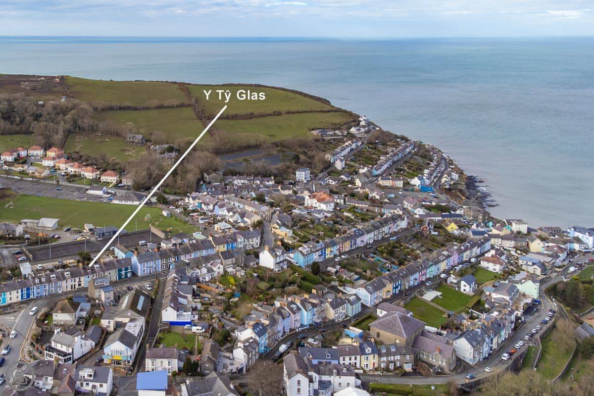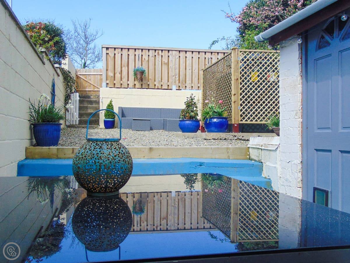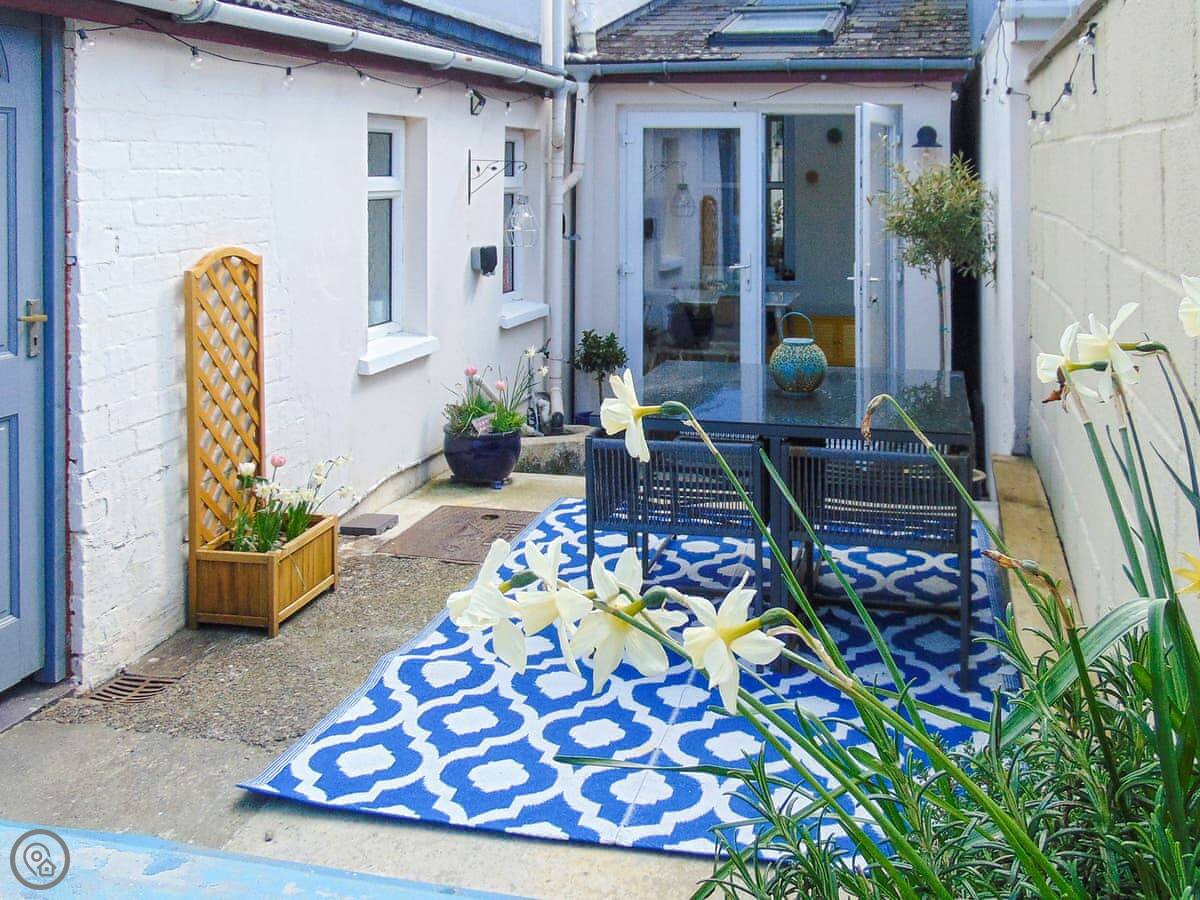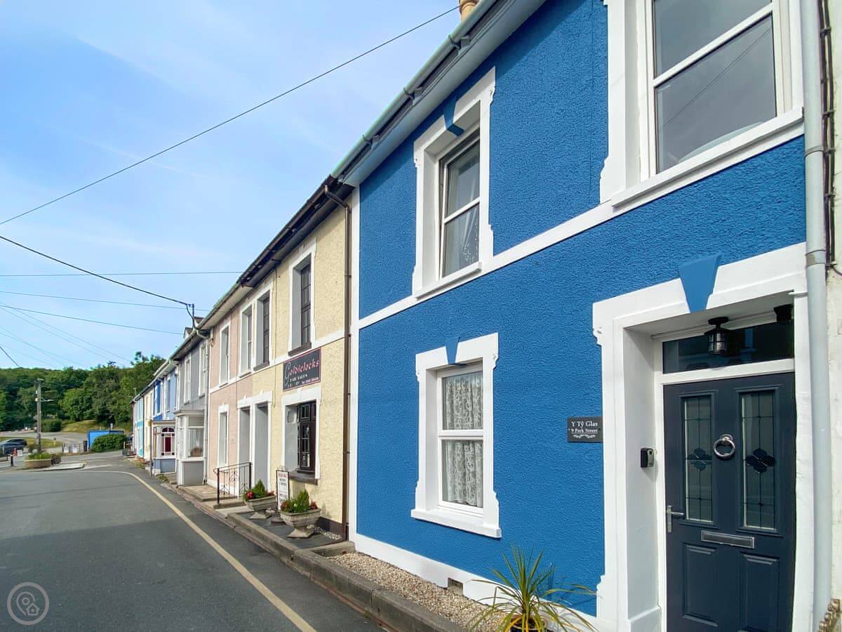 Y Ty Glas is in New Quay, a few minutes walk up from the harbour. It's a terraced cottage, painted the slate grey-blue colour it's named after. You've got your own courtyard garden out the back. It's a suntrap and it's enclosed, which is good if you've got kids or a dog.