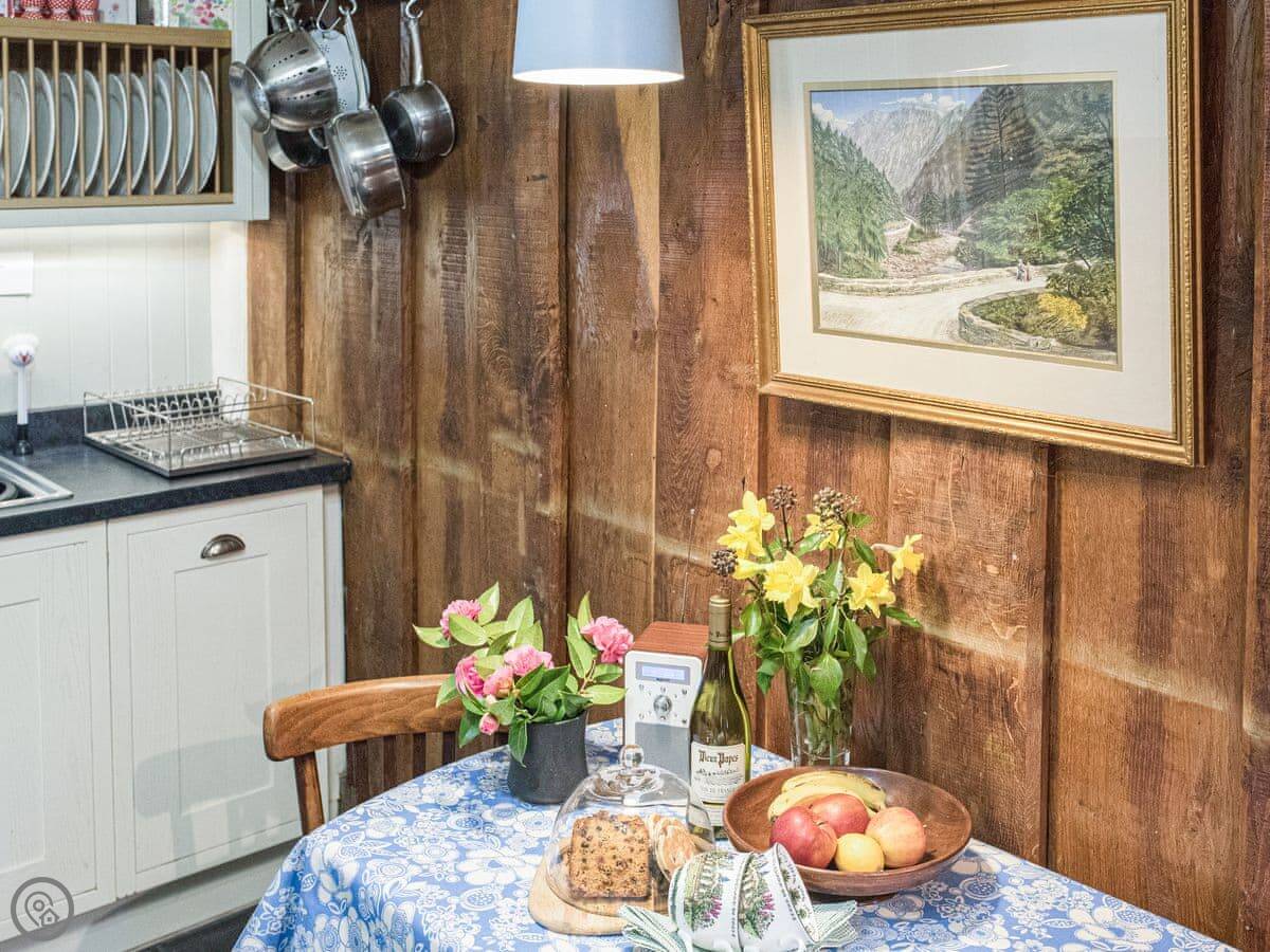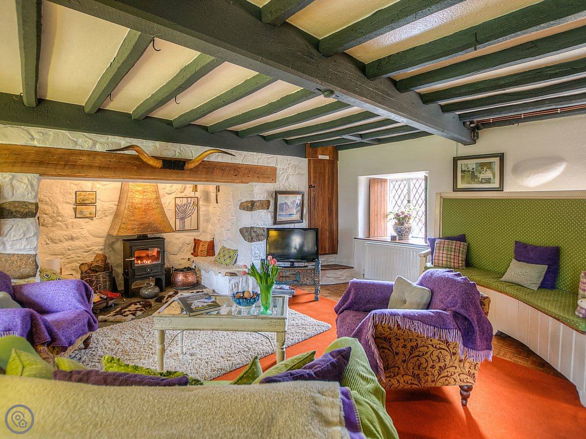 The main thing about the place is its age. They tested the wood and it's from 1550. There's a big inglenook fireplace with a wood burner. It's very good at heating the whole room when lit.
