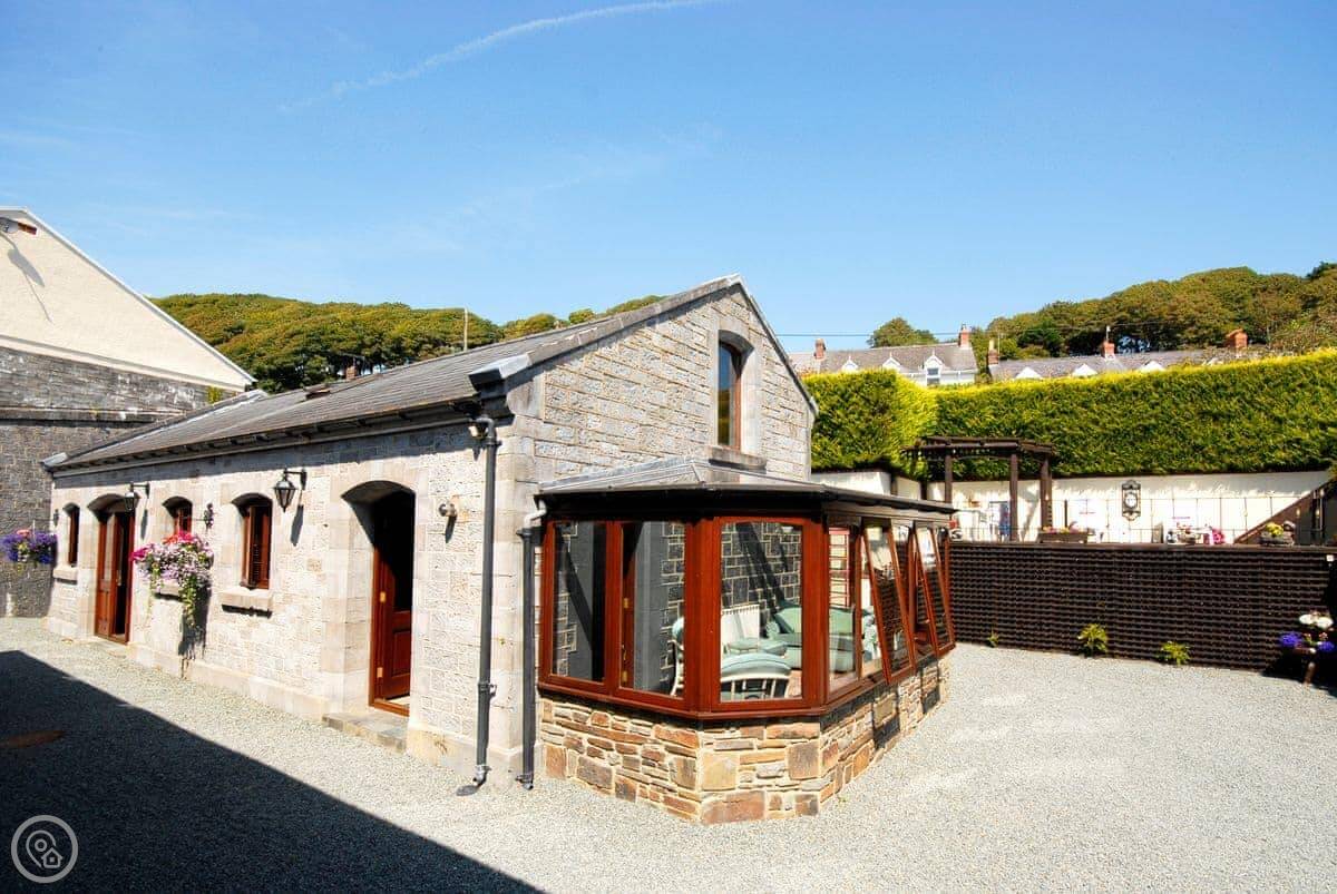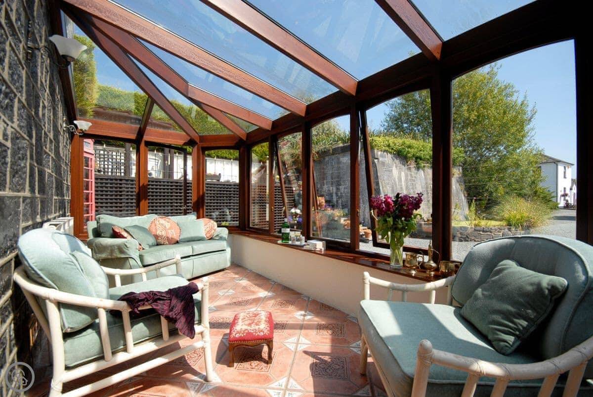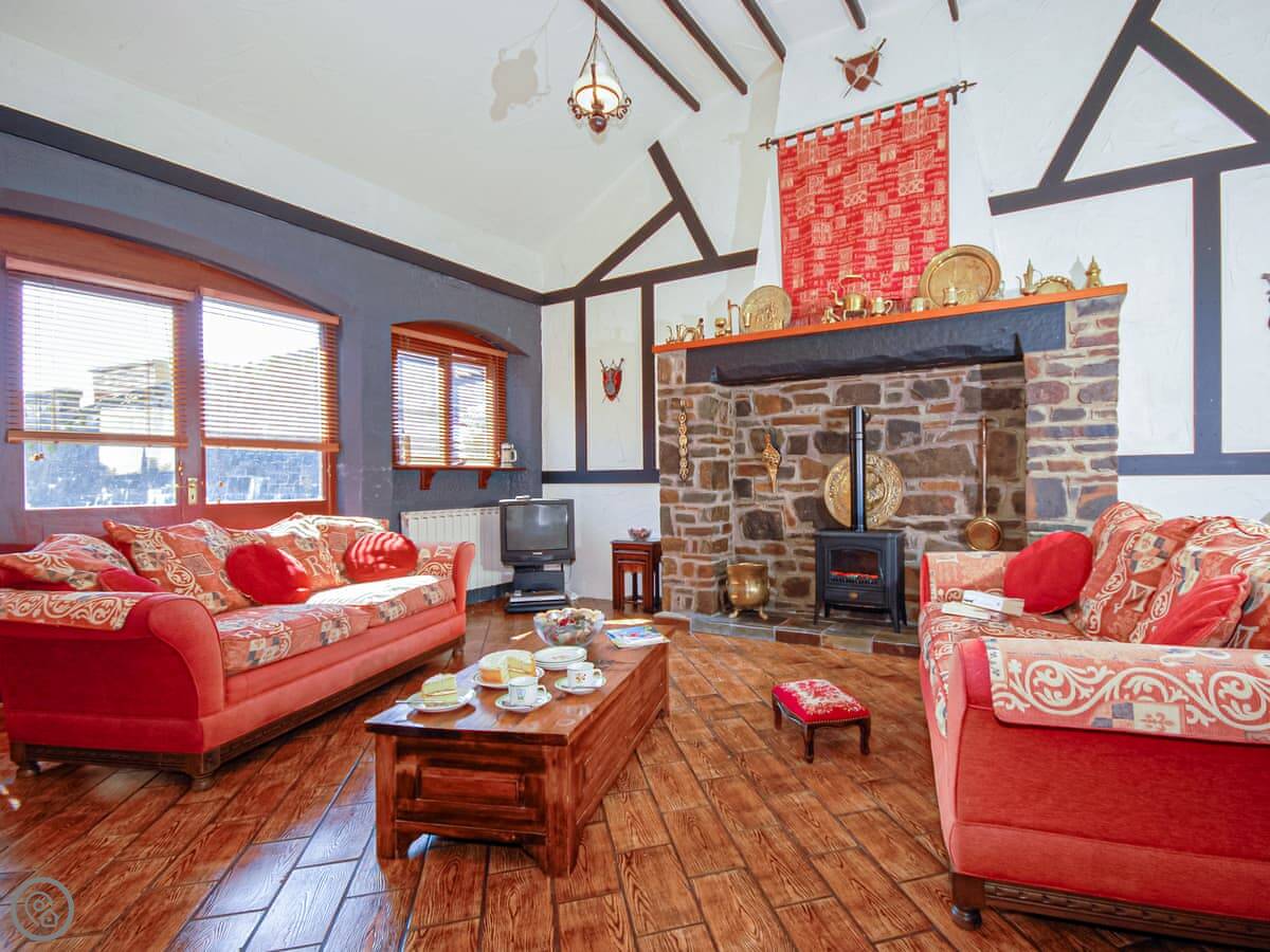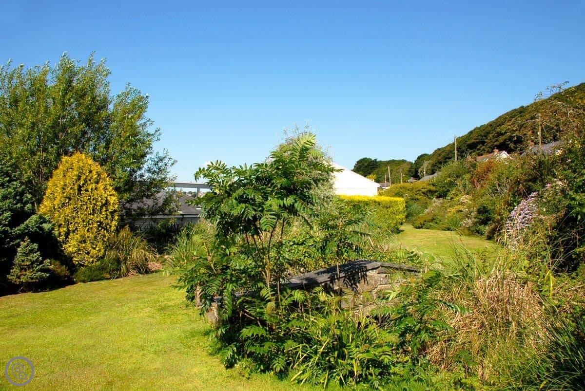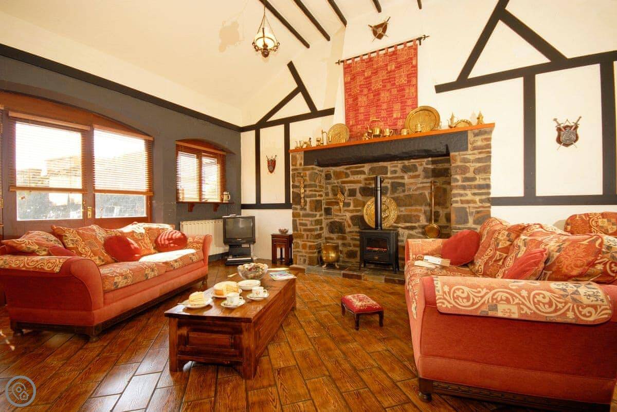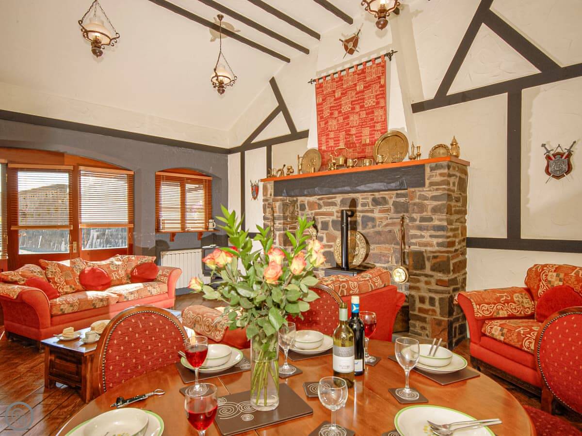 The main room has an inglenook fireplace with a wood burner. It looks out over the gardens. The gardens are large and landscaped, with lawns, seating areas, and a lily pond. You can also fish off the old jetty or the property walls.