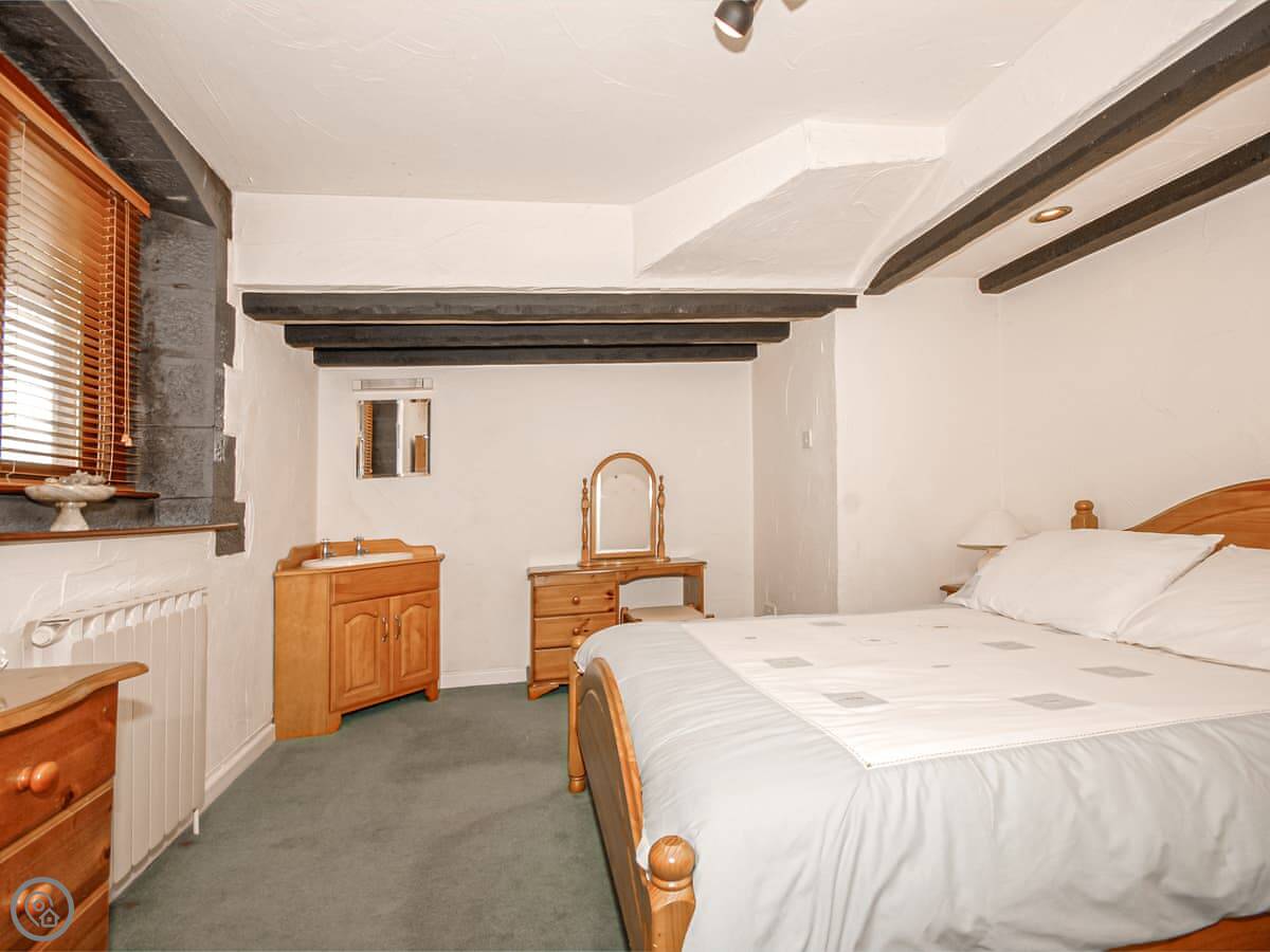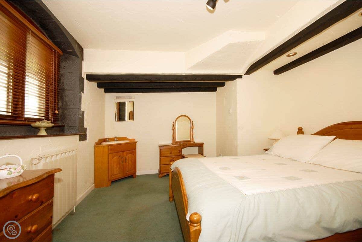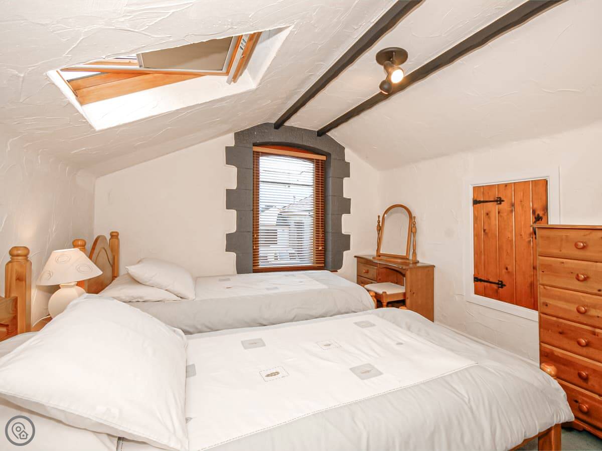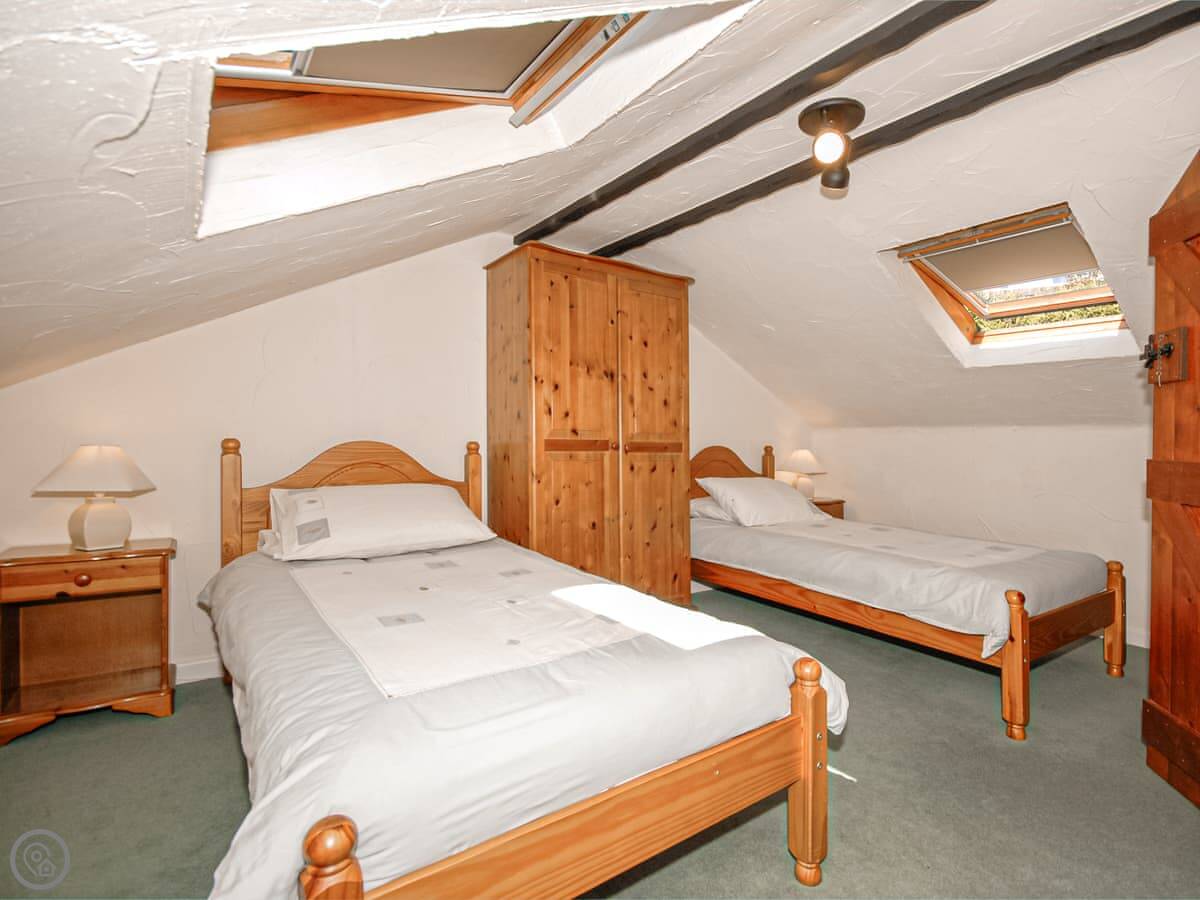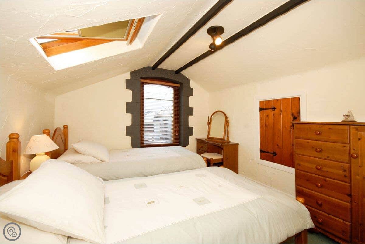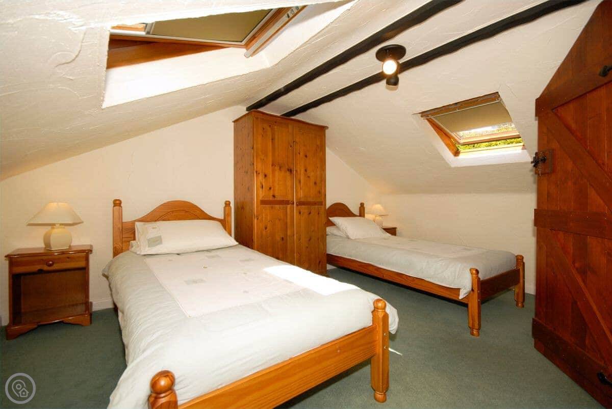 It sleeps six. Three bedrooms, one bathroom. It's got a 5 Star rating, which means it's well equipped and comfortable. The bedrooms have some unusual shapes because of the roof beams. One has roof windows in the ceiling, so you can see the sky from bed.
