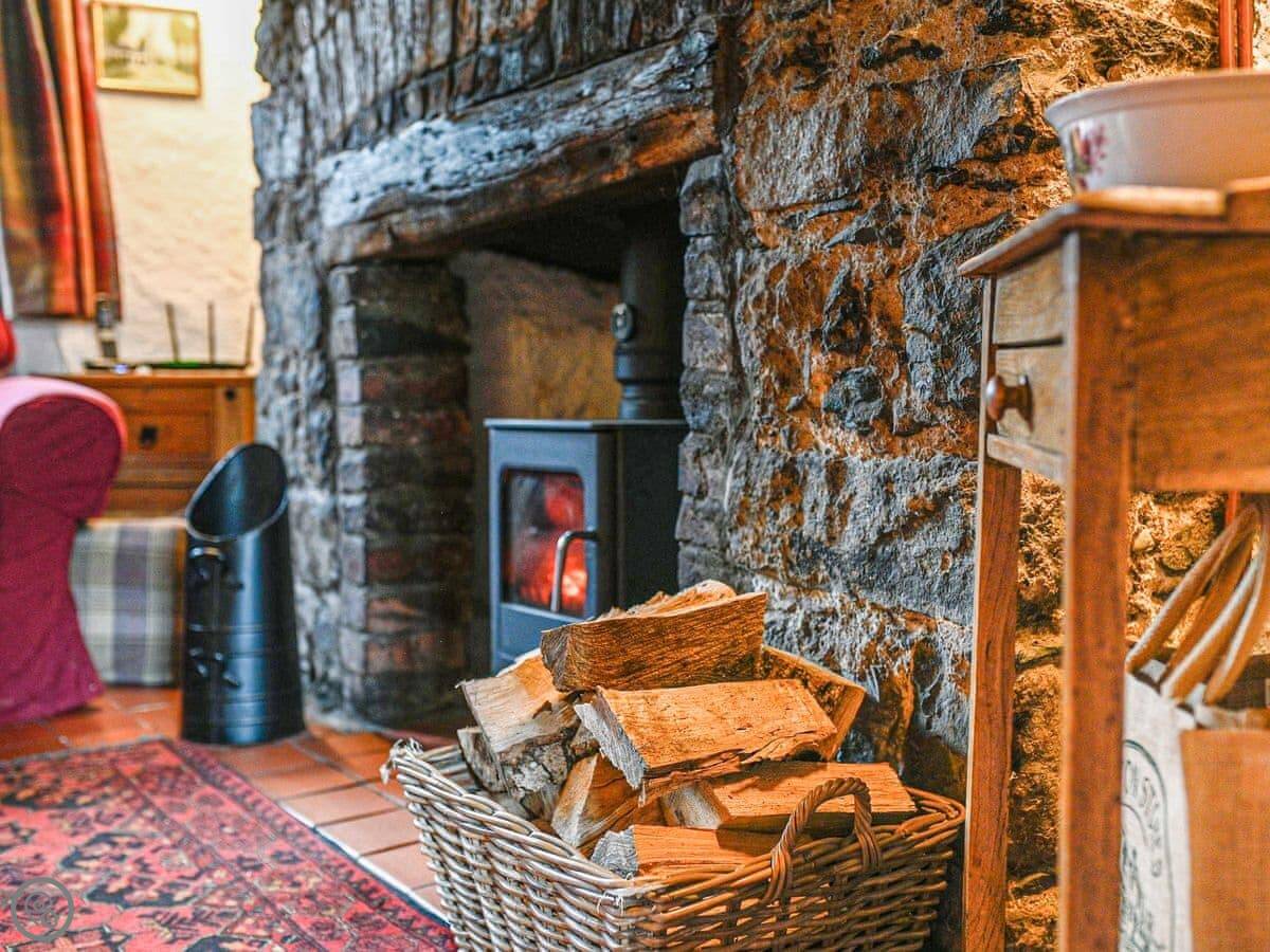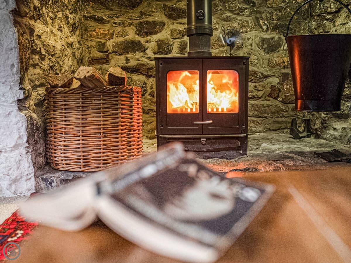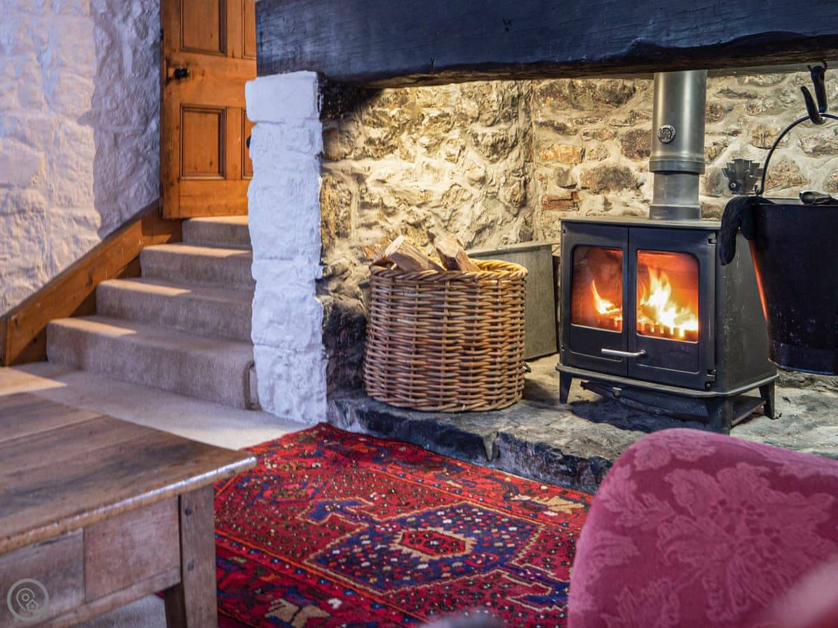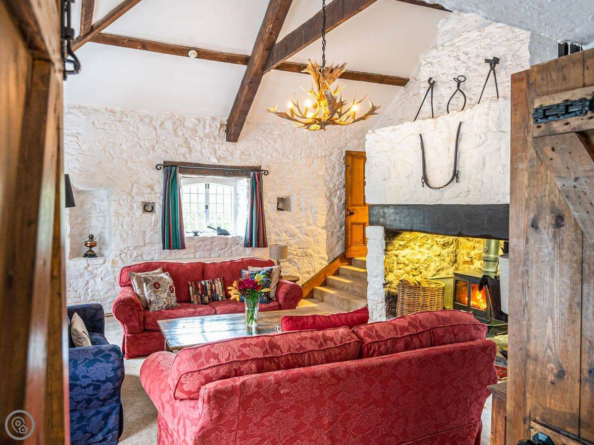 It's got a 4 Star rating, which means it's comfortable and well-equipped. The main living room has high ceilings and a big fireplace. It's a nice room to sit in. The kitchen has a sofa and a wood burner in it, so it's a social space. There's a Rangemaster cooker, a dishwasher, and a washing machine.