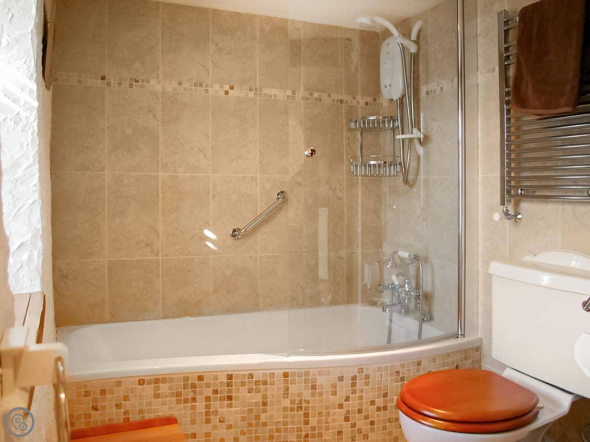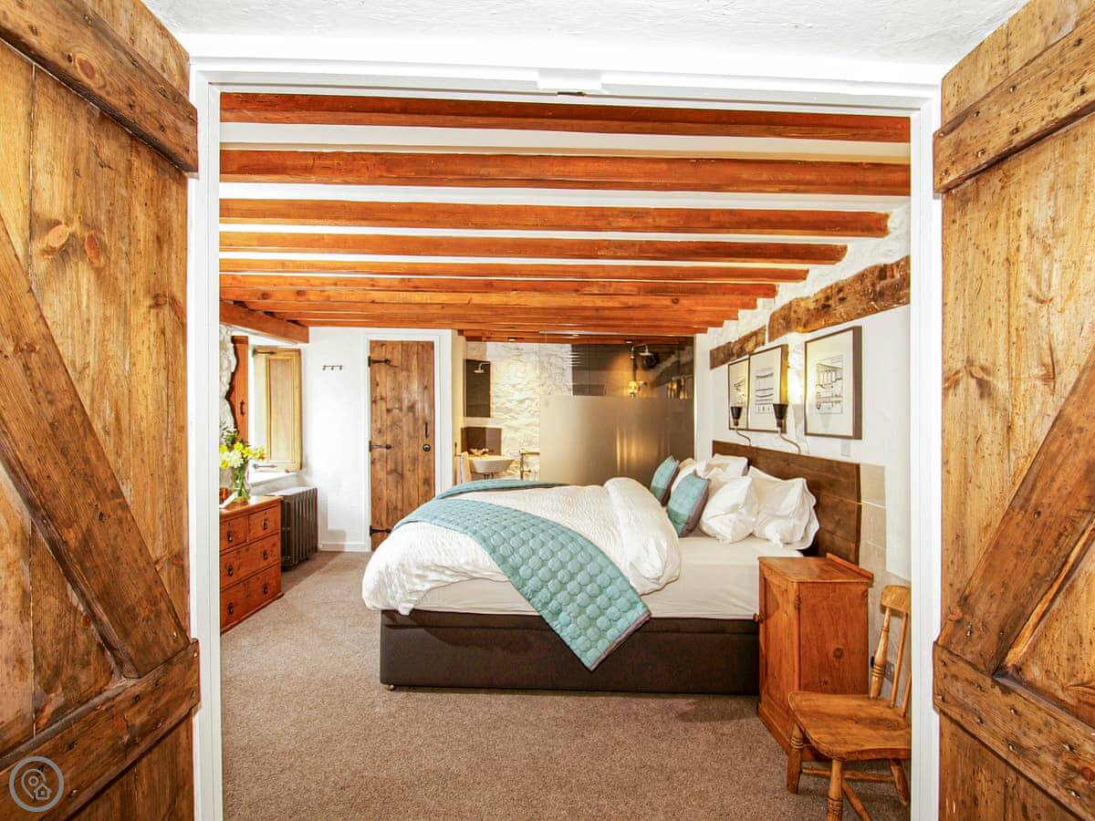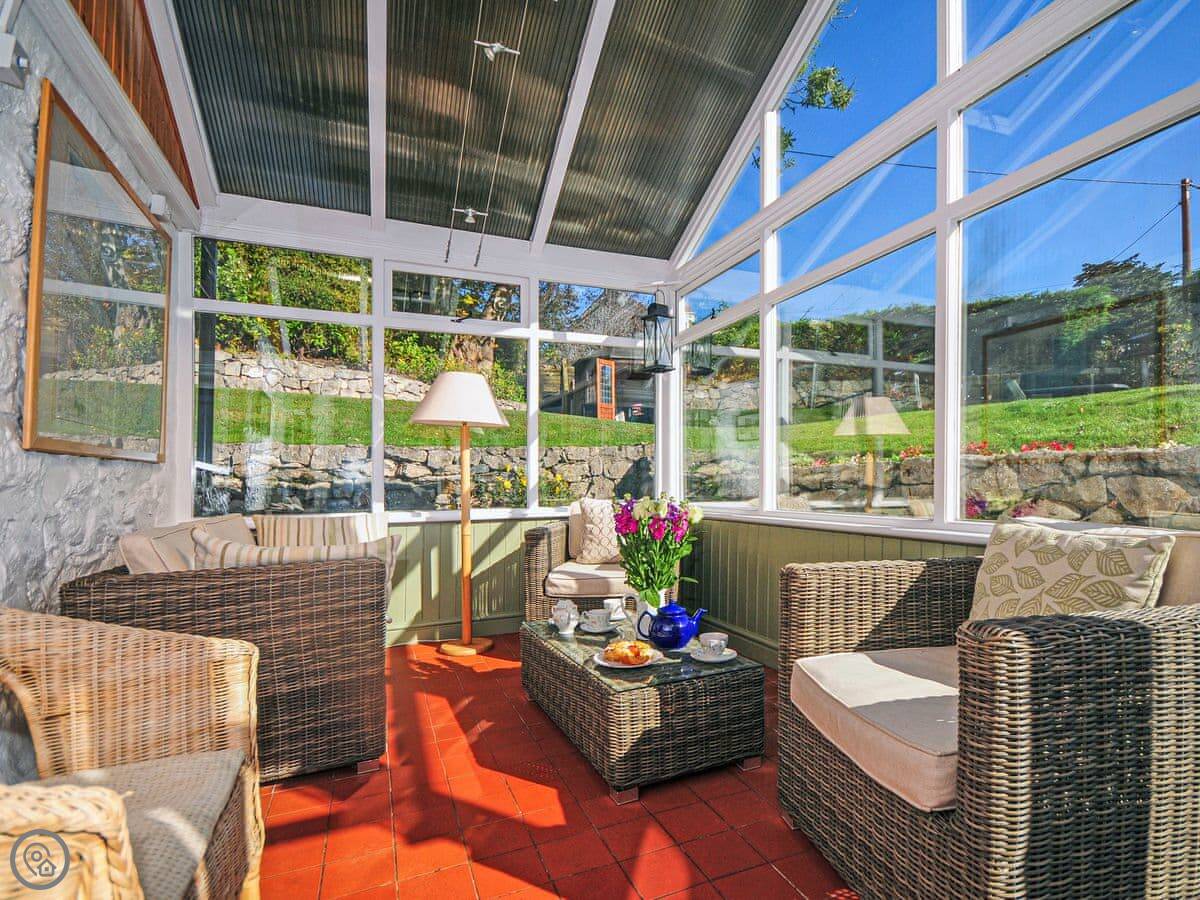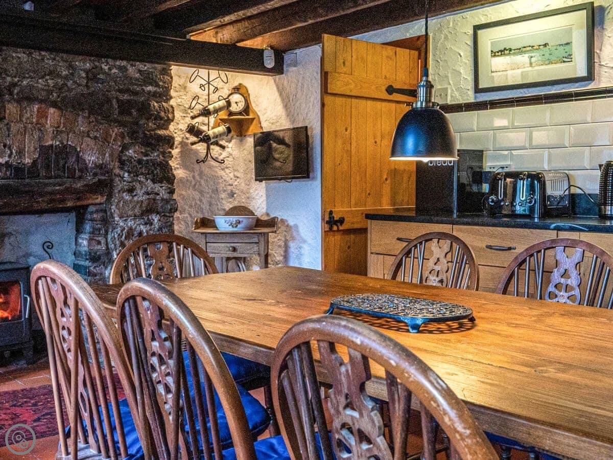 It's got a 4 Star rating, which means it's comfortable and well-equipped. The main living room has high ceilings and a big fireplace. It's a nice room to sit in. The kitchen has a sofa and a wood burner in it, so it's a social space. There's a Rangemaster cooker, a dishwasher, and a washing machine.