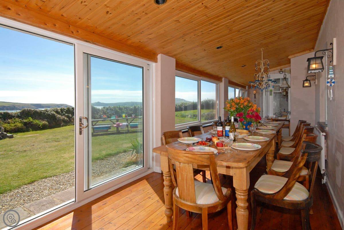 On cooler days, the views can still be enjoyed from the enclosed veranda, having a leisurely coffee break or over dinner at the large family dining table. Inside St Justinians has the feel of a New England harbour house with high ceiling rooms, off a central hallway. All of the accommodation is on one level, making this ideal for all members of the family. There are a variety of bedroom sizes to suit every guest, and a homely snug to put your feet up after a hard day exploring the St Davids peninsula. Beach 1 mile. Pub and restaurant 2 miles.