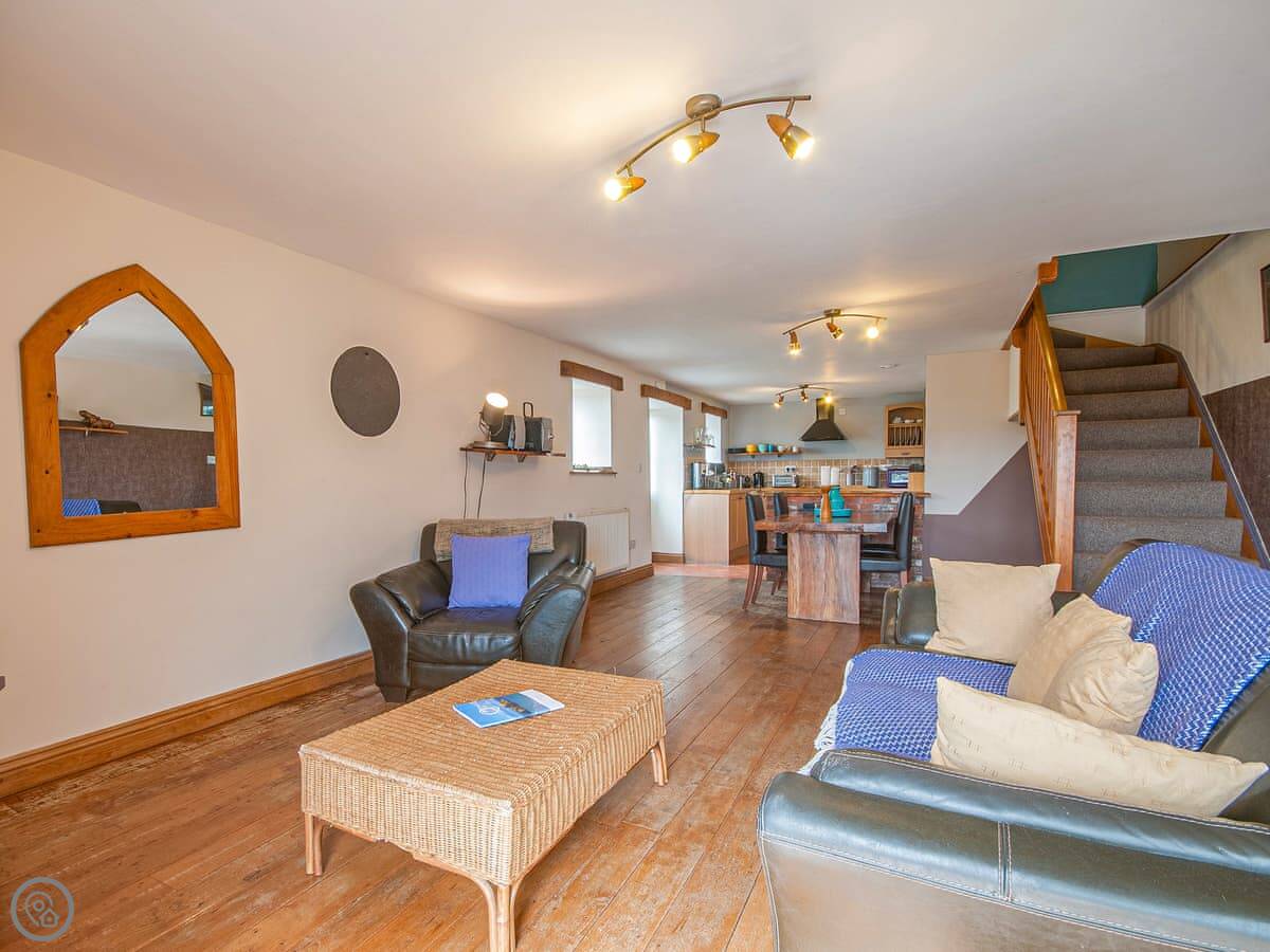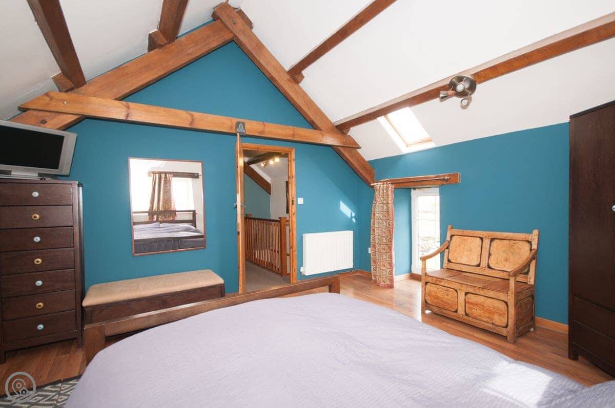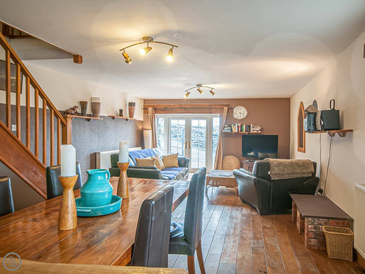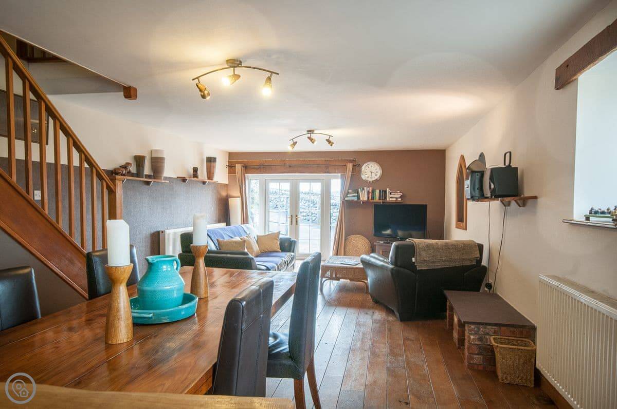 Furnished and decorated in a comfortable, stylish contemporary theme with open plan living/kitchen and French doors opening onto patio. Beamed ceilings and latch doors complement the stylish solid wood dining table and country chairs of this Snowdonia holiday cottage. On the first floor, you will find two bedrooms which are spacious, with lovely views of the spectacular countryside. There is also a bathroom on this floor with walk-in shower.