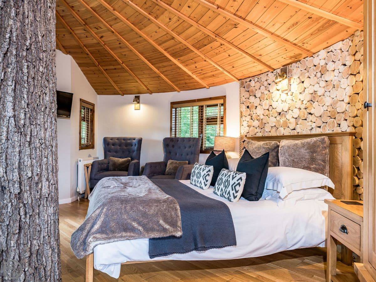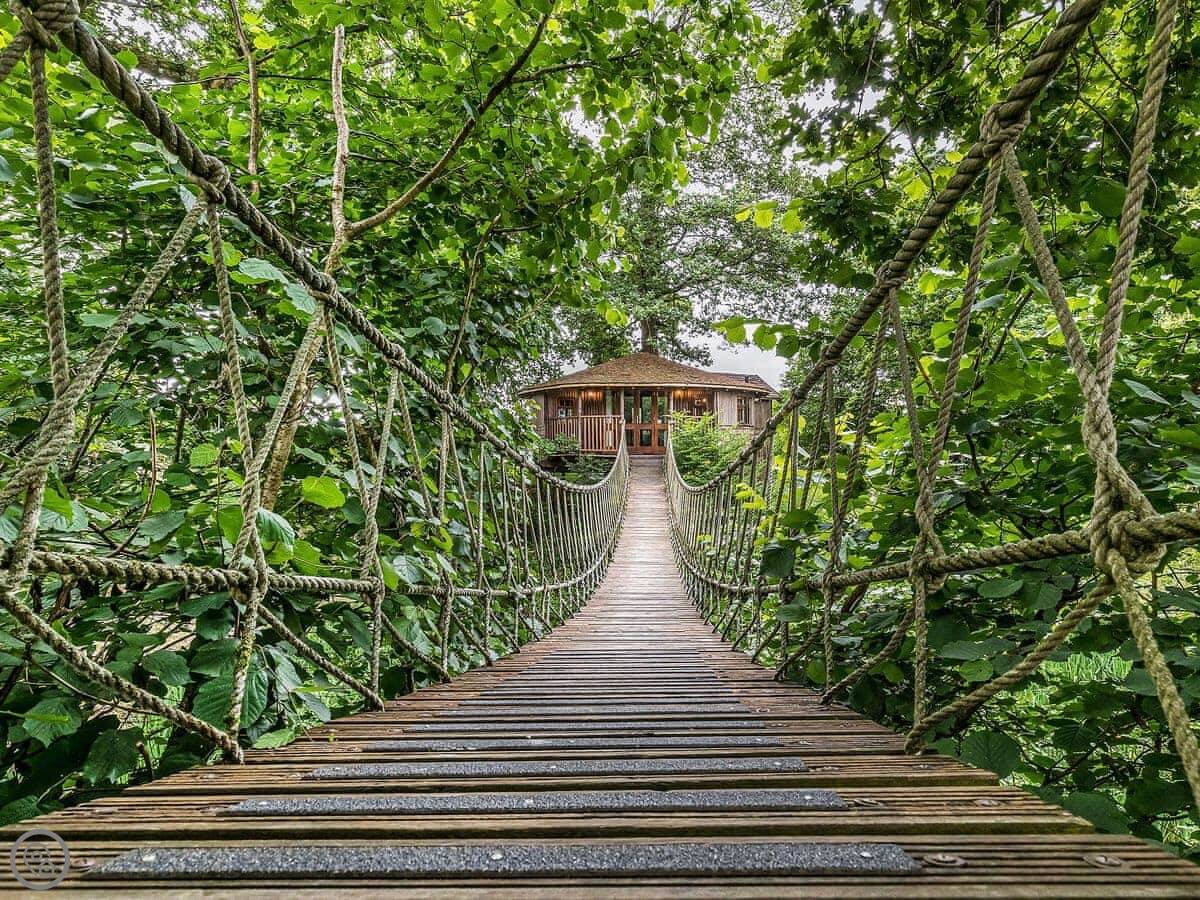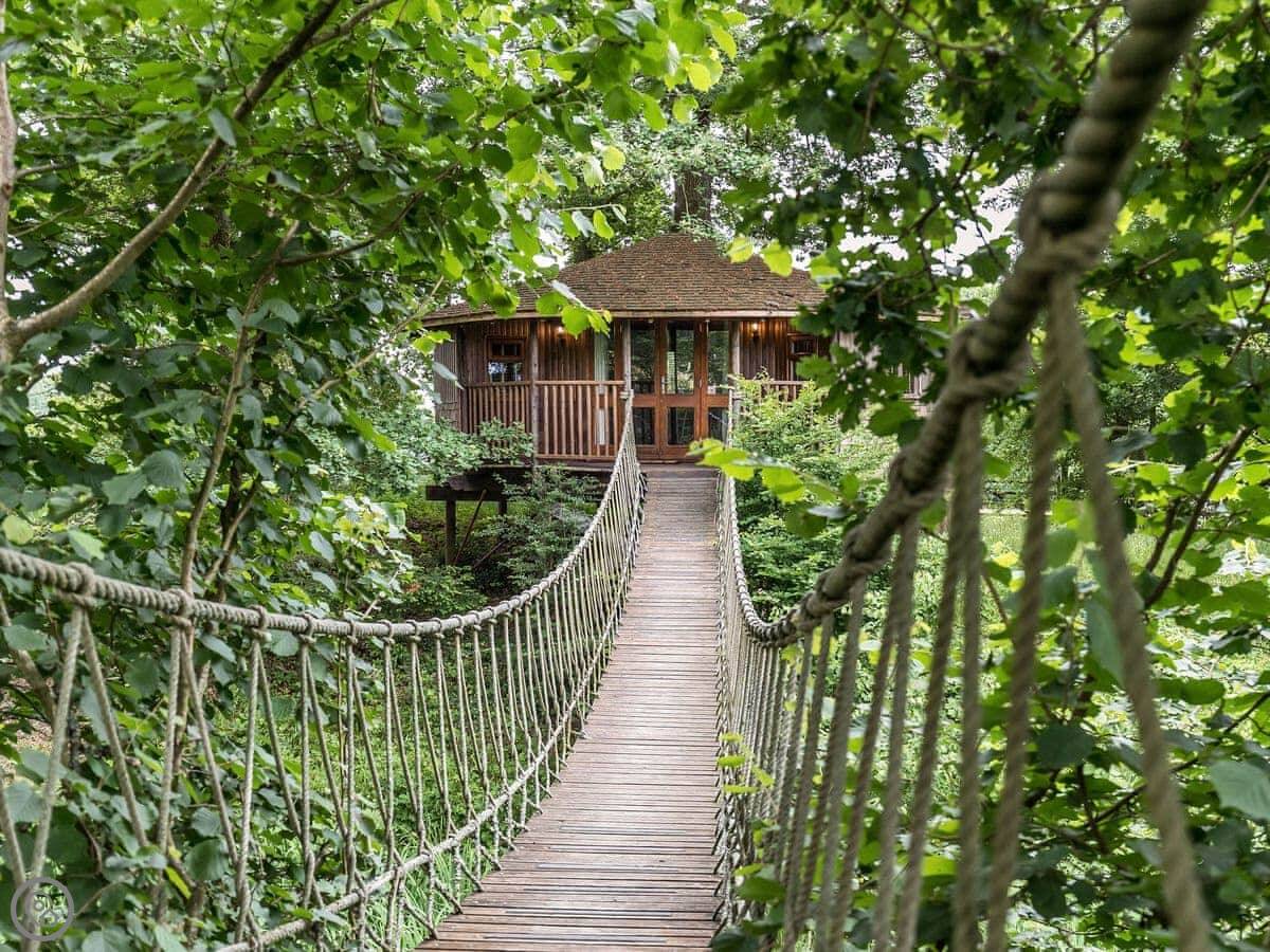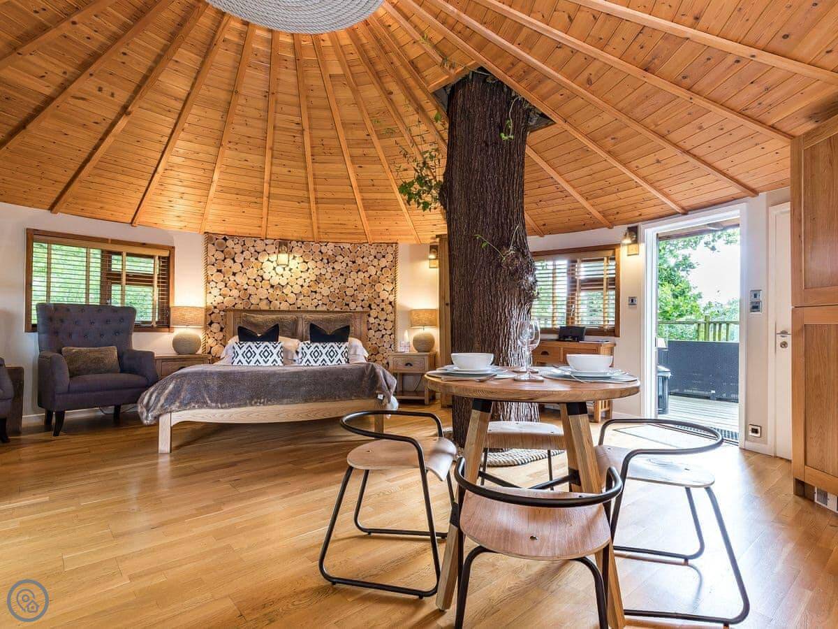 Crossing the rope bridge takes you back to magical childhood dreams and forward into a grown-up tree-house retreat. A spacious open-plan interior sweeps around a mature oak tree, while everything is conveniently held within the circular room.