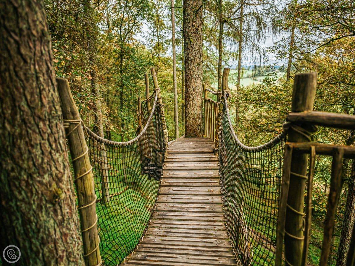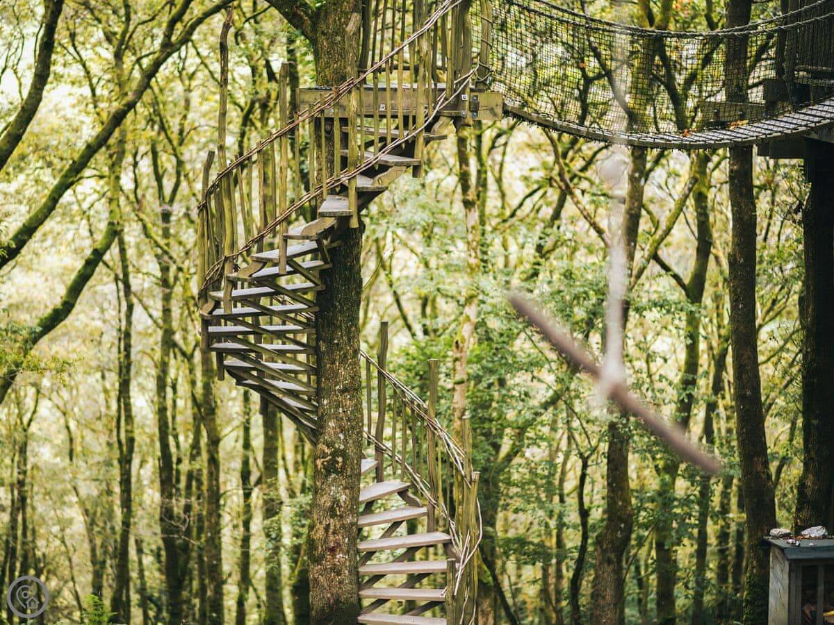 Ty Mawr is a uniquely crafted, rustic treehouse escape in North Wales for a couple, or two adults and up to three children. Each one of these chic tree shelters sleep four - two adults on a hand built, wooden double bed and two children in built-in bunk beds. All beds have views over the woodland from large windows, allowing for star gazing and bird spotting well into the night. The living space is big enough for a family stay, and cosy enough for a couple, with fully equipped kitchen has cooking and washing up facilities, comfortable seating and dining areas, and a central wood burner provides a sepia glow over this simple existence. The shower can be found under the structure, and the compost toilet is on its own platform nearby. Rope bridges, spiral staircases, tree hammocks and streams also add to the experience, allowing the kids and the big kids an amazing, serene experience between the branches.
