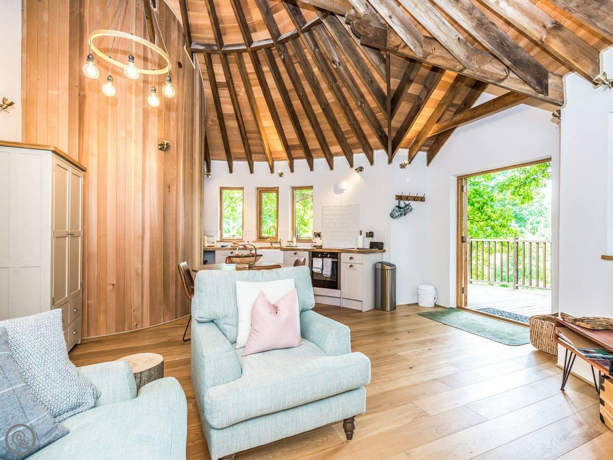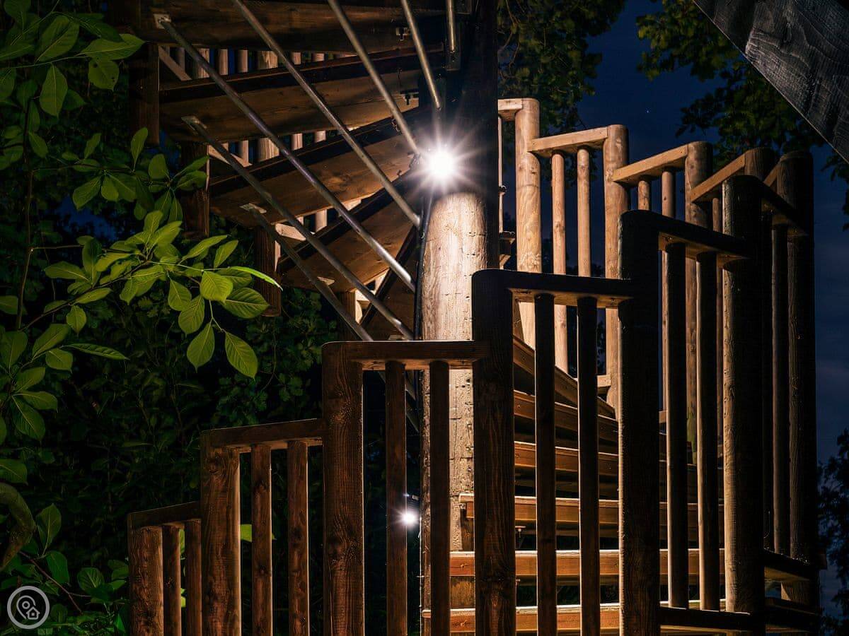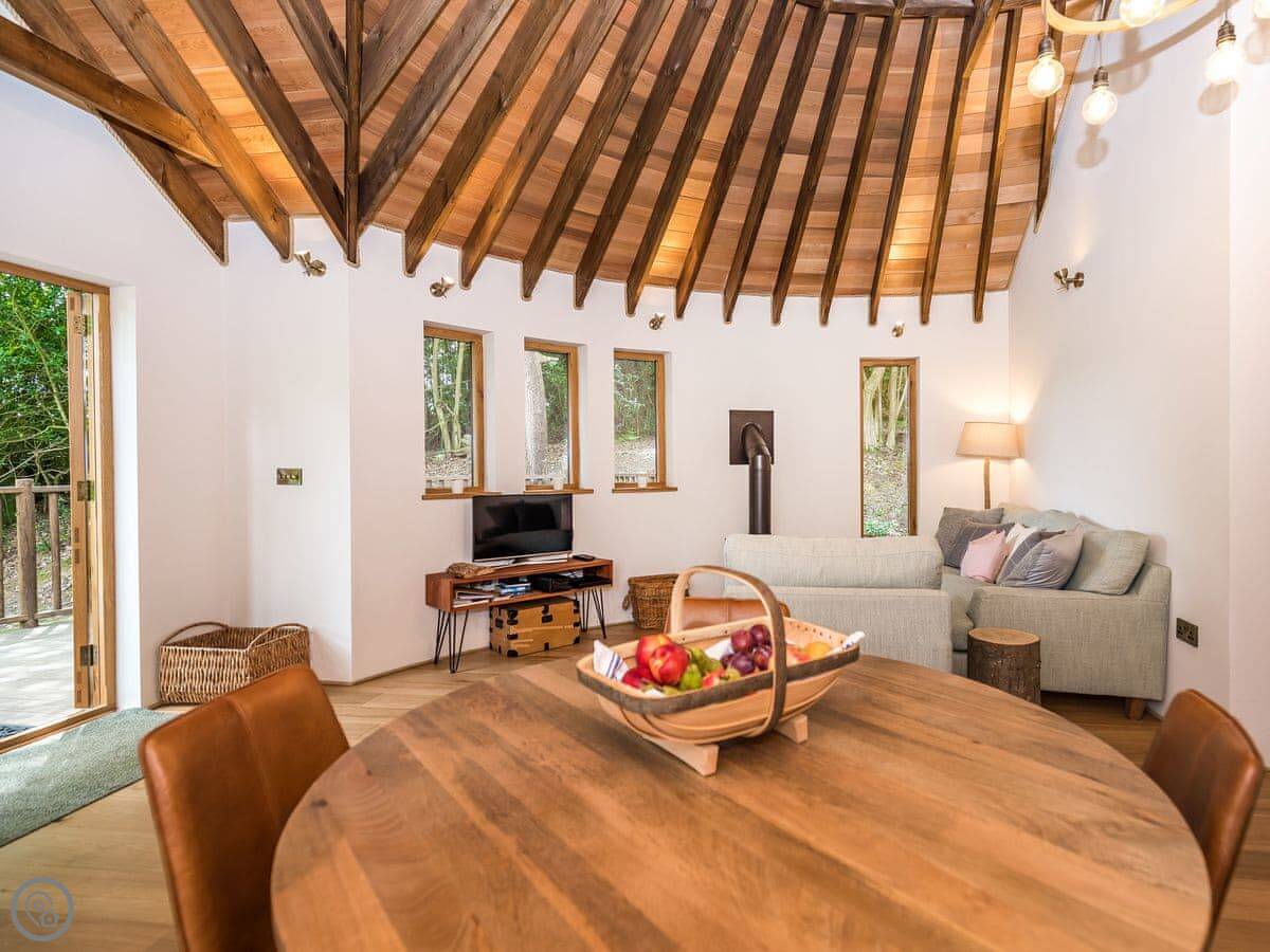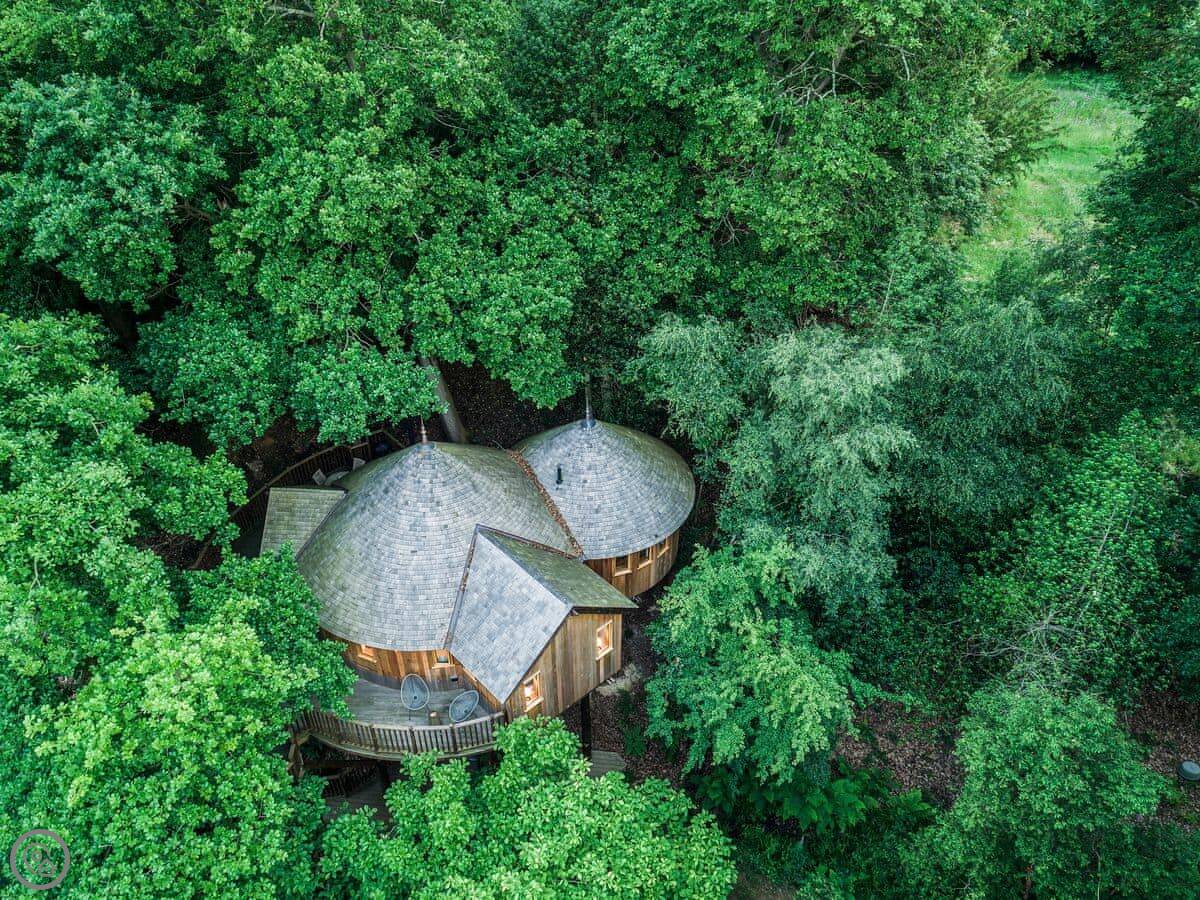 This stunning structure will not disappoint, from the luxurious copper freestanding bath with exquisite views over the 13 acres of grounds with their own woodlands to explore, to the extravagant beamed ceilings that protrude through the building. This magnificent treehouse offers unparalleled style and luxury. There are full facilities available, including two en-suite bathrooms with showers, a fully equipped kitchen, a barbecue and drinks deck at the front, which are heaped in style. No expense has been spared nor detail overlooked. The owners have catered for your every convenience, high above the woodland floor. A spiral staircase helps this treehouse reach new heights in luxury living, with its curved walls, it sits lightly in its environment, the sumptuous cedar cladding blending seamlessly with the well-rooted aged oaks. From the terrace you have exclusive views over the private lakes which surround the treehouse, as well as a bird’s eye view of Sussex clear skied starscapes from your own elevated abode. A stay at The Buzzardry lets you escape to the tranquillity of the treetops, allowing you to stay connected to nature as well as the outside world. The stylish interior is as effective space as it is elegant, and each window provides a framed, living perspective of the beauty of your leafy nest.