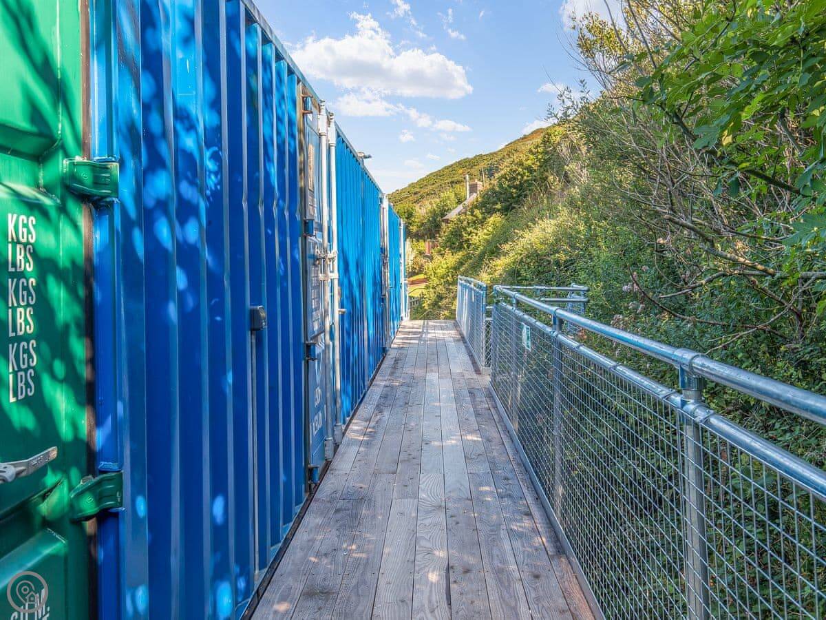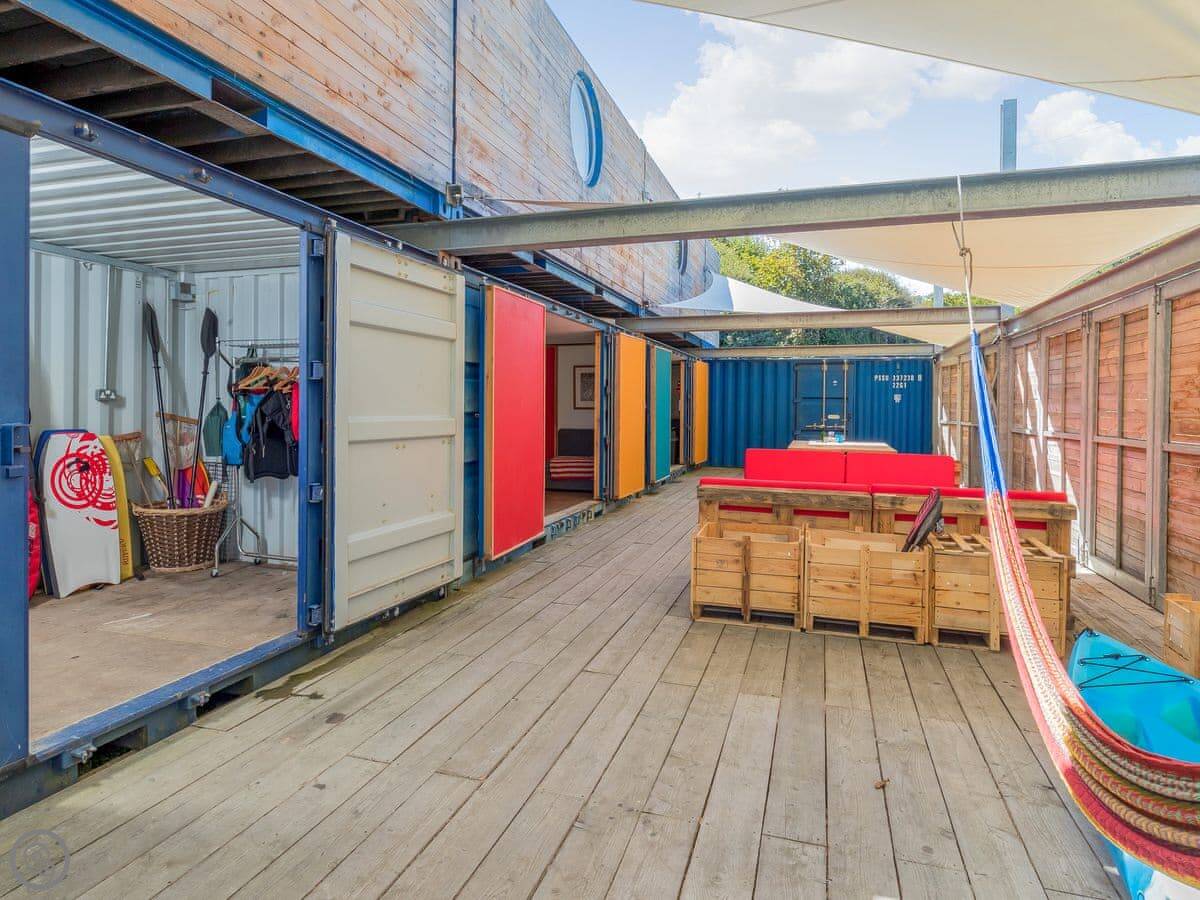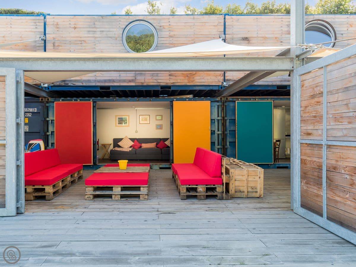 This is Ty Cwch Cabin 2 in Cwmtydu. It's part of a set-up made from shipping containers. That sounds odd, but it works. You get your own private cabin for sleeping, and then you share a big central living space, kitchen, and laundry with the other cabins. There are two shared bathrooms as well.