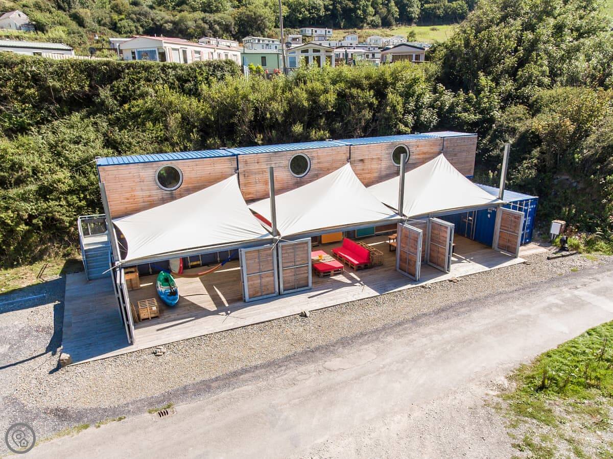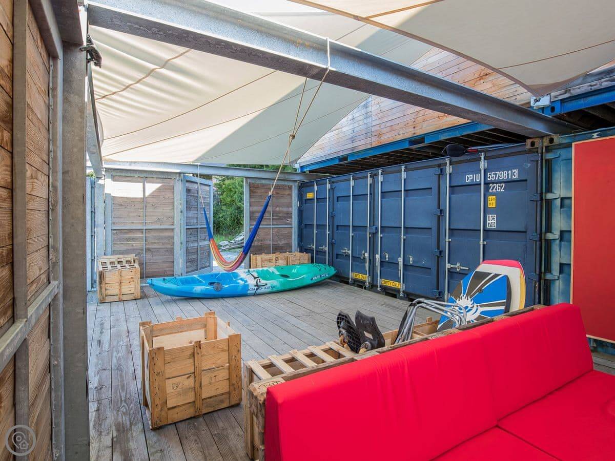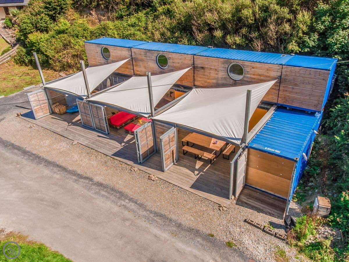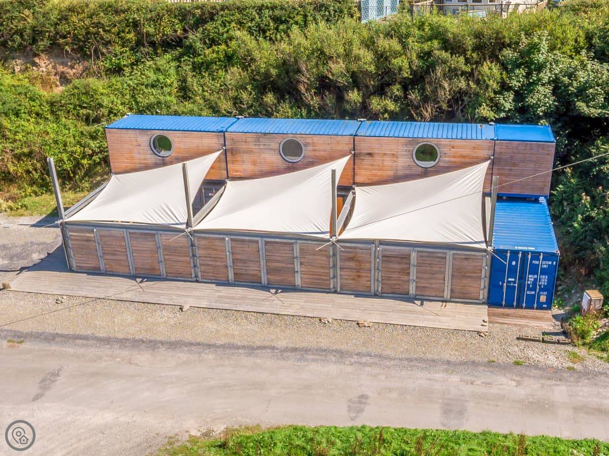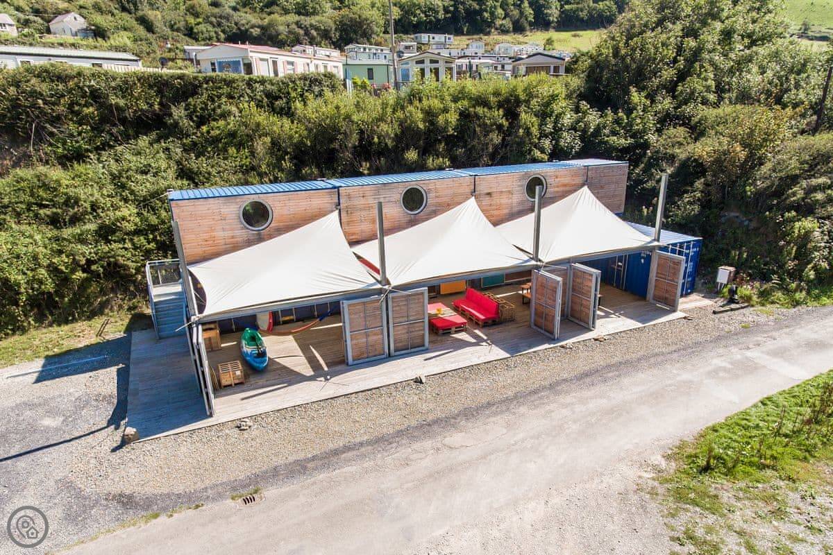 Ty Cwch Cabin 3 is in Cwmtydu in Carmarthenshire. As it says, it's one cabin in a larger setup made from shipping containers. You get your own private sleeping cabin and bathroom, but share some of the other spaces.