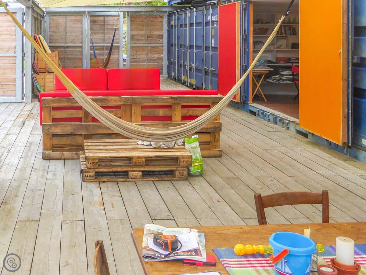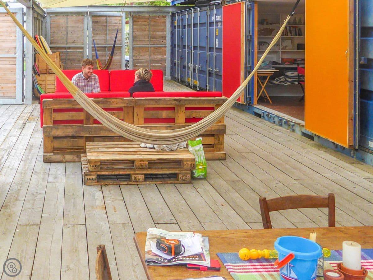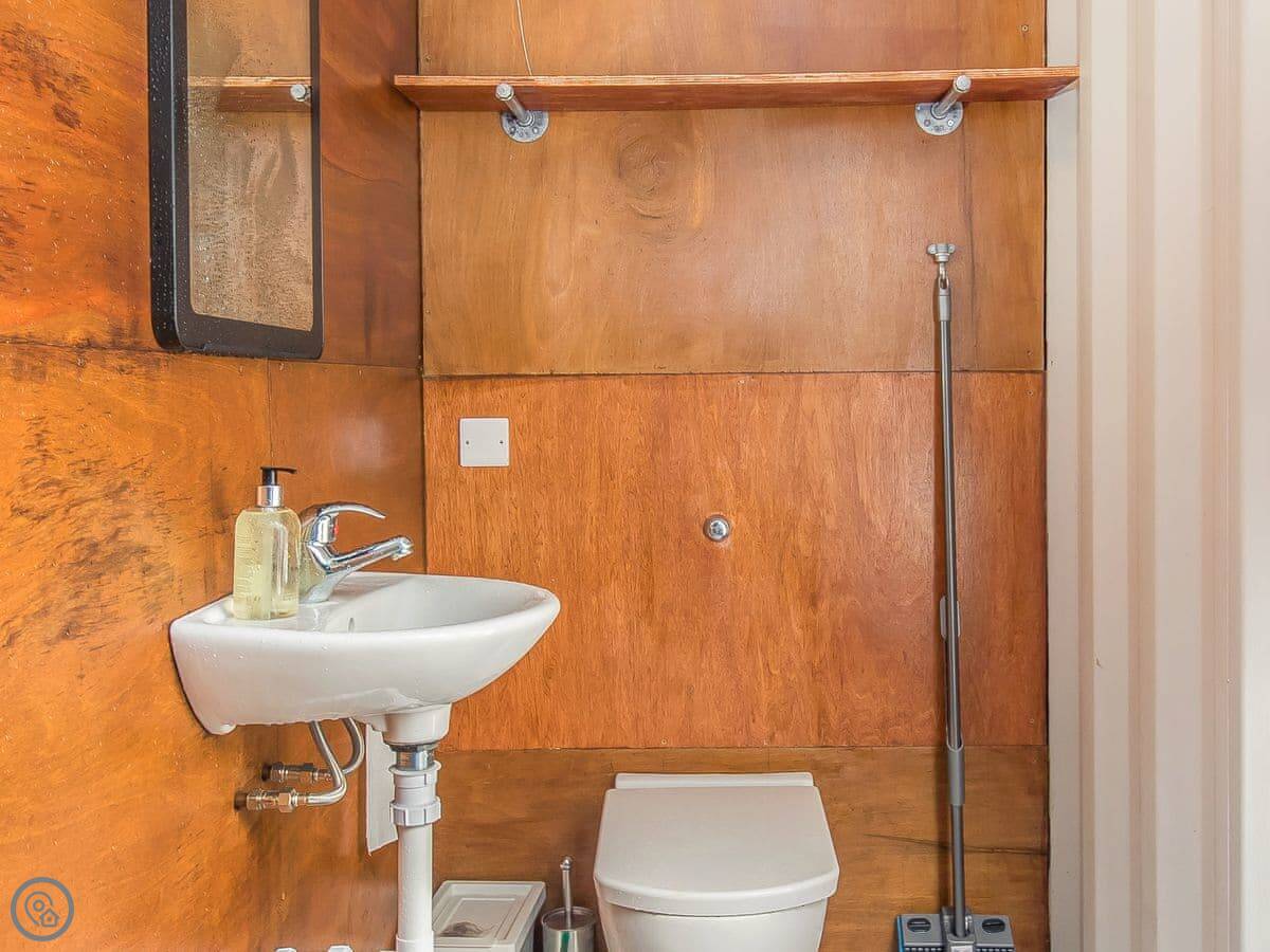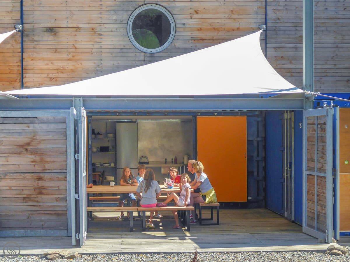 Ty Cwch Cabin 3 is in Cwmtydu in Carmarthenshire. As it says, it's one cabin in a larger setup made from shipping containers. You get your own private sleeping cabin and bathroom, but share some of the other spaces.