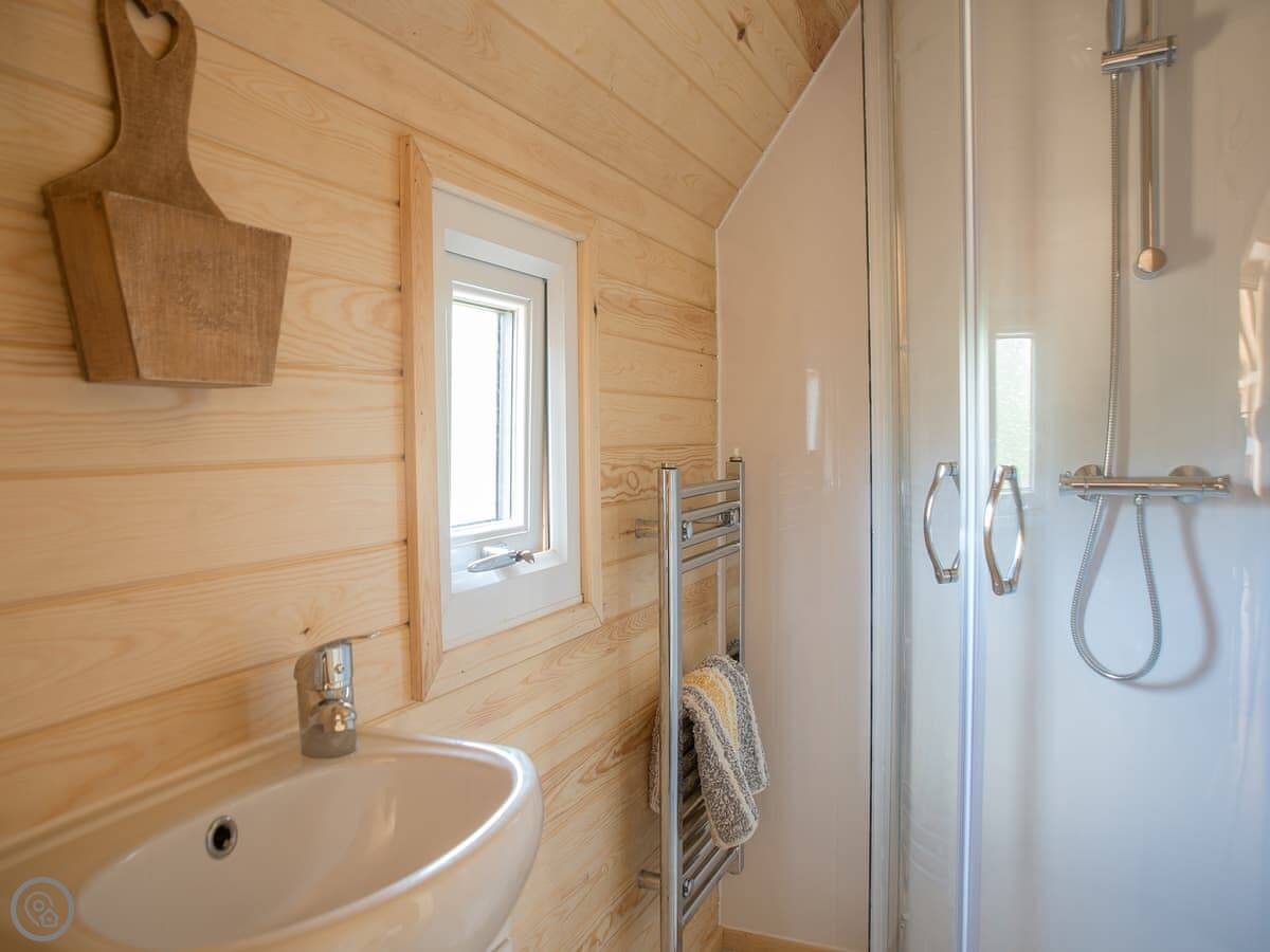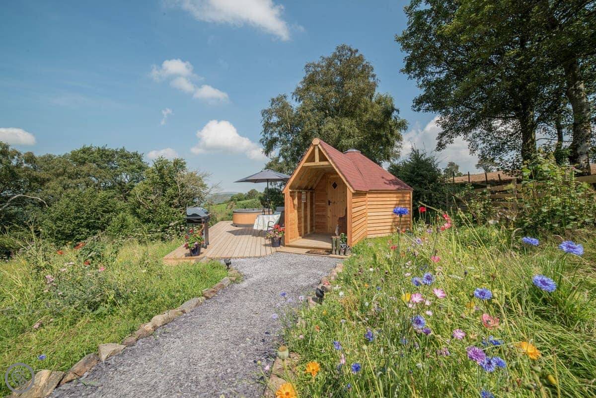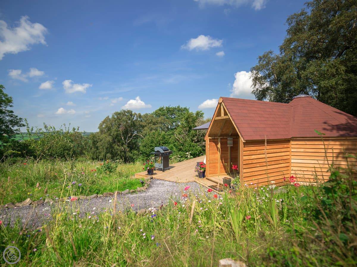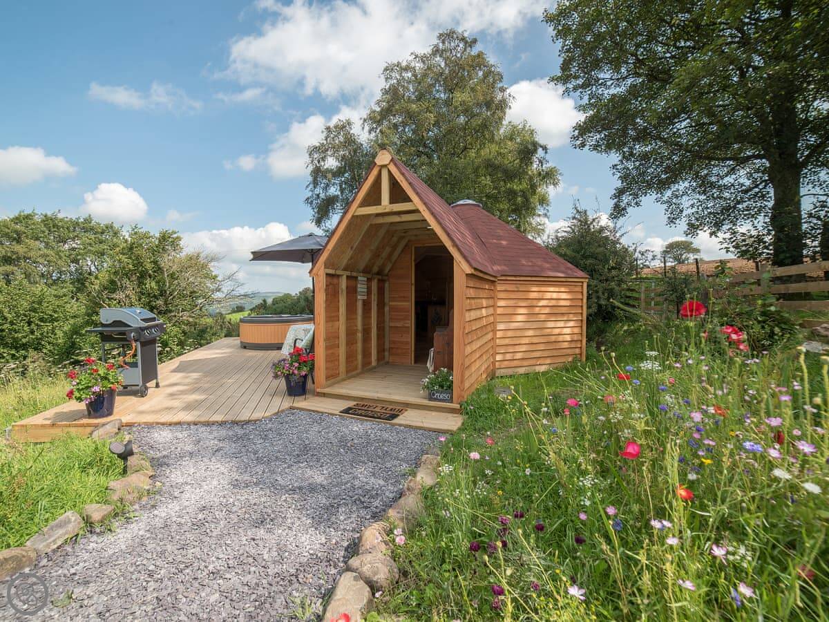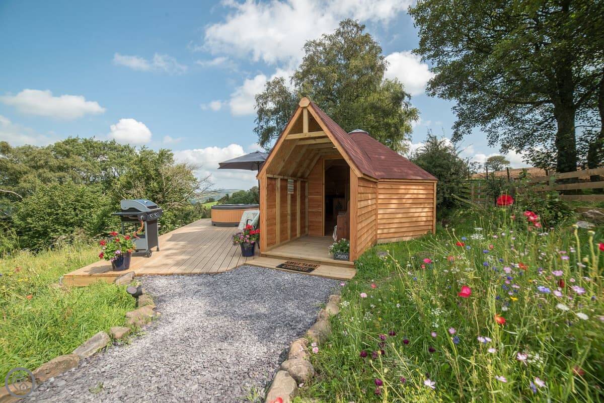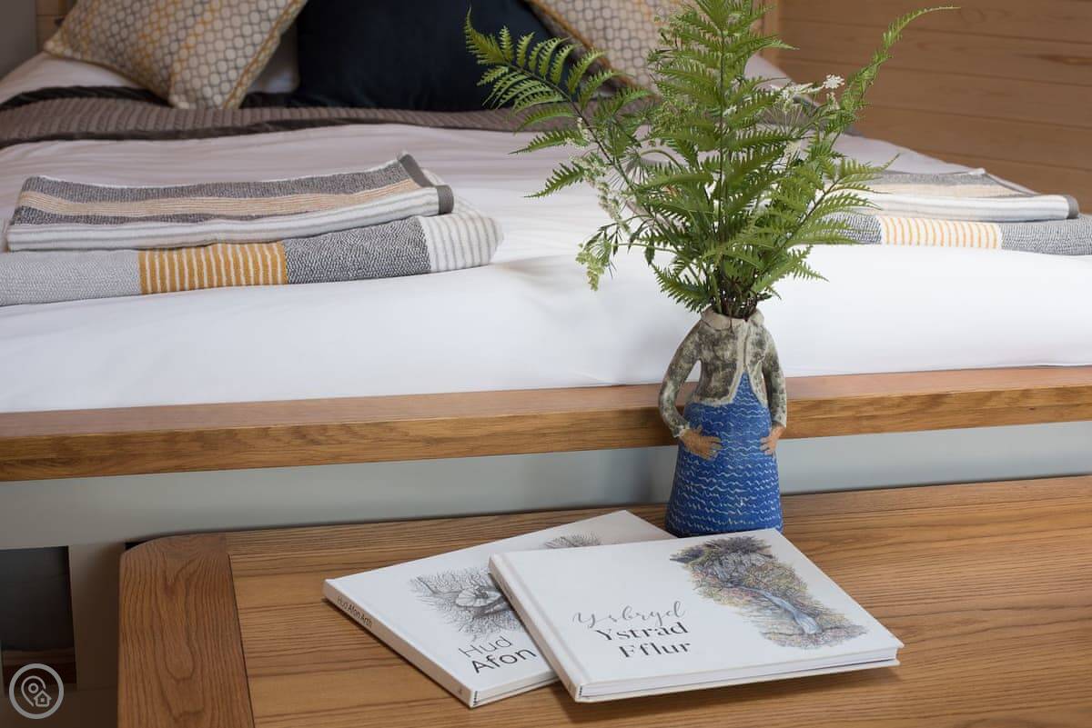 Facilities-wise, everything's included. There's parking right there, bedding and towels are provided, and you've got a shower and a patio with a barbecue. No pets, I'm afraid. It's attached to another cabin called Cwt Celyn, so you could book both together if there were four of you.